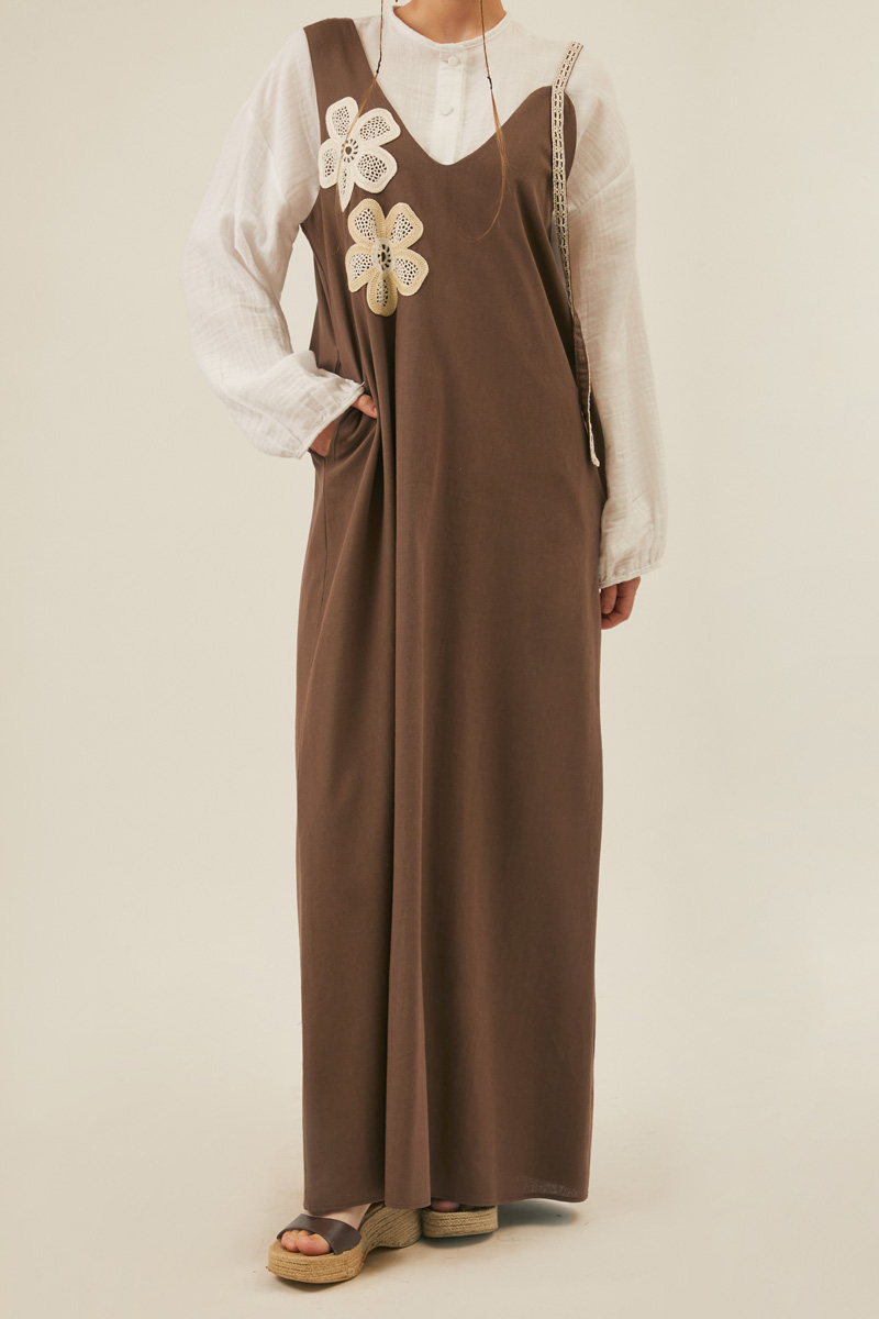 Offering both comfort and elegance, this long, loose-fit sleeveless dress is perfect for layering. The standout feature is the floral appliqués on the chest, crafted with crochet or macramé techniques. One of the thin shoulder straps is adorned with a delicate lace trim running from top to bottom. Made from breathable linen fabric, it keeps you cool even on hot summer days while being gentle on the skin