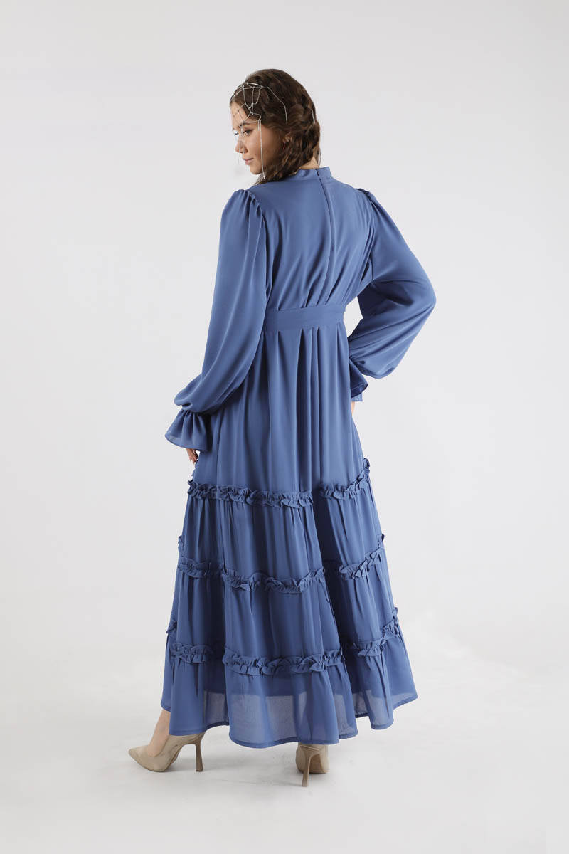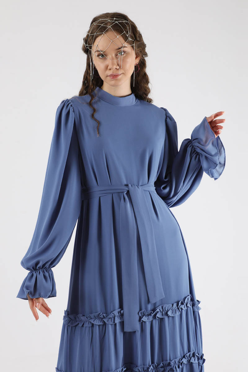 Flowy Frilly Dress Indıgo. The judge is lame. The top of the shoulder is a drawstring detail. The skirt part is ruffled. The cuff is elastic. It has a back zipper. It is lined. You can choose it for your daily use and special occasions.