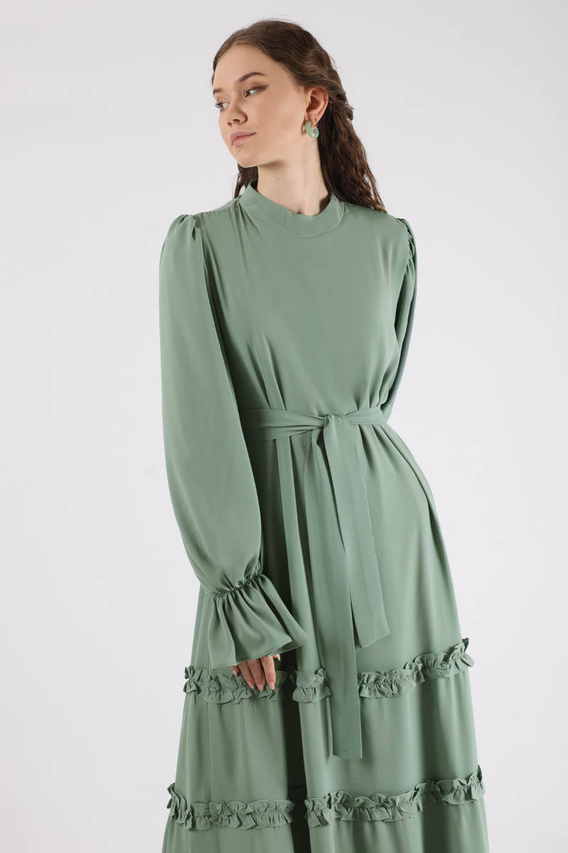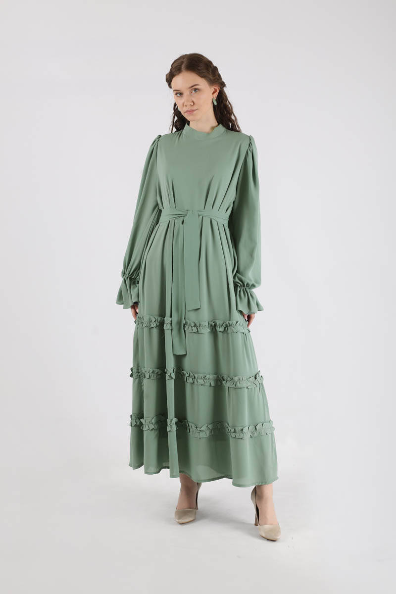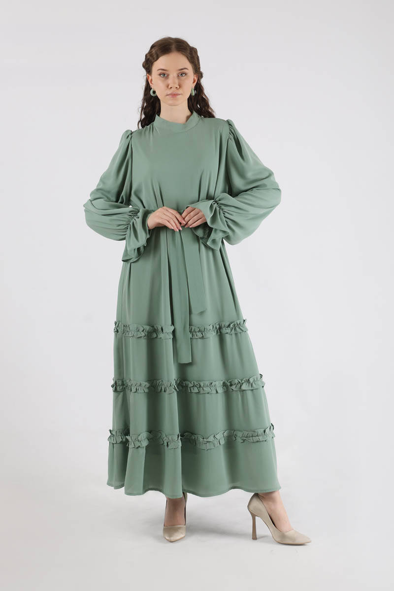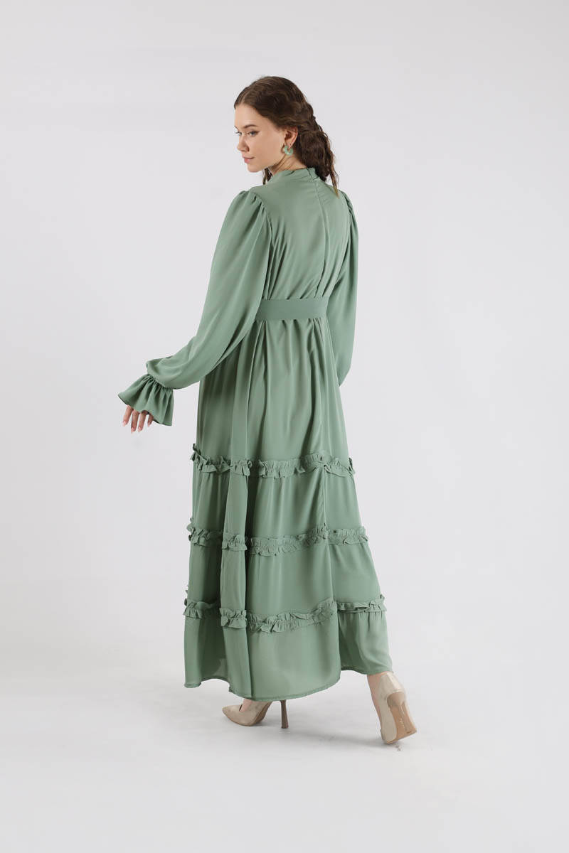 Flowy Frilly Dress Mint. The judge is lame. The top of the shoulder is a drawstring detail. The skirt part is ruffled. The cuff is elastic. It has a back zipper. It is lined. You can choose it for your daily use and special occasions.