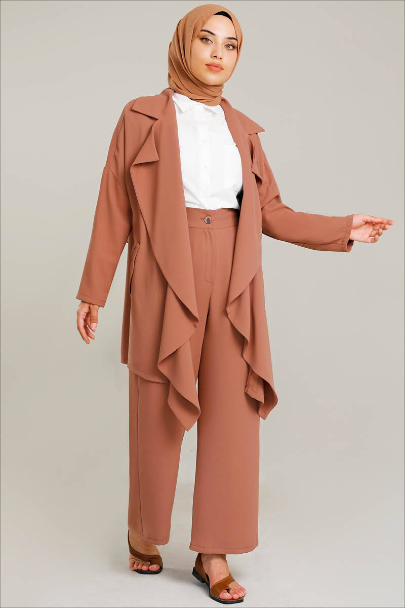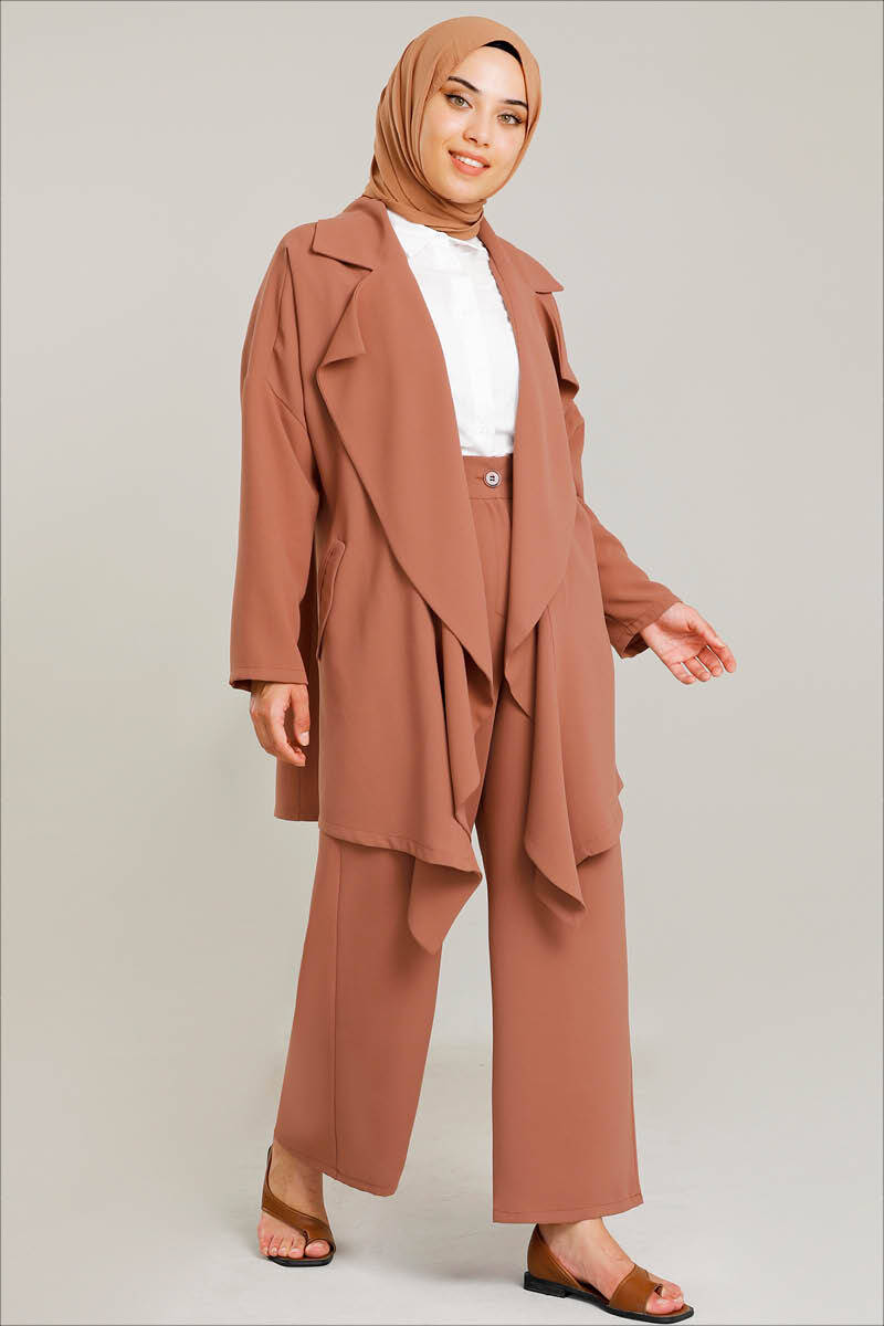Wide draped collar. Low shoulder. The jacket is buttonless. The jacket has pockets on the sides. The trousers must be buttoned. Wide leg trousers. It is full mold. It is a cottage.