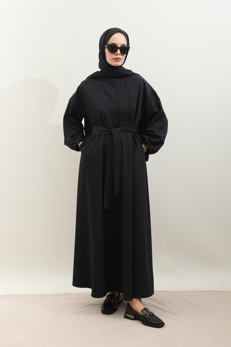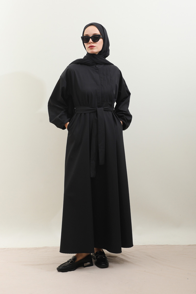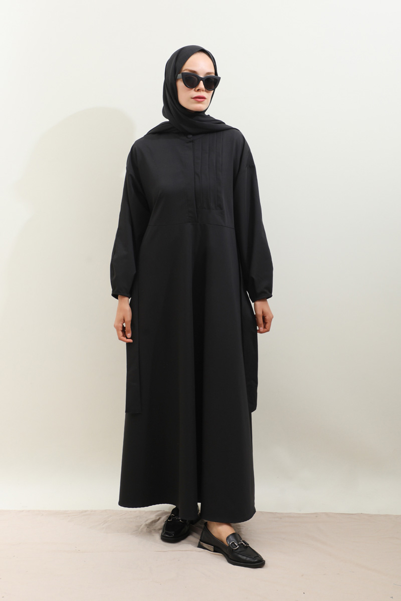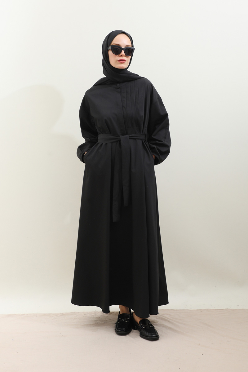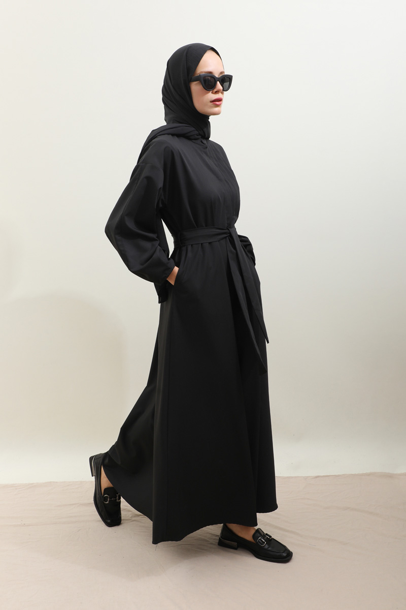 Asimetrik Nervür Detaylı Elbise Siyah. Önden yarım düğmelidir, yaka düğmesi kaplama düğmeli olup diğer iki düğmeside gizlidir. Göğüsün sol ön kısmı nervür detaylıdır, hakim yakalıdır, kuşaklıdır, ceplidir, astarsızdır. Kol ağzı dar biye kapama olup biye detaylıdır. Günlük kullanım ve özel günlerinizde tercih edebilirsiniz.