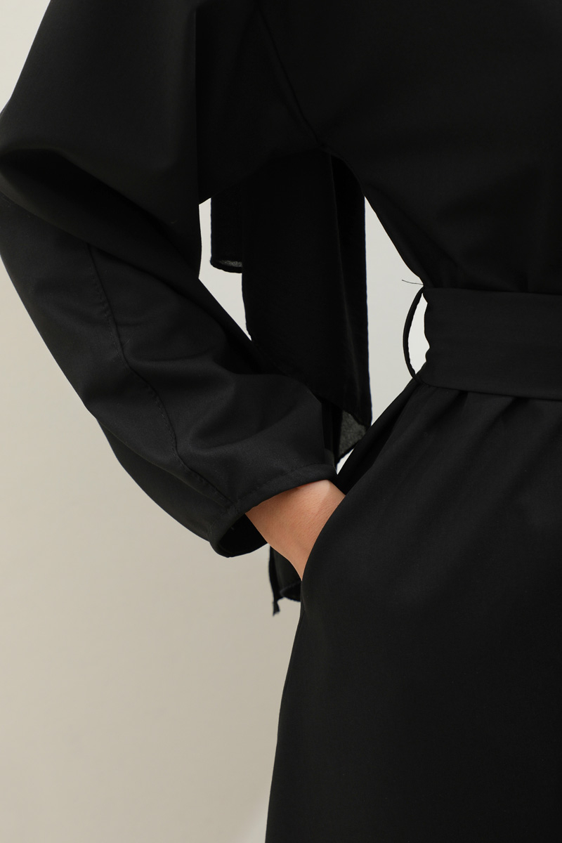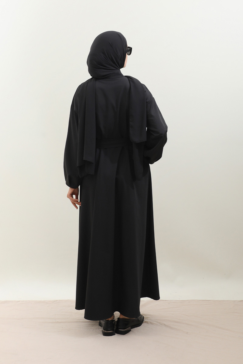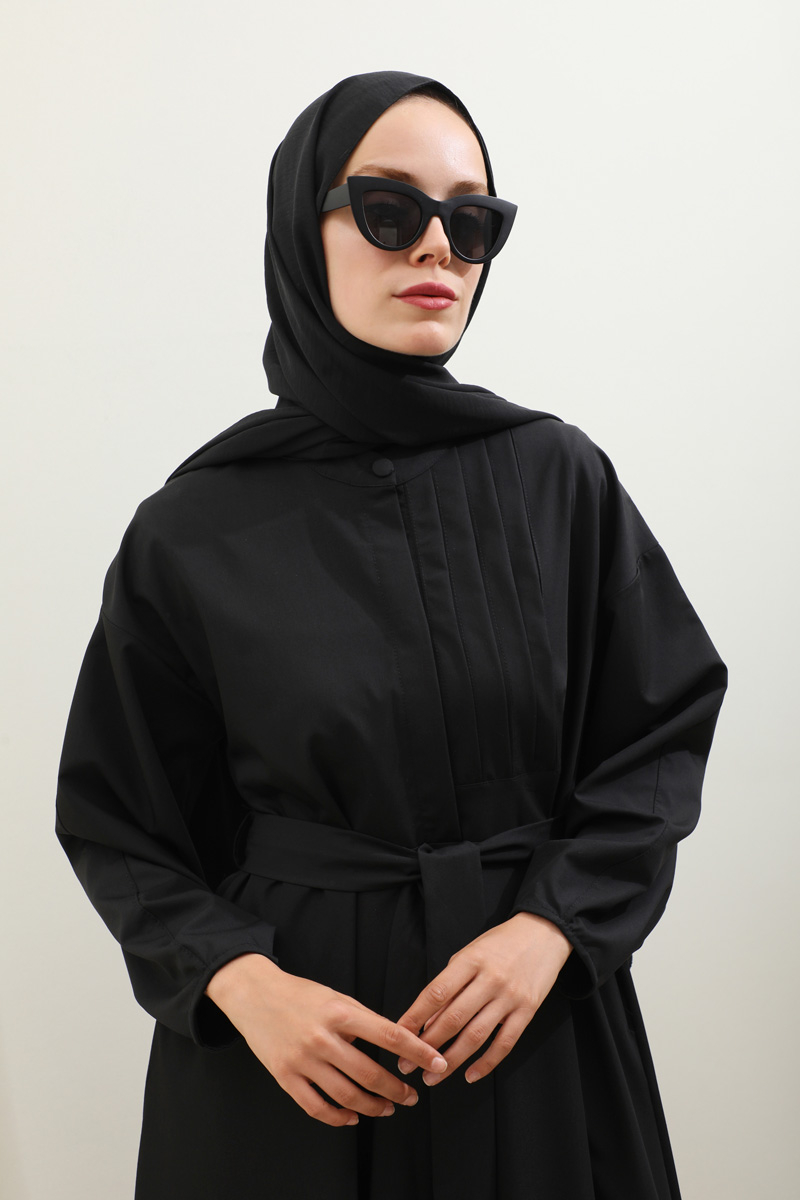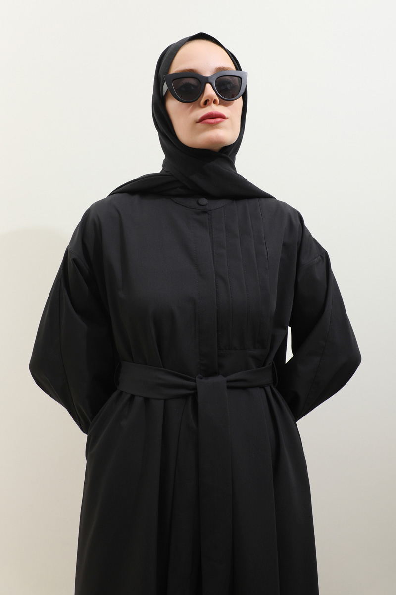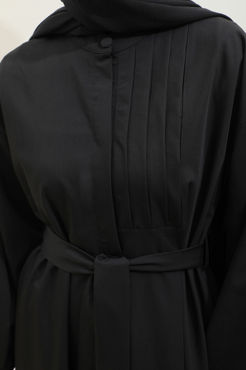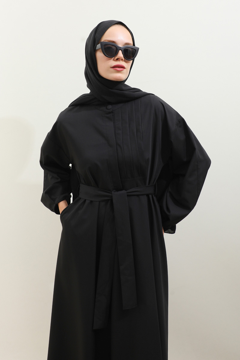 Asimetrik Nervür Detaylı Elbise Siyah. Önden yarım düğmelidir, yaka düğmesi kaplama düğmeli olup diğer iki düğmeside gizlidir. Göğüsün sol ön kısmı nervür detaylıdır, hakim yakalıdır, kuşaklıdır, ceplidir, astarsızdır. Kol ağzı dar biye kapama olup biye detaylıdır. Günlük kullanım ve özel günlerinizde tercih edebilirsiniz.