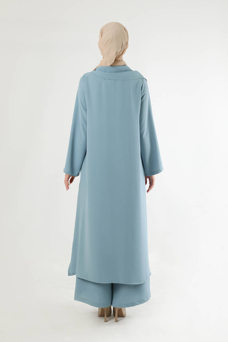 Fularlı Abaya Takım Bebe Mavisi. Abaya yırtmaç detaylıdır. Pantolon beli lastiklidir. Pantolon bol paçadır. Şal yakalıdır. Yakada boncuk ve toka detayı mevcyttur. Üçlü takım olarak satılmaktadır. Günlük kullanım ve özel günlerinizde tercih edebilirsiniz.