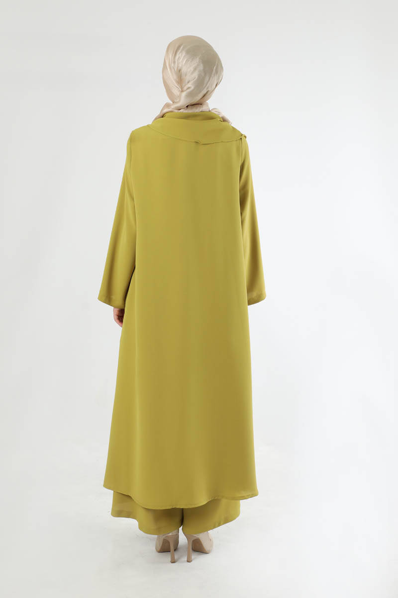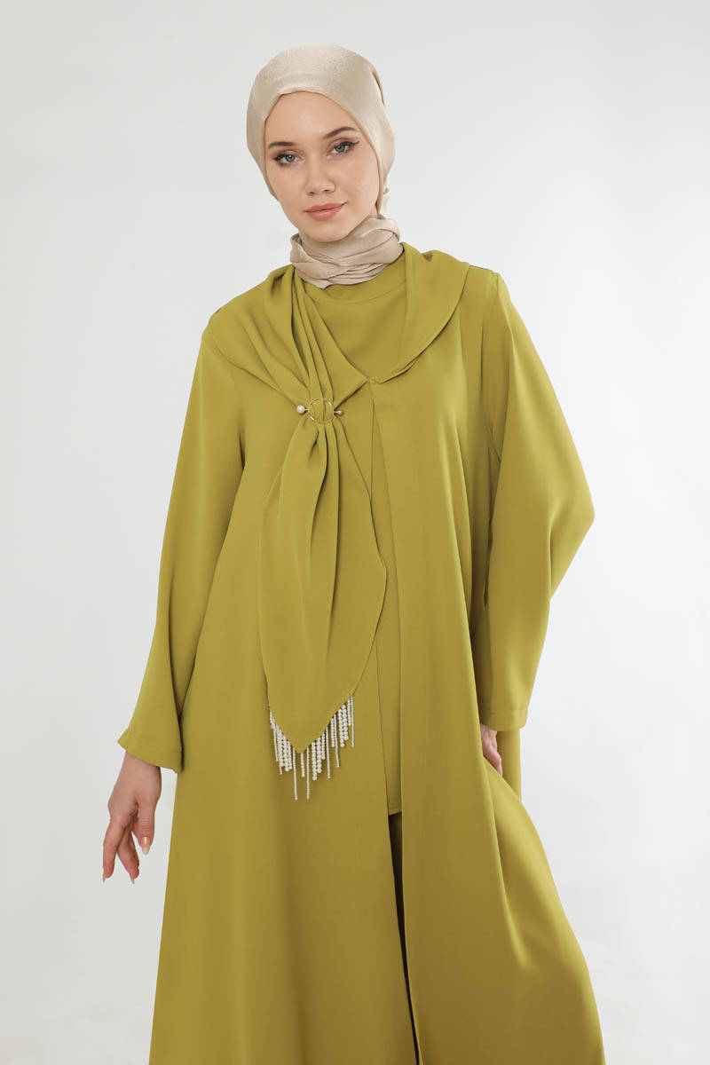 Fularlı Abaya Takım Yağ Yeşili. Abaya yırtmaç detaylıdır. Pantolon beli lastiklidir. Pantolon bol paçadır. Şal yakalıdır. Yakada boncuk ve toka detayı mevcyttur. Üçlü takım olarak satılmaktadır. Günlük kullanım ve özel günlerinizde tercih edebilirsiniz.