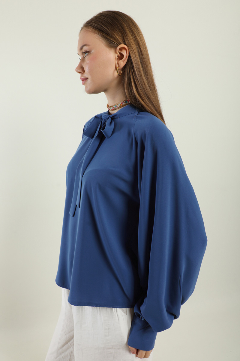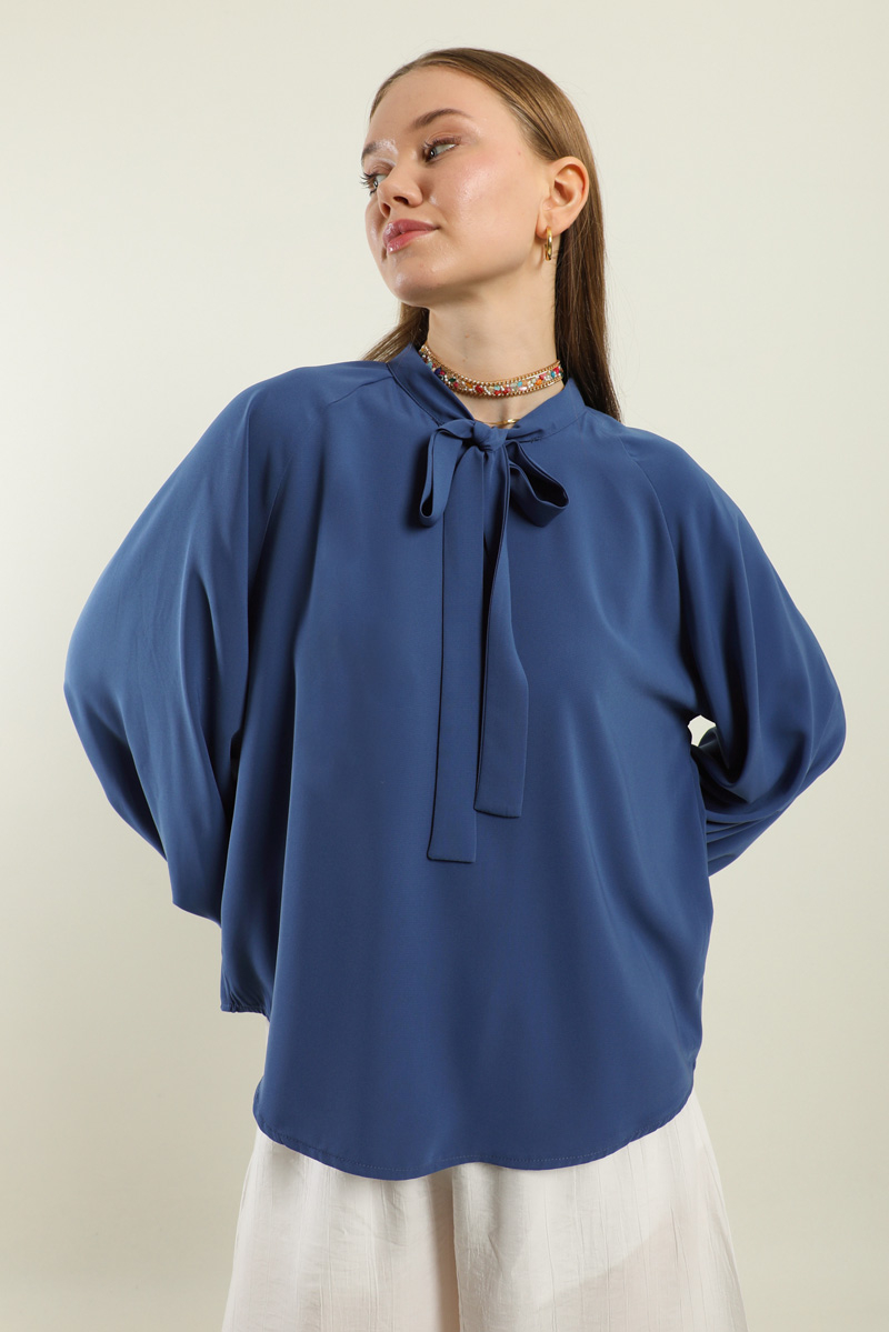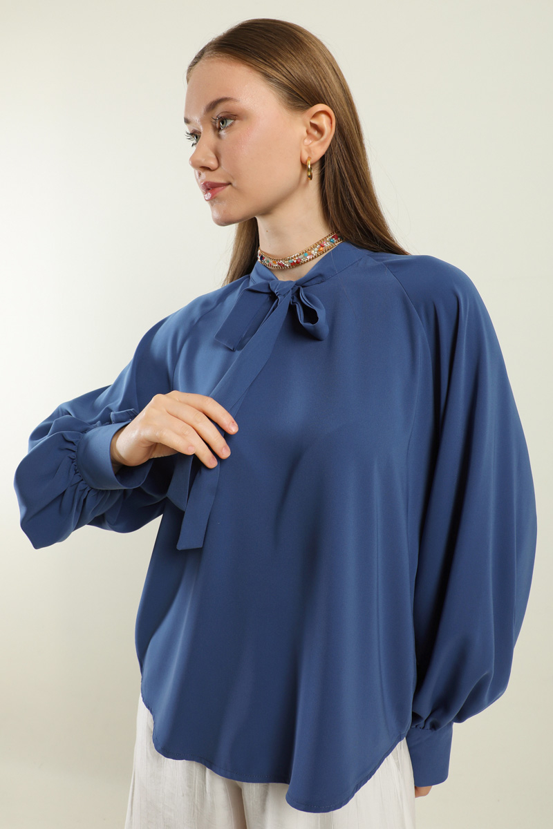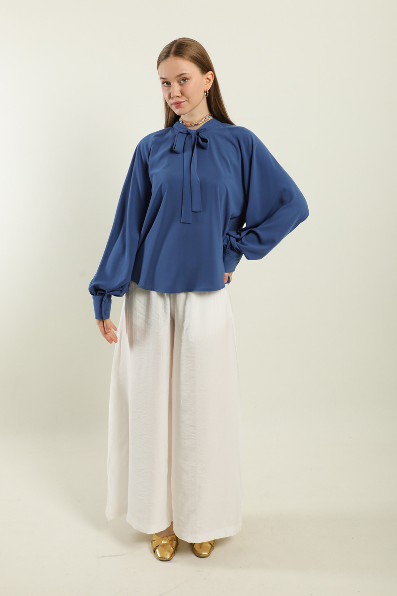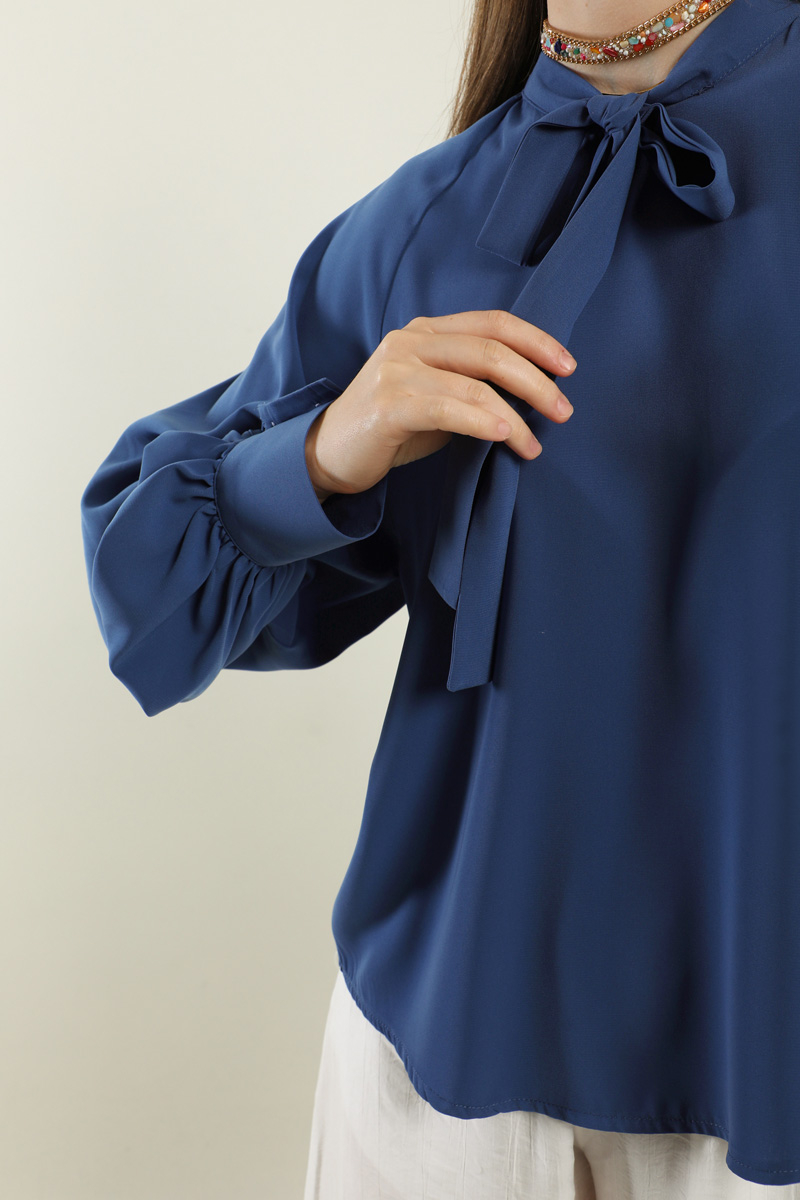 Fularlı Gömlek İndigo. Yaka kısmı fularlıdır, arkadan fermuarlıdır, kolları büzgülüdür, kol manşeti kaılındır, günlük ve özel günlerde kullanıma uygundur, etek ve pantolon üstü kombinlerinizde tercih edebilirsiniz.