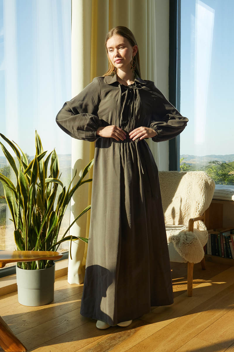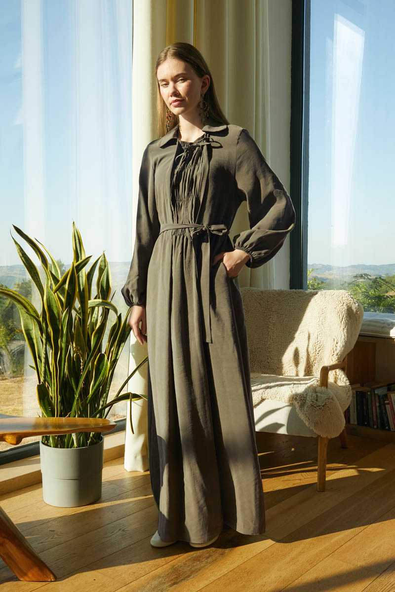 The gathered and tie detail at the neckline creates a modern and feminine look, while the elastic gathering adds a unique touch to the dress. This versatile piece is easy to style for both everyday wear and special occasions.