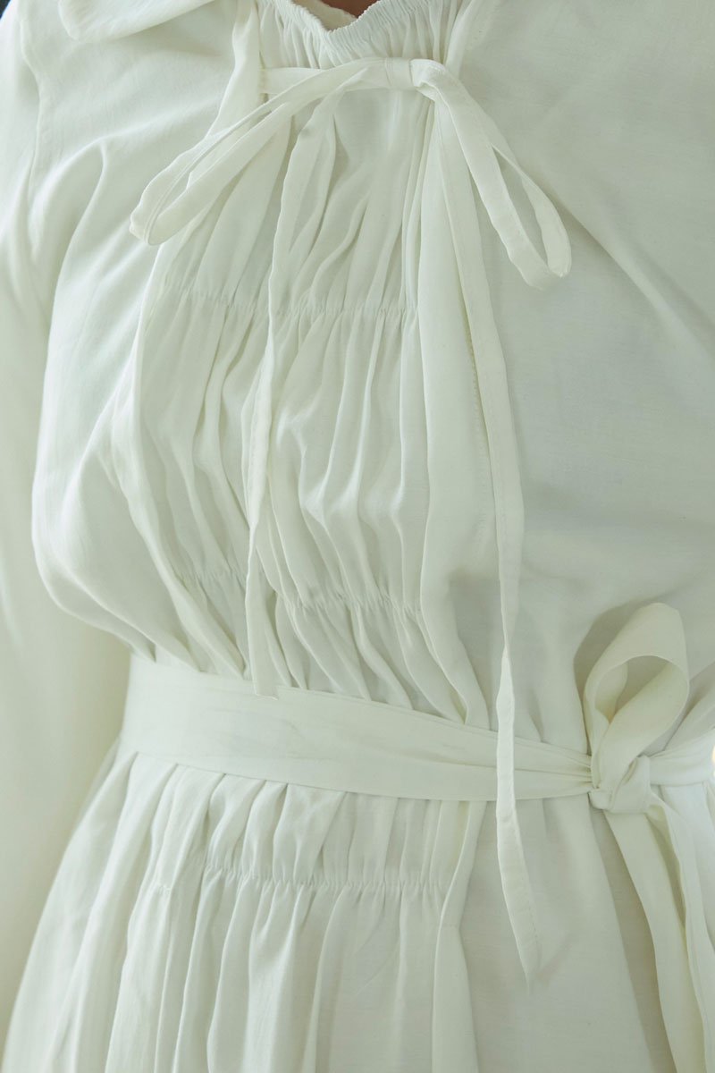 Fulya Elbise Beyaz, Yaka kısmındaki büzgü ve bağlama detayı ile modern ve feminen bir görünüm kazanırken, lastik büzgü detayı elbiseye farklı imaj oluşturmaktadır. Günlük kullanımda veya özel anlarınızda kolayca kombinleyebileceğiniz çok yönlü bir parçadır.