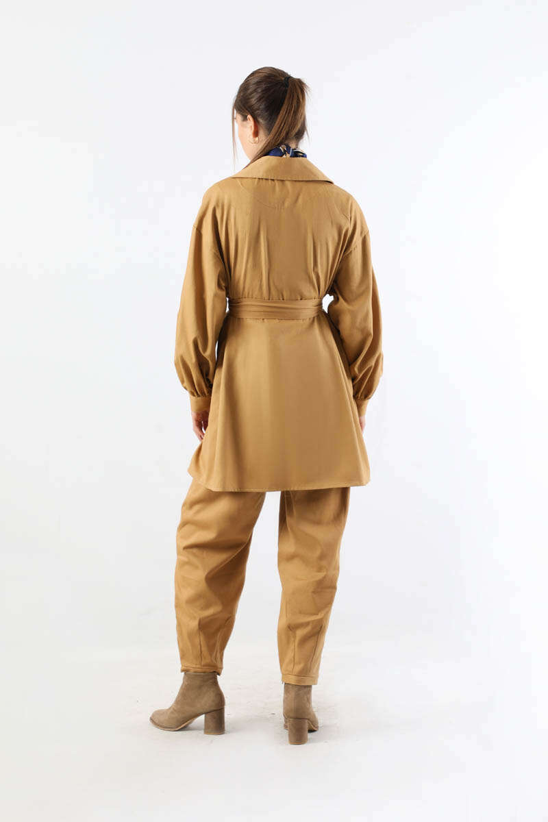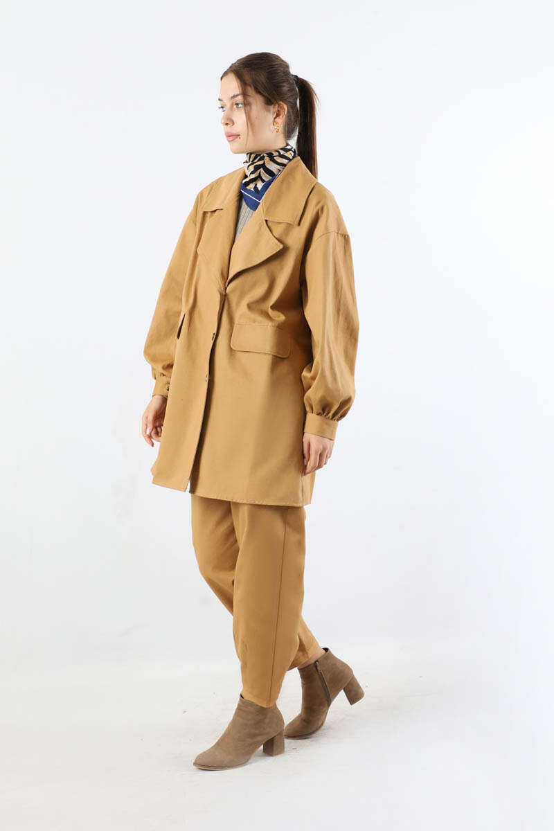 Gabardin Ceket Takım Camel. Ceket yakalıdır. Düşük omuzludur. Manşeti düğmelidir. Pantolon beli lastiklidir. Pantolon paçası pens detaylıdır. Kuşaklıdır. Günlük kullanım ve özel günlerinizde tercih edebilirsiniz.