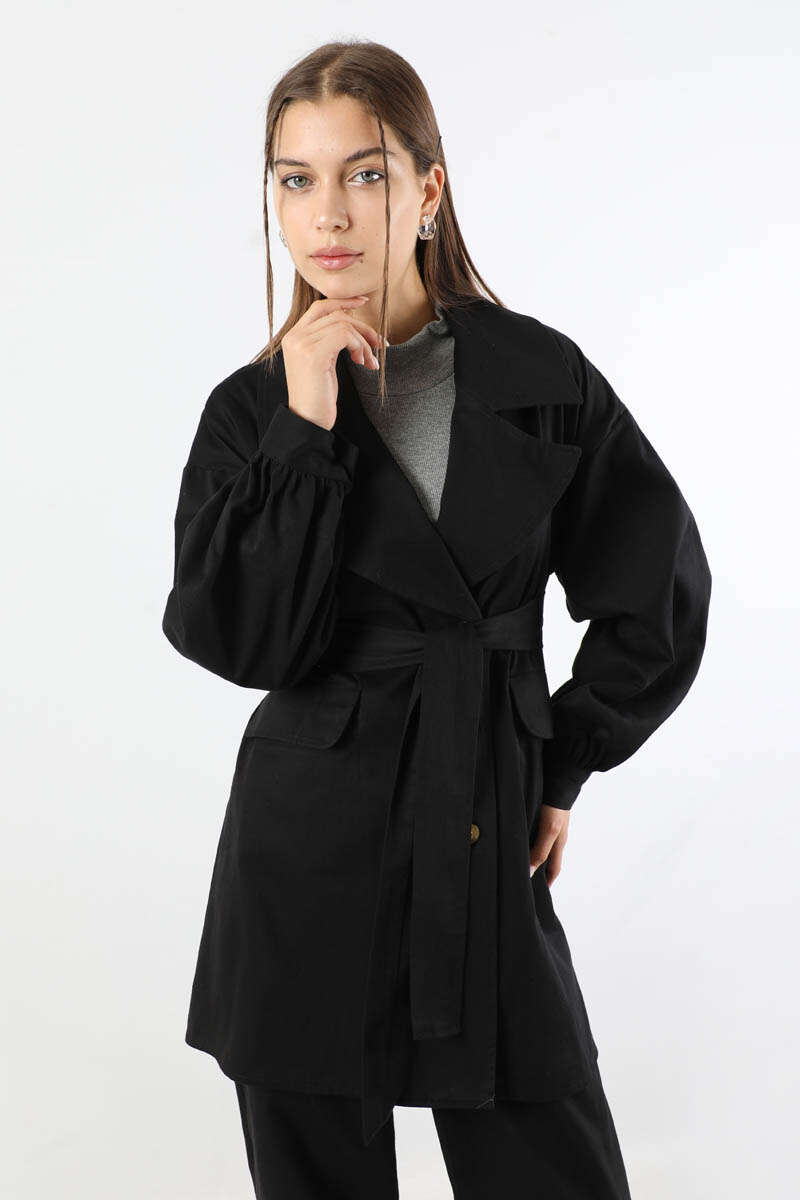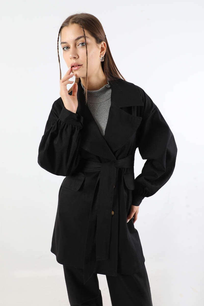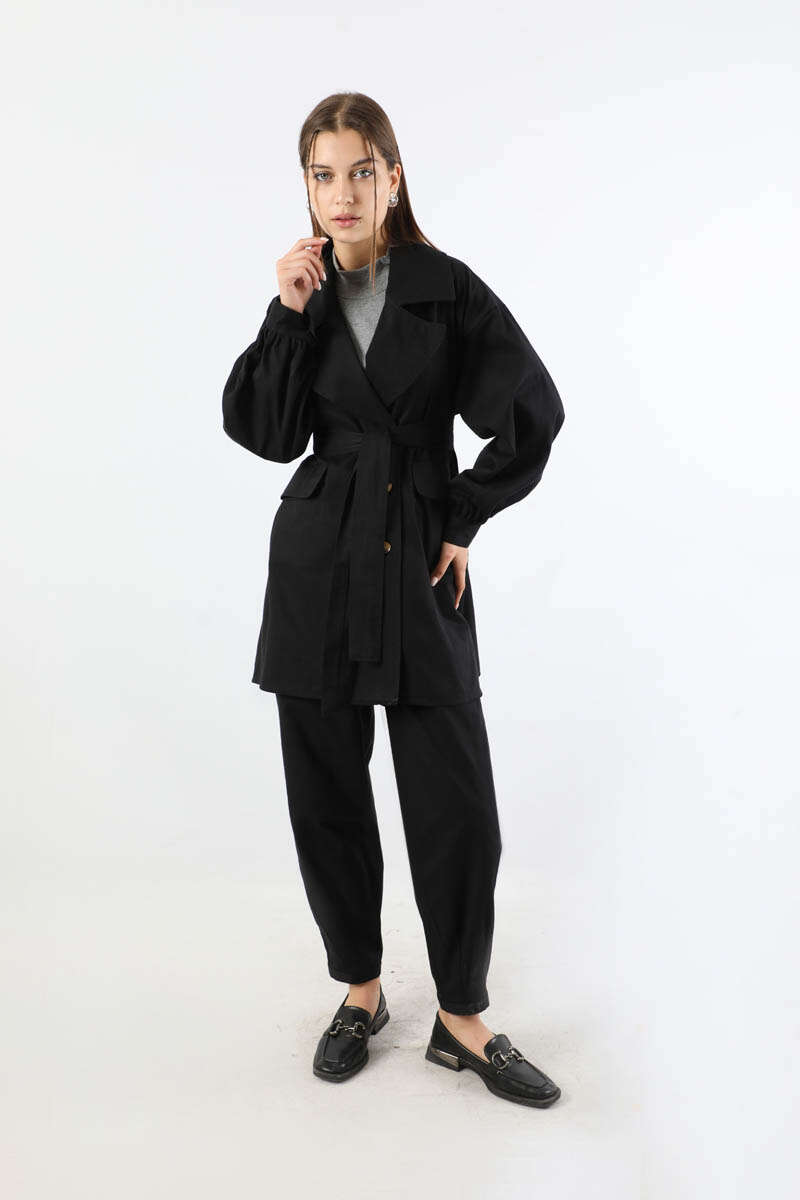 Gabardin Ceket Takım Siyah. Ceket yakalıdır. Düşük omuzludur. Manşeti düğmelidir. Pantolon beli lastiklidir. Pantolon paçası pens detaylıdır. Kuşaklıdır. Günlük kullanım ve özel günlerinizde tercih edebilirsiniz.