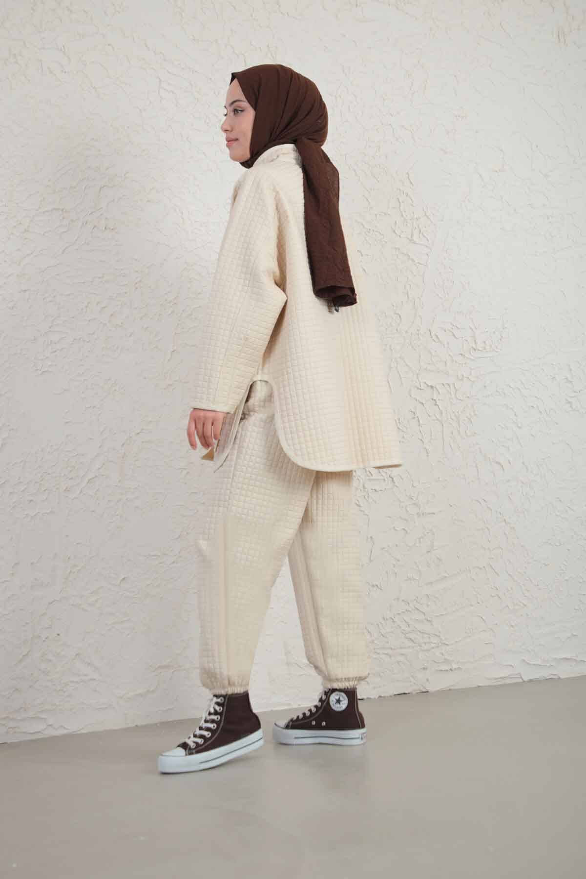 Garnili Kapitone Takım Bej. Dik yakadır. Önden gizli düğmelidir. Pantolon beli lastiklidir. Pantolonda ve tunikte cep mevcuttur.