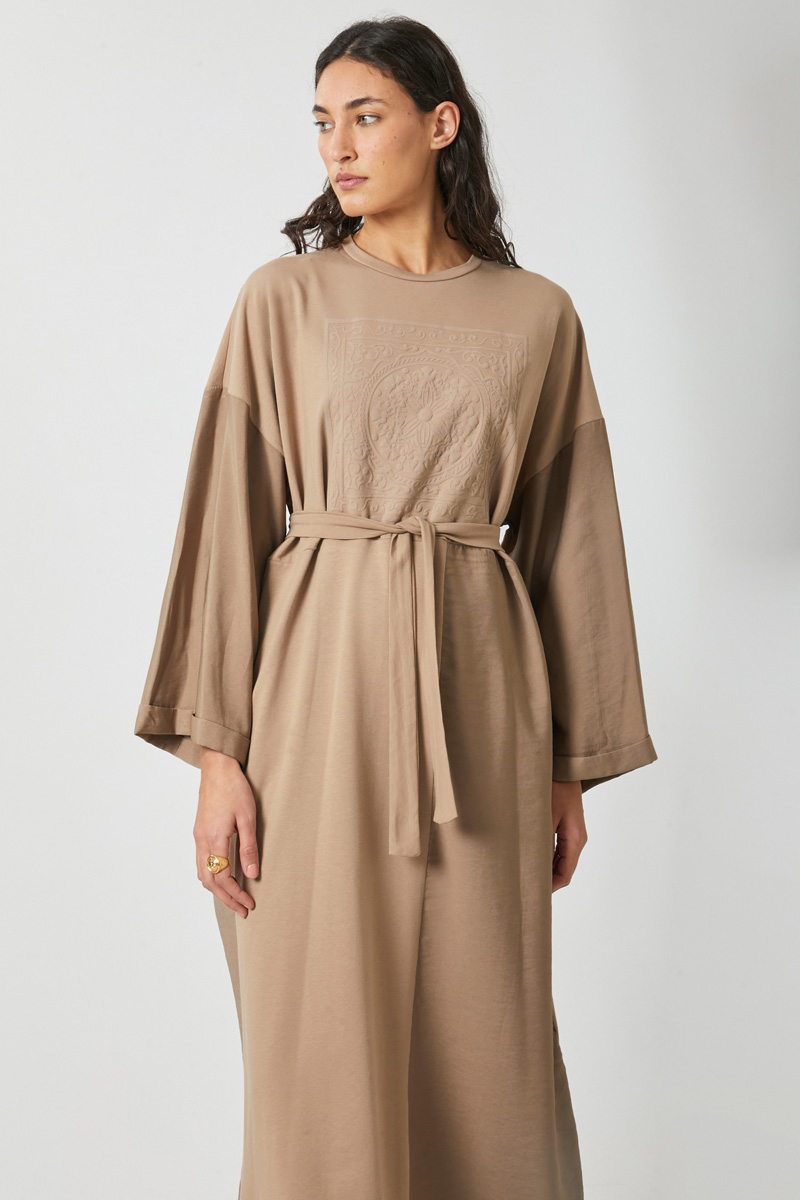 Garnili Sweat Elbise Camel. Bisiklet yakadır, düşük omuzludur, kabartma baskı desenlidir, geniş kolludur, manşeti katlamalıdır, garnilldir, yandan ceplidir, kuşaklıdır, astarsızdır. Günlük kullanımda tercih edebilirsiniz.