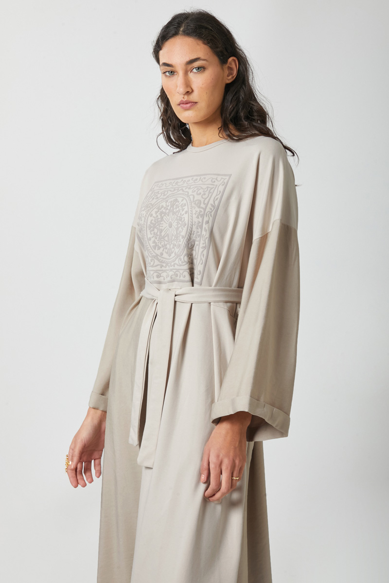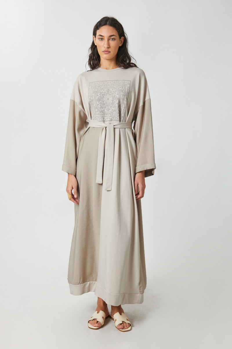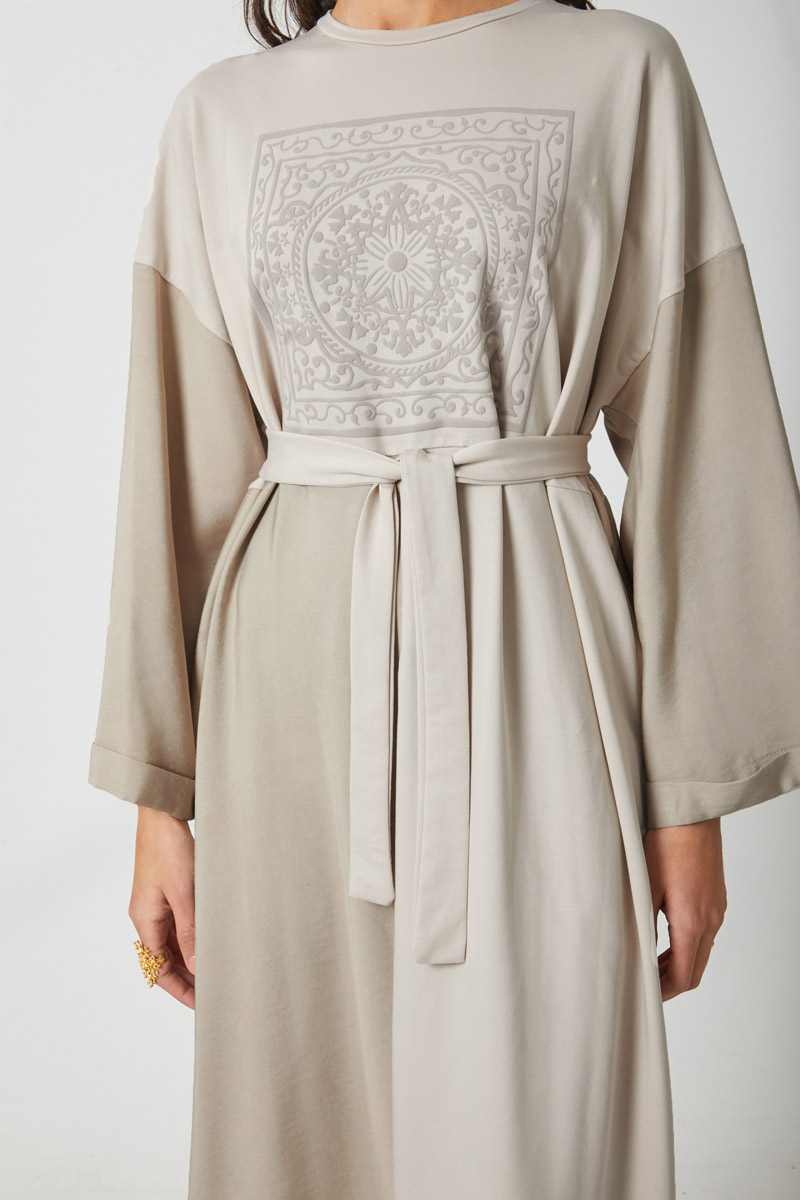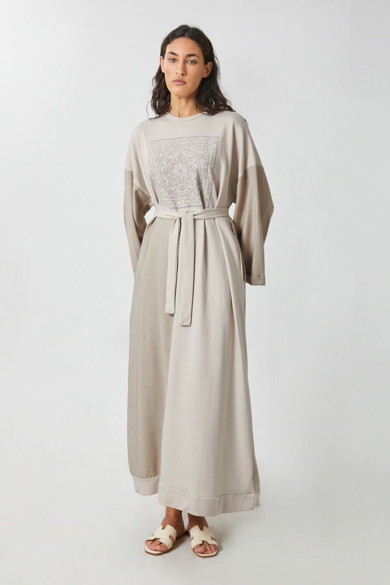 Garnili Sweat Elbise Taş. Bisiklet yakadır, düşük omuzludur, kabartma baskı desenlidir, geniş kolludur, manşeti katlamalıdır, garnilldir, yandan ceplidir, kuşaklıdır, astarsızdır. Günlük kullanımda tercih edebilirsiniz.