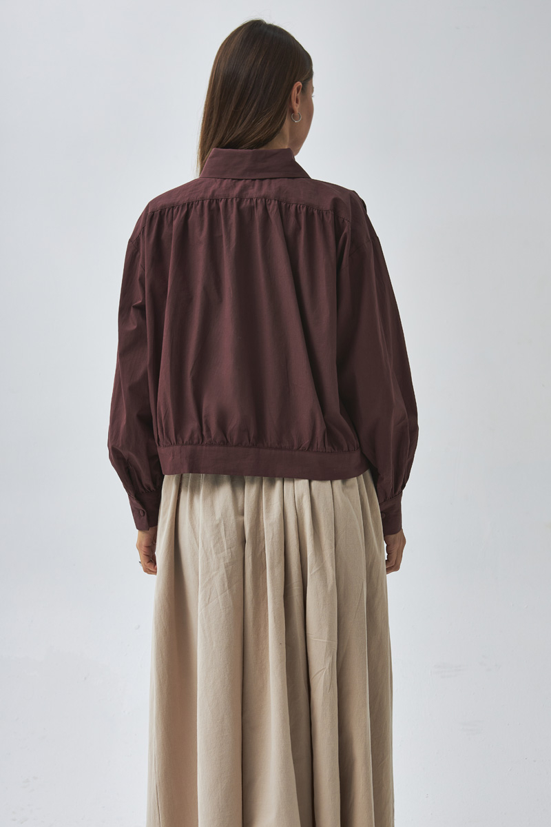 Gathered Shoulder Poplin Shirt Burgundy, With its modern and elegant design, this shirt is a key piece for both everyday and sophisticated outfits. The gathered detail at the shoulders adds a feminine touch, while the poplin fabric ensures comfort throughout the day. Thanks to its short and relaxed cut, it can be easily paired with both skirts and trousers for a versatile, stylish look.