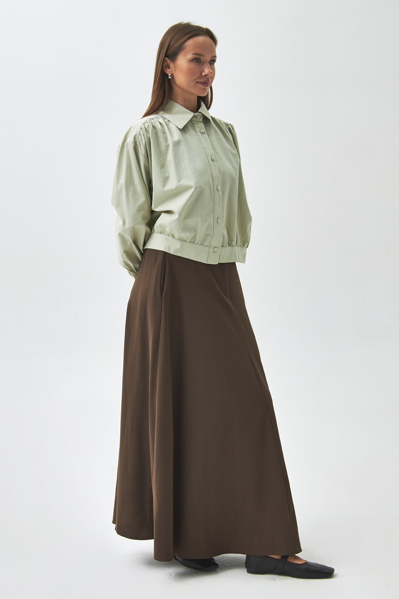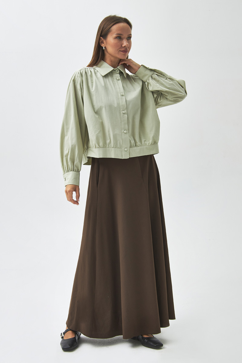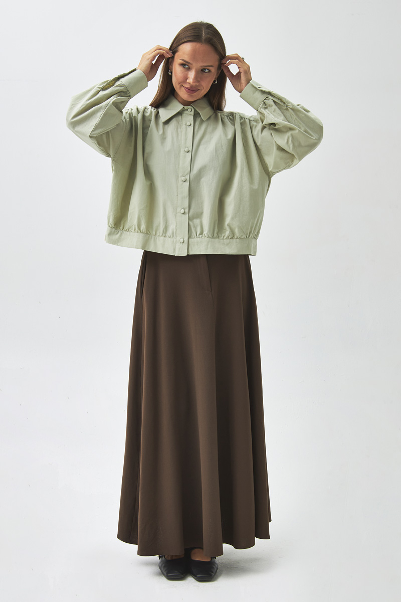 Gathered Shoulder Poplin Shirt Light Green With its modern and elegant design, this shirt is a key piece for both everyday and sophisticated outfits. The gathered detail at the shoulders adds a feminine touch, while the poplin fabric ensures comfort throughout the day. Thanks to its short and relaxed cut, it can be easily paired with both skirts and trousers for a versatile, stylish look.