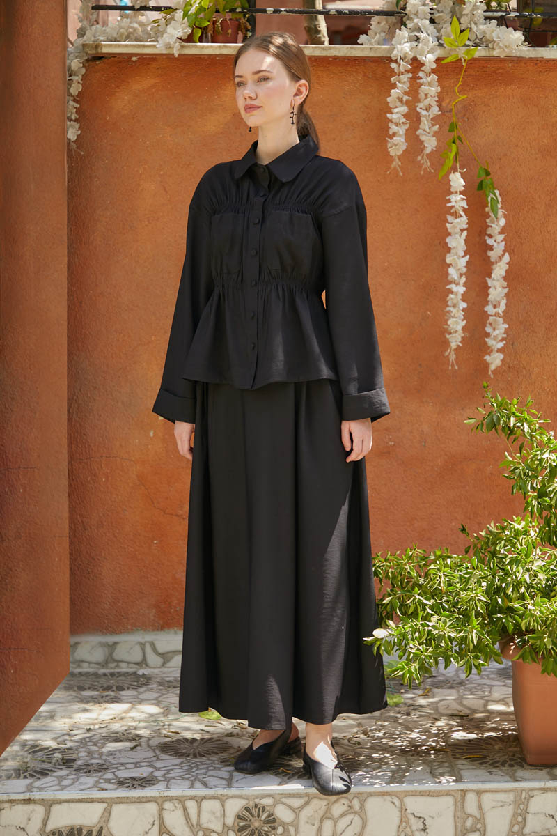The skirt features cup seam details at the waist, a gathered structure, and an elastic back waistband. It has a hidden side zipper, functional pockets, and is unlined.