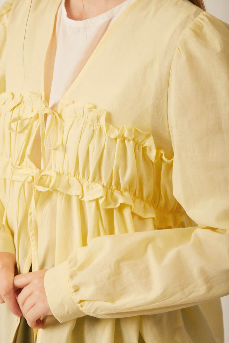 The V-neck adds an elegant touch to the neckline, while the gathered and ruffle details on the chest and waist give the blouse a lively and feminine look. With long sleeves and adjustable tie details, it is both stylish and practical.