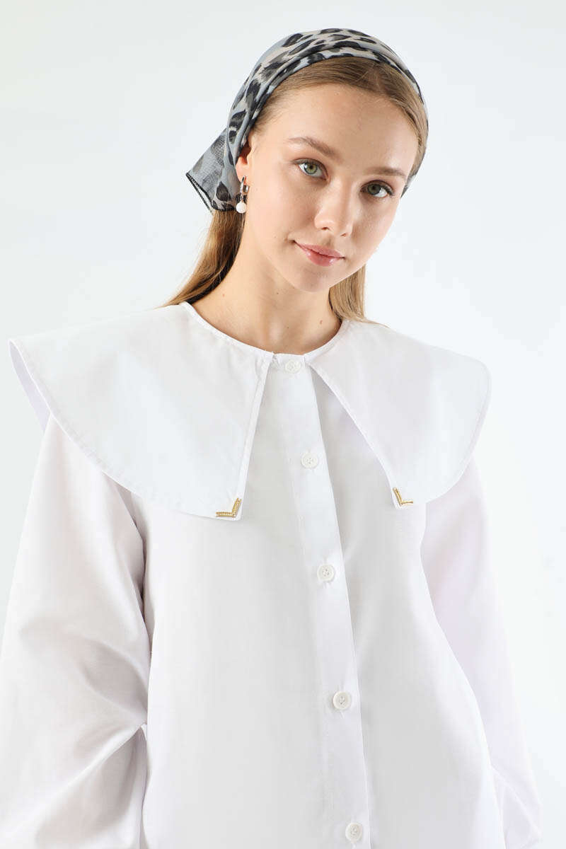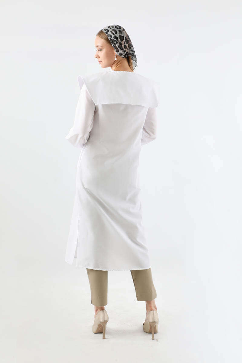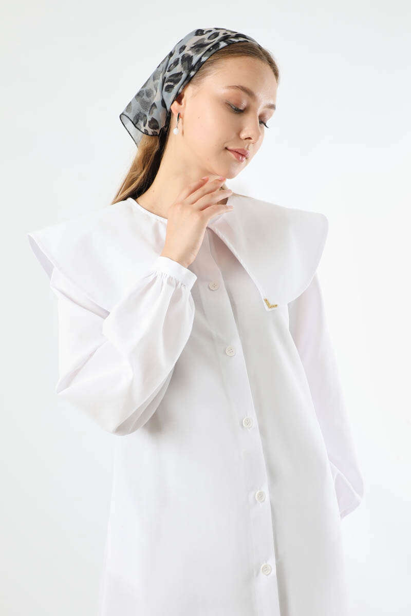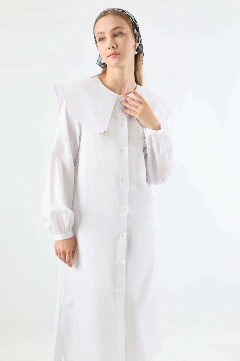 Geniş Bebe Yaka Tunik Beyaz. Geniş bebe yakalıdır. Yaka ucunda metal aksesuar vardır. Önü düğmelidir. Manşeti düğmelidir. Günlük kullanım ve özel günlerinizde tercih edebilirsiniz.
