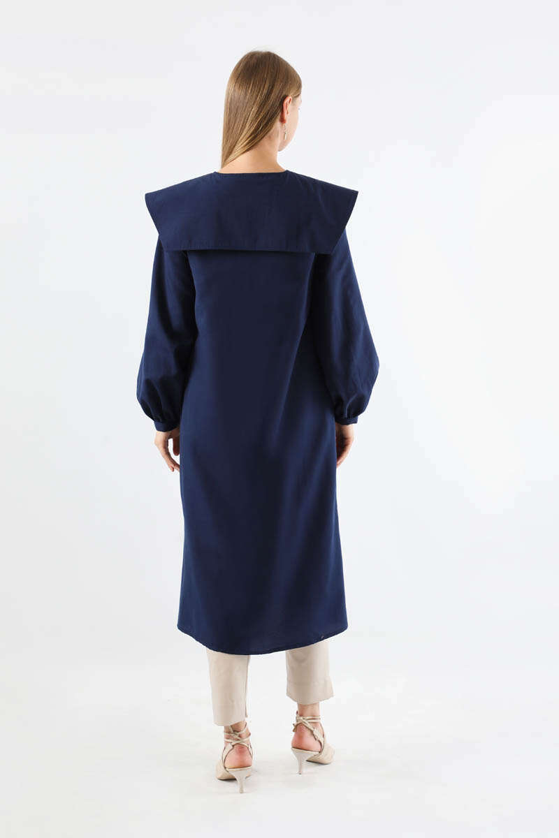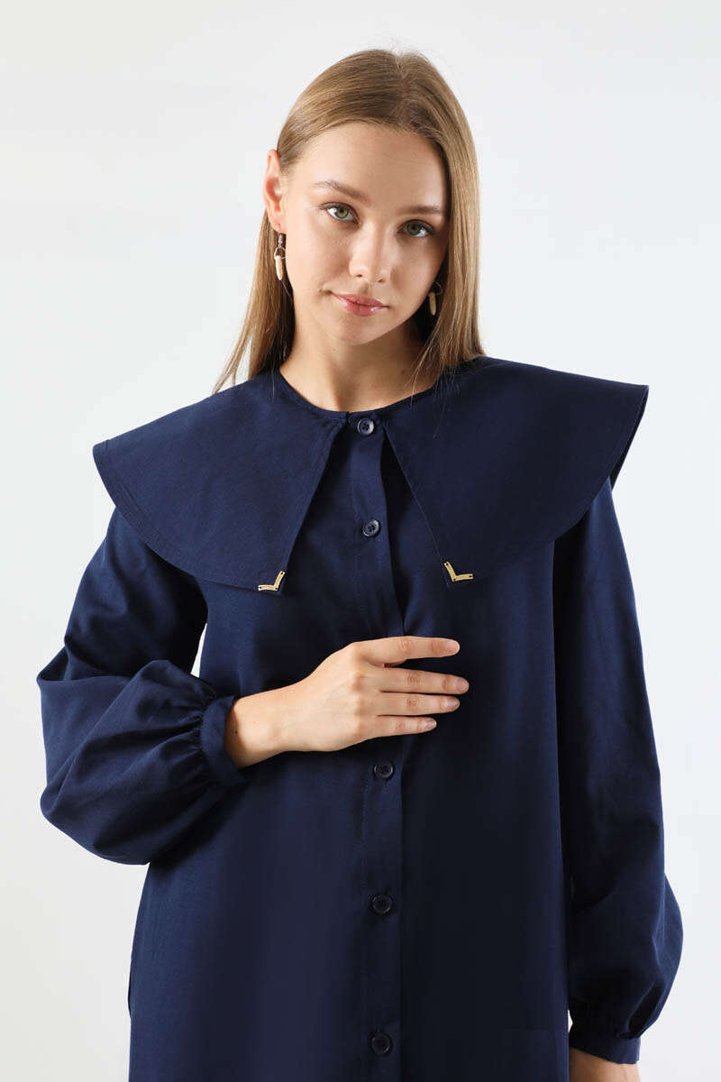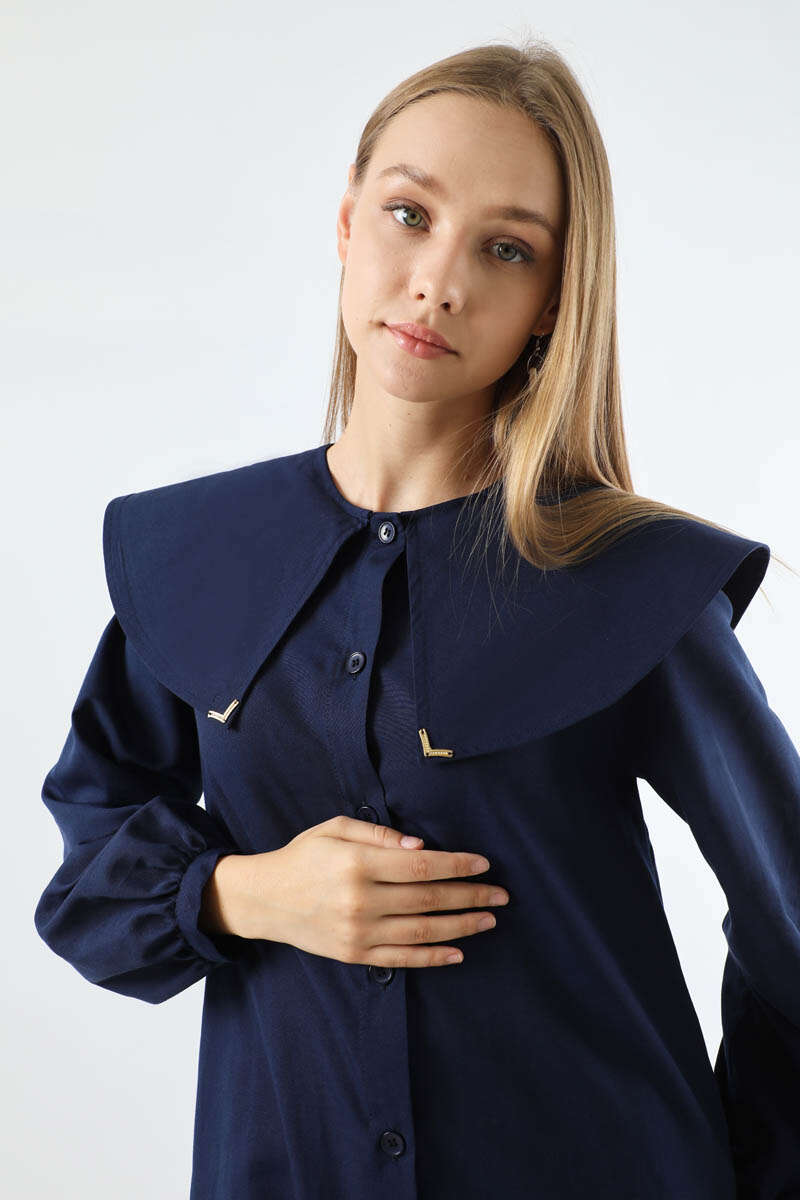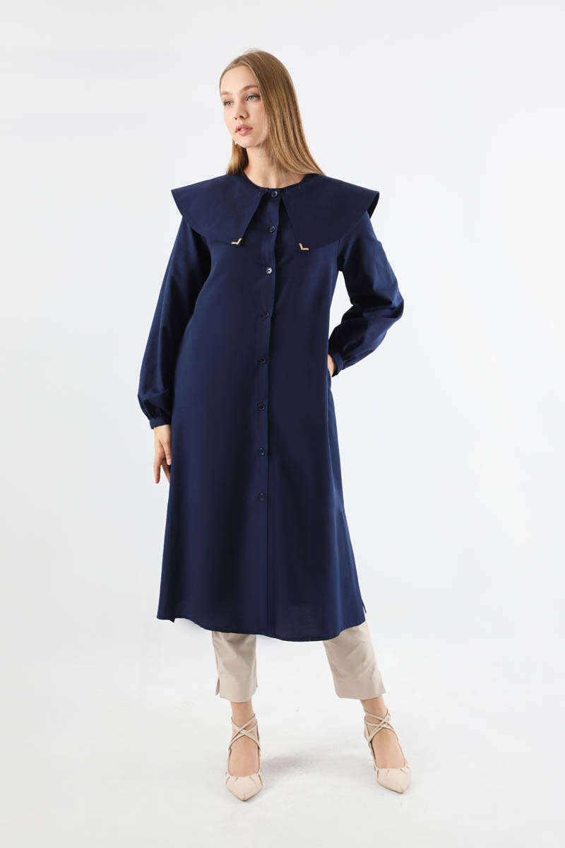 Geniş Bebe Yaka Tunik Lacivert. Geniş bebe yakalıdır. Yaka ucunda metal aksesuar vardır. Önü düğmelidir. Manşeti düğmelidir. Günlük kullanım ve özel günlerinizde tercih edebilirsiniz.