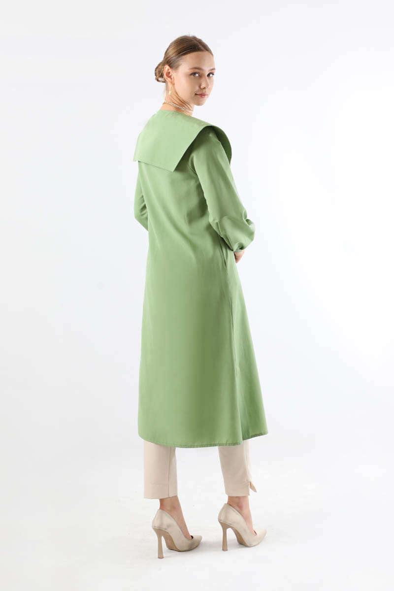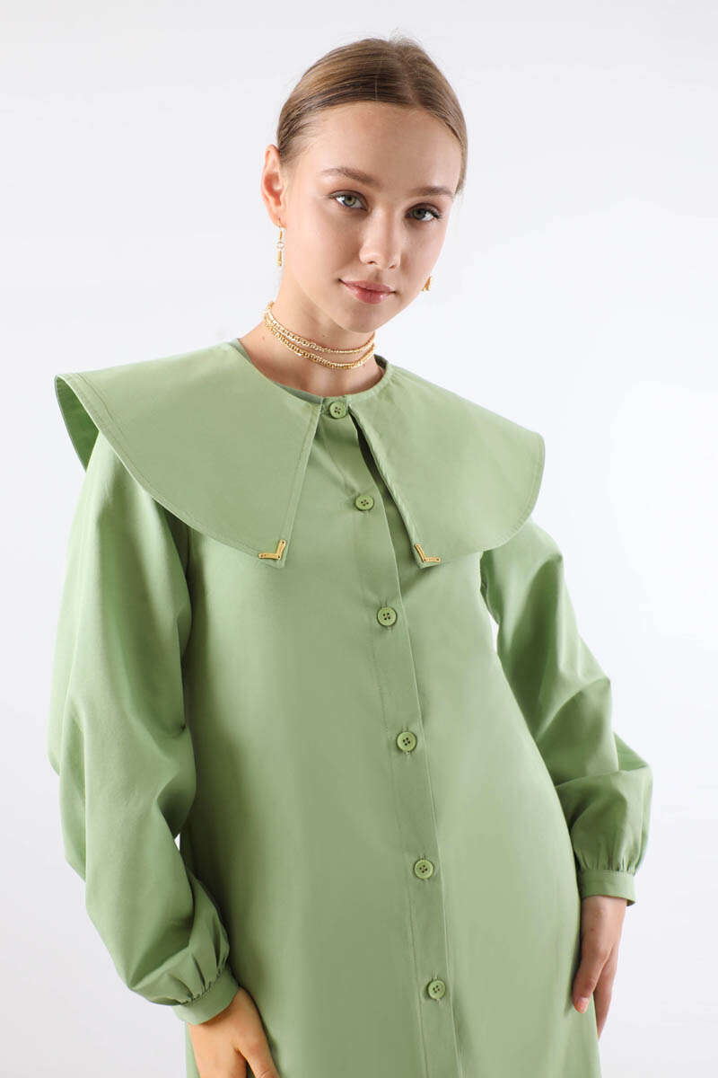 Geniş Bebe Yaka Tunik Mint. Geniş bebe yakalıdır. Yaka ucunda metal aksesuar vardır. Önü düğmelidir. Manşeti düğmelidir. Günlük kullanım ve özel günlerinizde tercih edebilirsiniz.