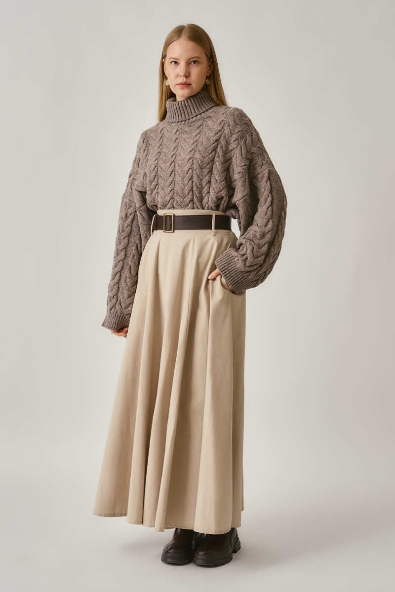 Geniş Kemerli Etek Taş, sade ama etkileyici bir siluet arayanlar için ideal bir seçenek. Minimal, kloş kesime sahip etek ile şehirli stilin sofistike yüzünü yansıtıyor. Yalın formu sayesinde gömlek ve bodylerle ofis günlerinde ya da özel davetlerde rahatlıkla tercih edilebilir.