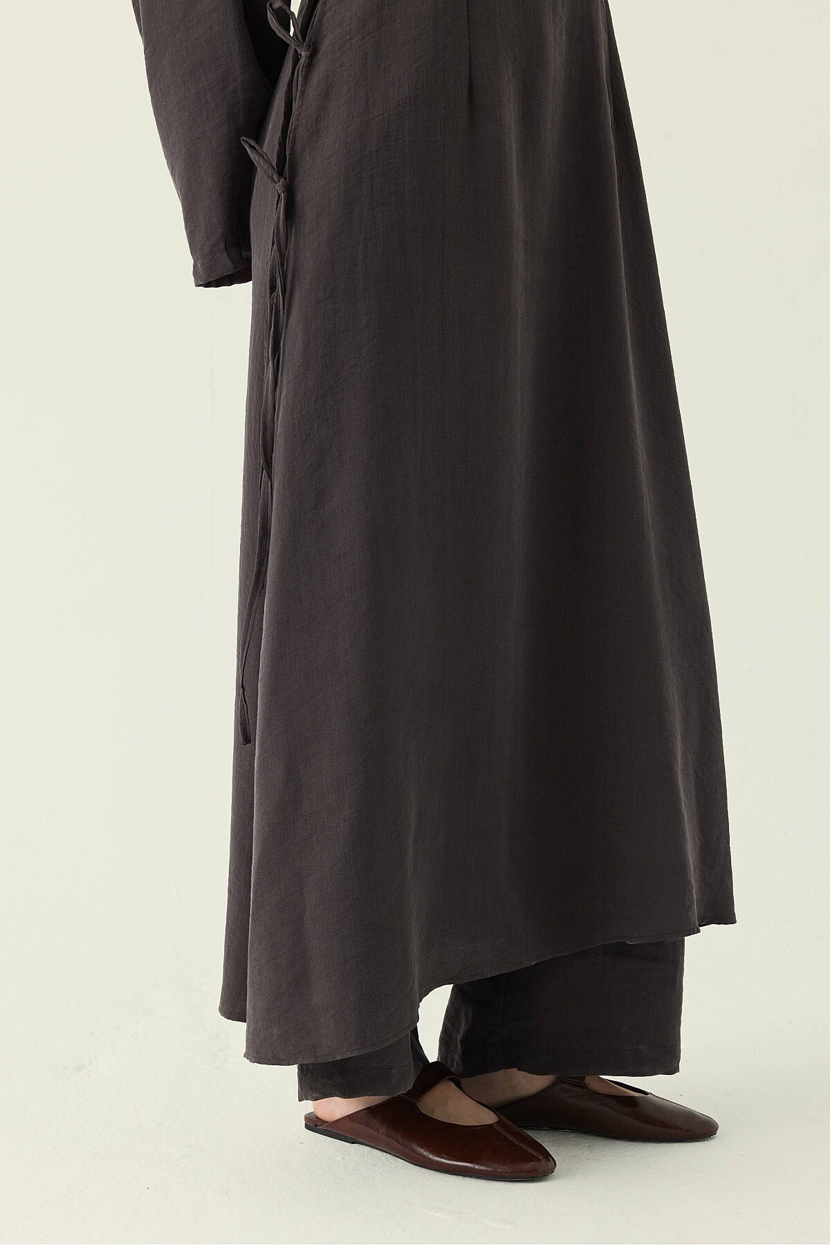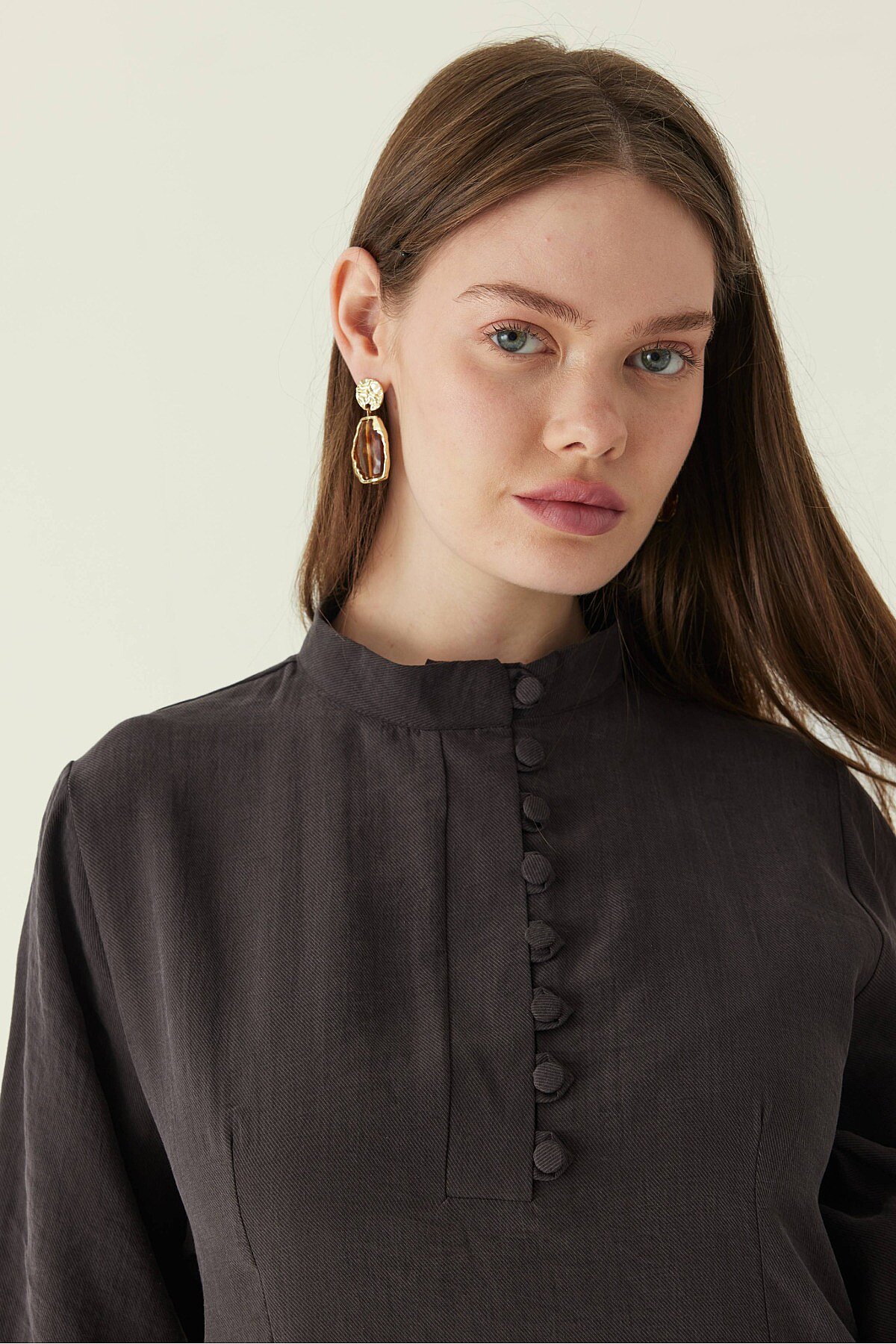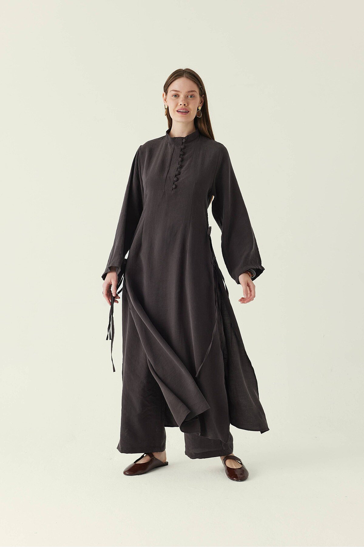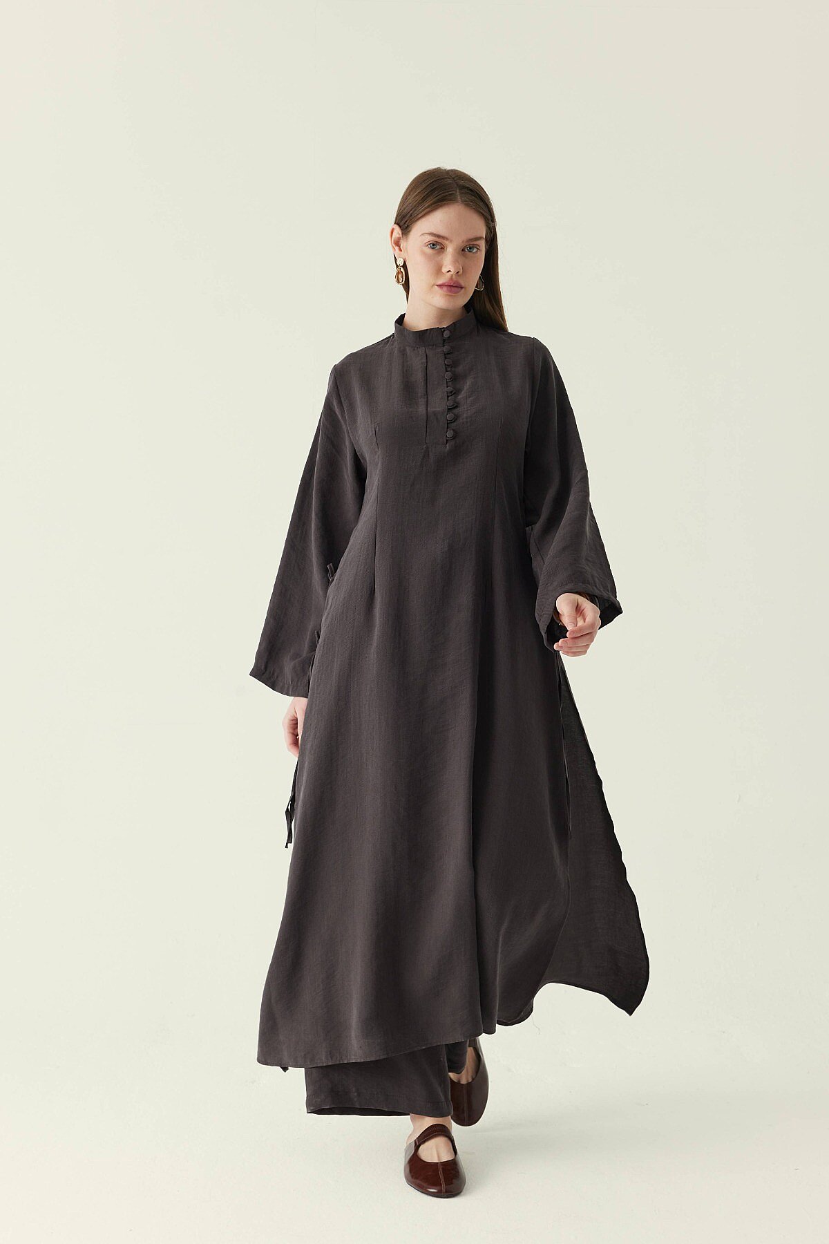 Geniş Kollu Düğmeli Tunik Takım Acı Kahve