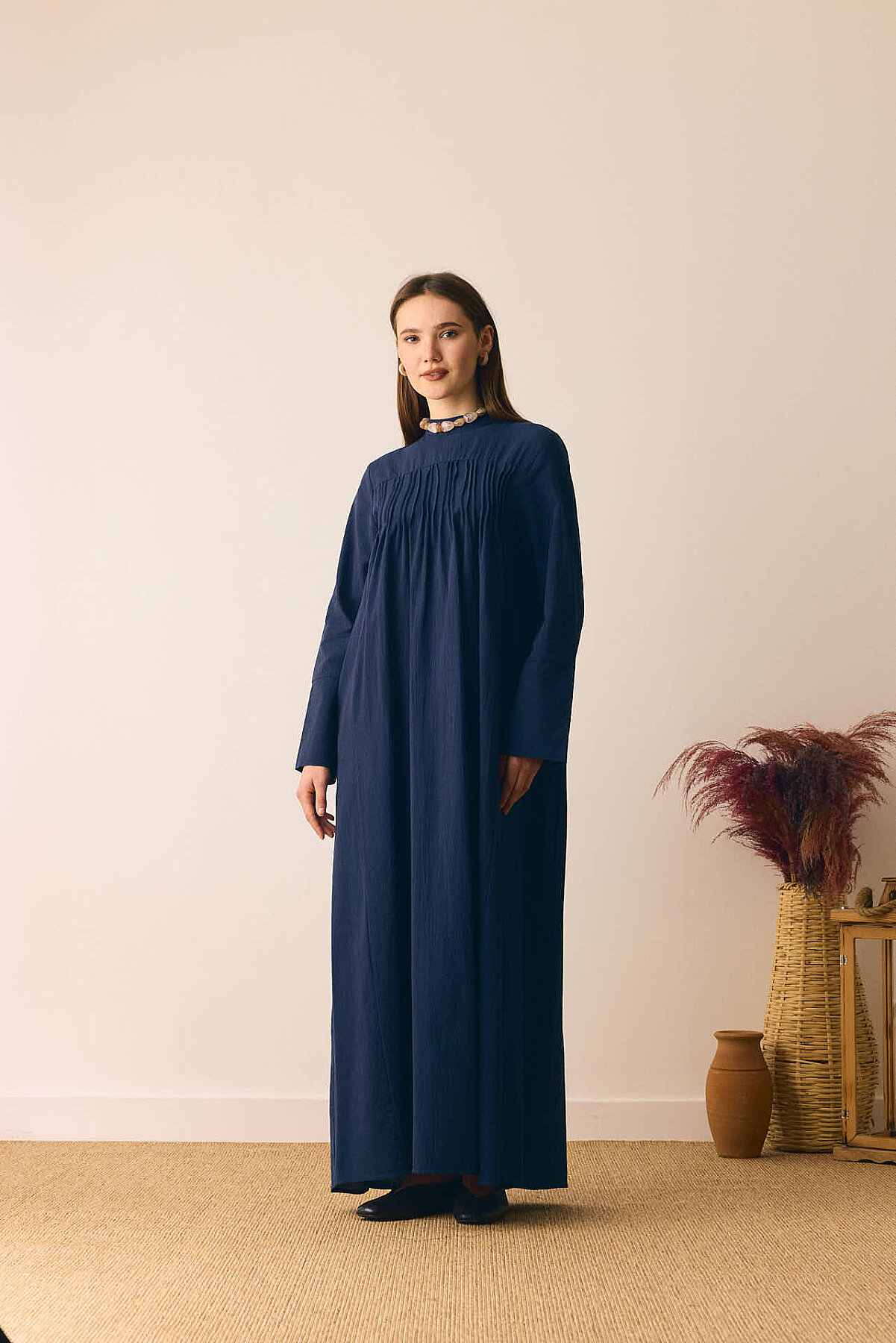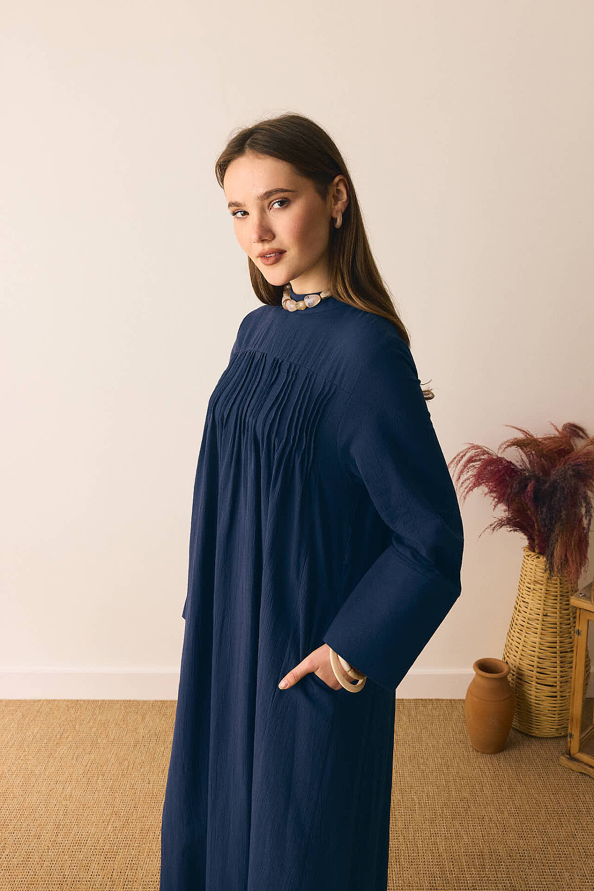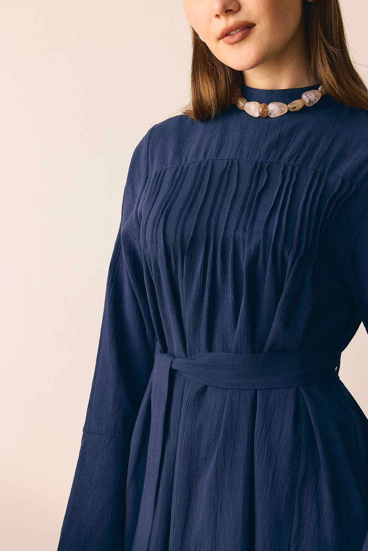 Geniş Manşetli Şile Bezi Elbise Lacivert