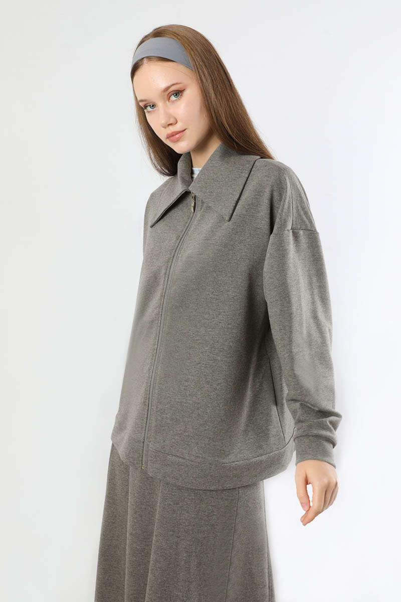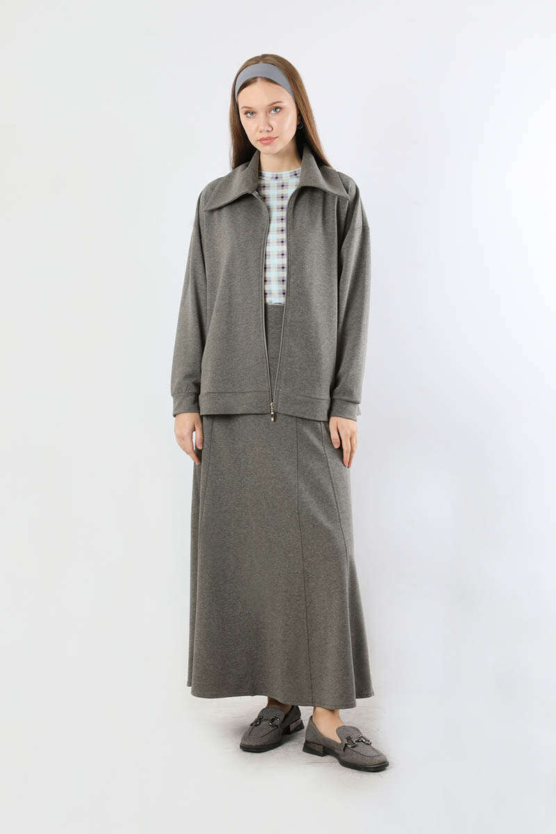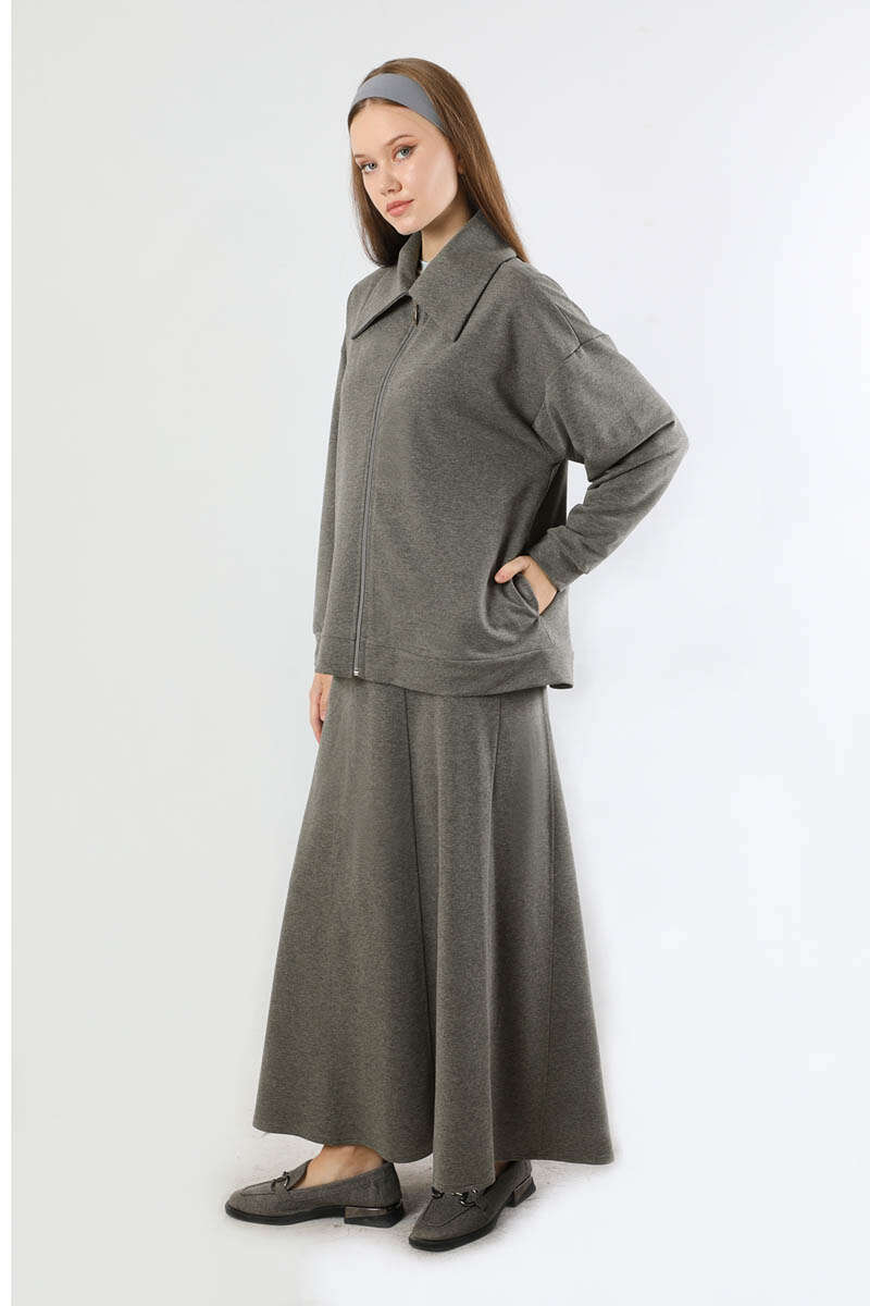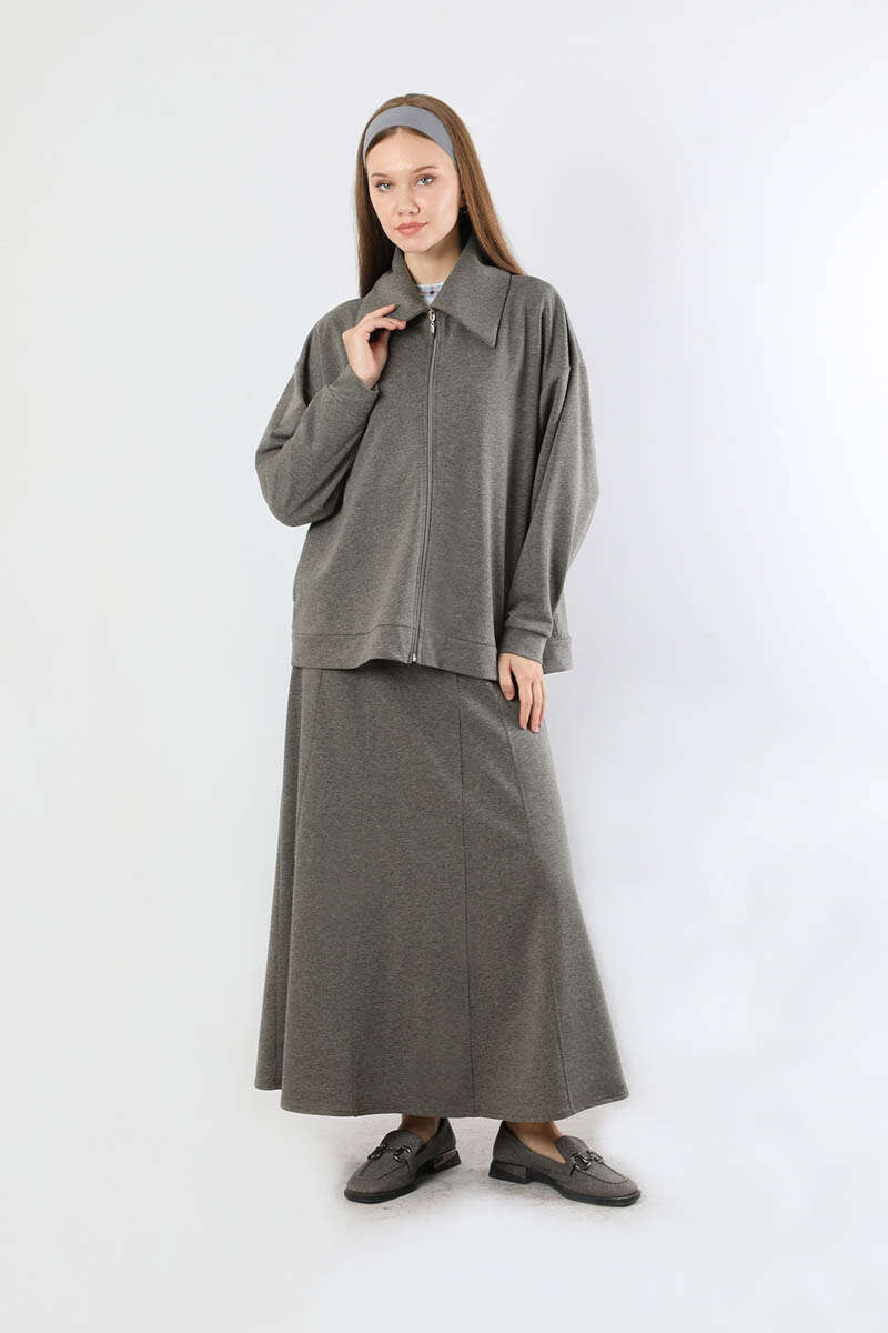 Geniş Yaka Etekli Spor Takım Antrasit. Geniş gömlek yakalıdır. Önü fermuarlıdır. Düşük omuzludur. Etek parçalı kloş detaylıdır. Etek arkadan lastiklidir. Günlük kullanım ve özel günlerinizde tercih edebilirsiniz.