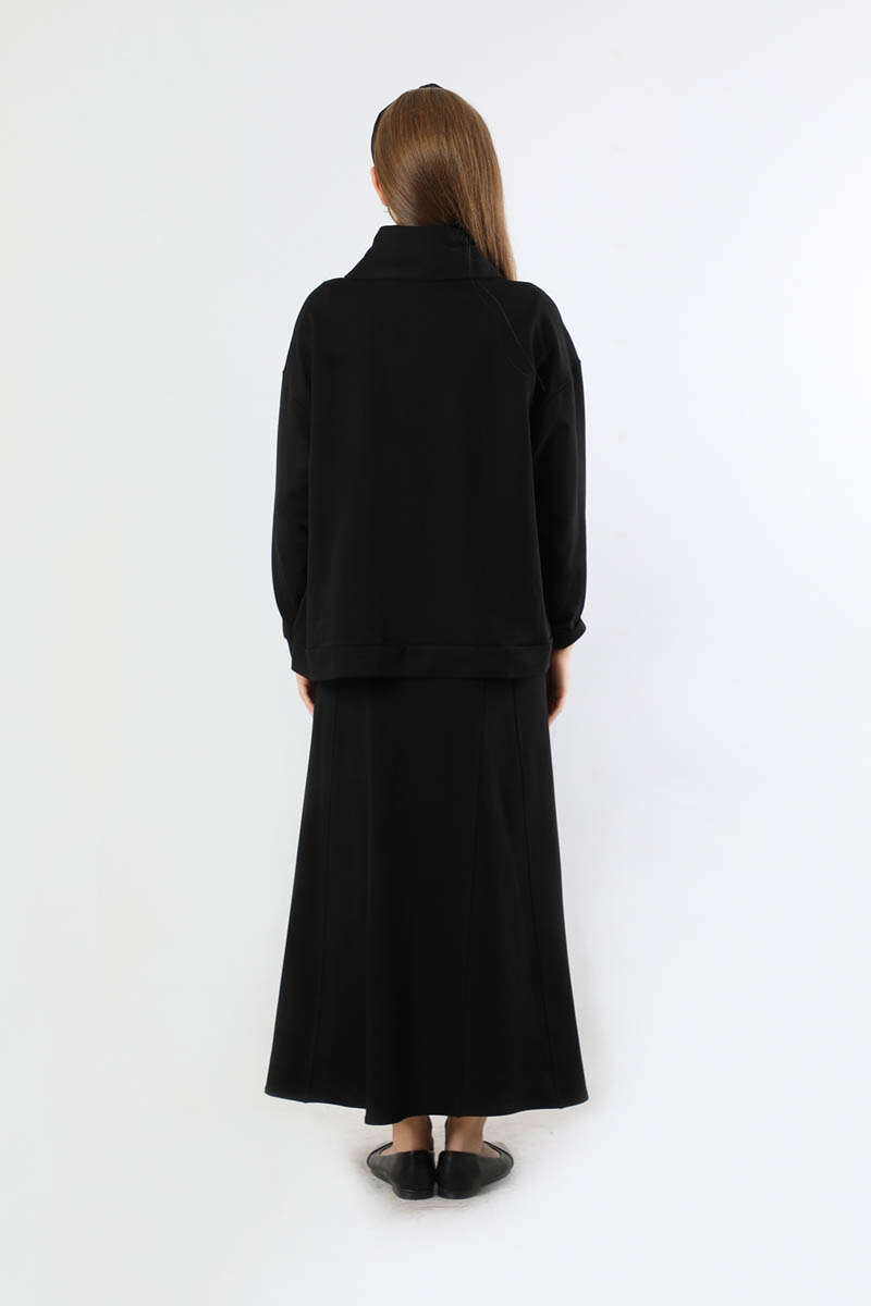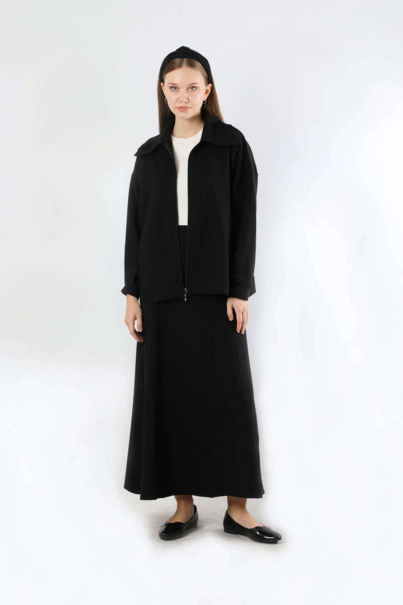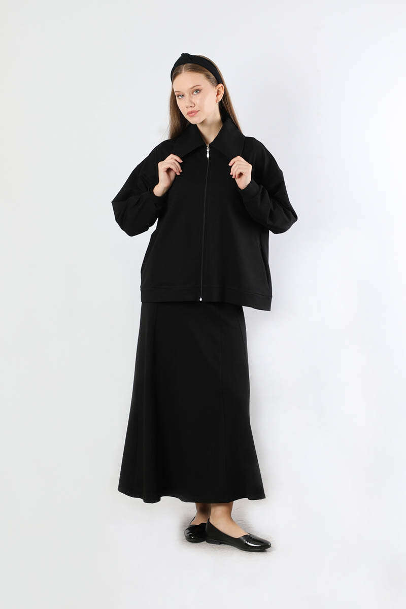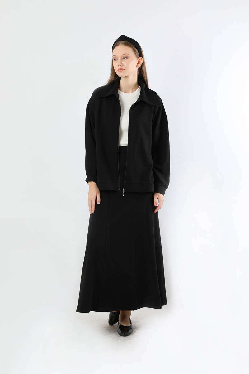Geniş Yaka Etekli Spor Takım Siyah. Geniş gömlek yakalıdır. Önü fermuarlıdır. Düşük omuzludur. Etek parçalı kloş detaylıdır. Etek arkadan lastiklidir. Günlük kullanım ve özel günlerinizde tercih edebilirsiniz.