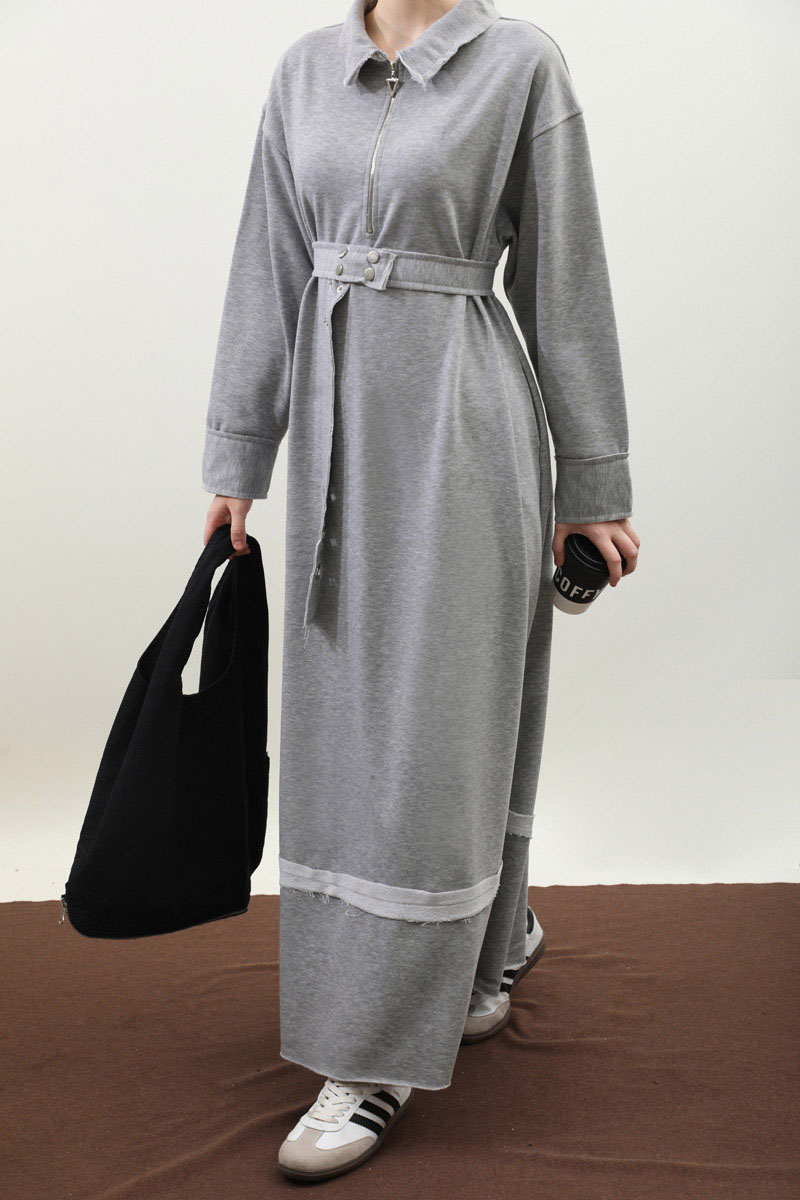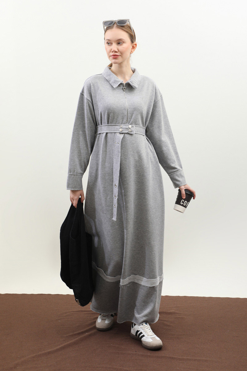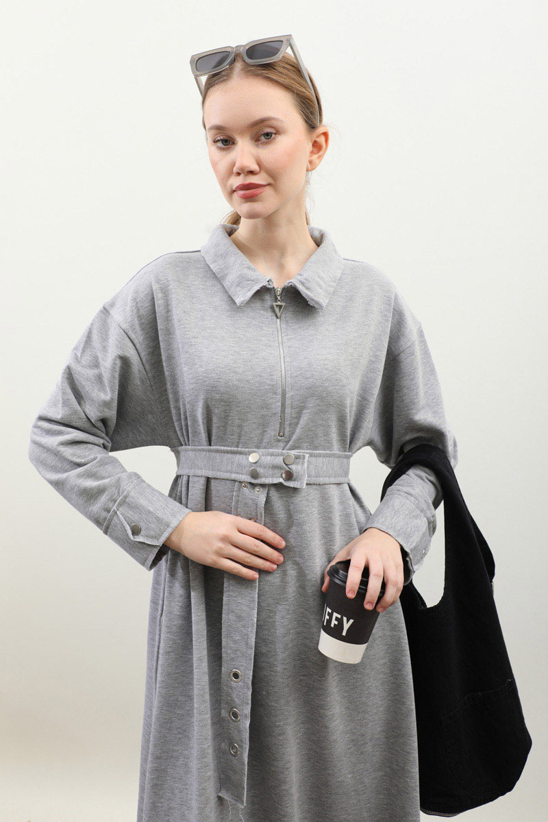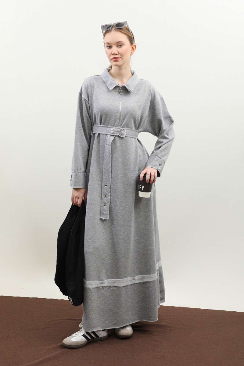 Geniş Yaka Kemerli Elbise Gri. Geniş yakadır önden yarım fermuarlıdır, kemerlidir, Gizli ceplidir, Eteği ve manşetinde pis dikiş detaylıdır, kemerlidir. Üç iplik okumaş olduğundan iç göstermez. Günlük kullanım ve özel günlerinizde tercih edebilirsiniz.