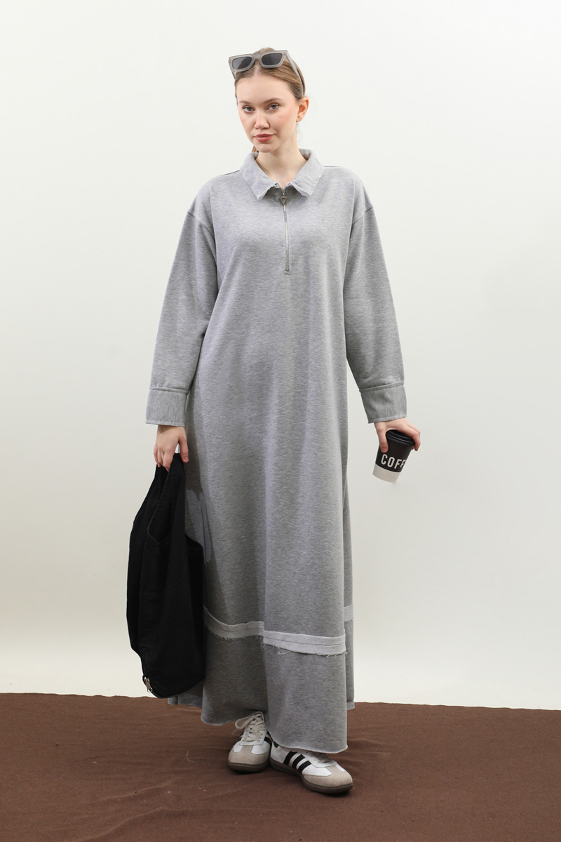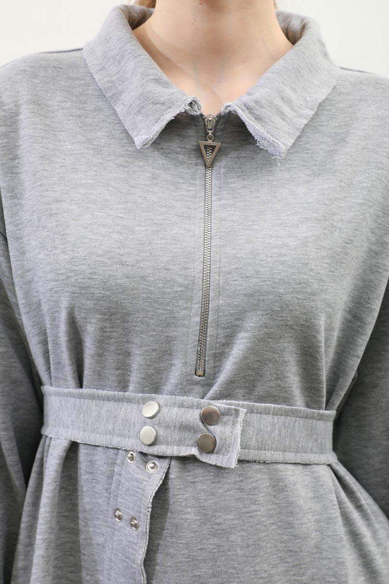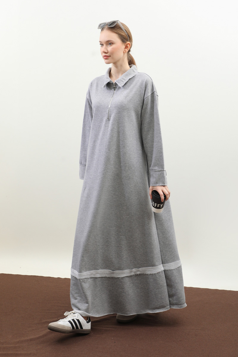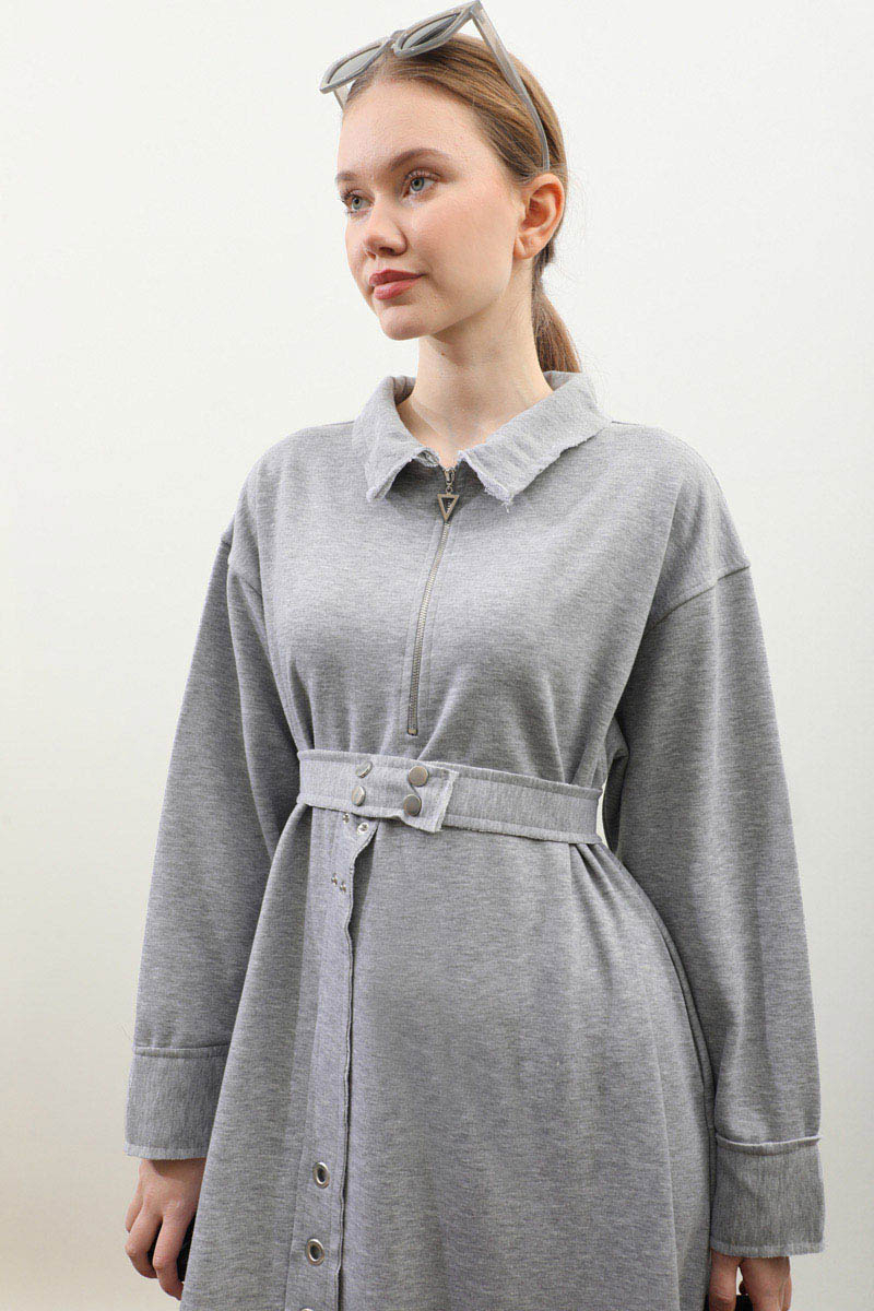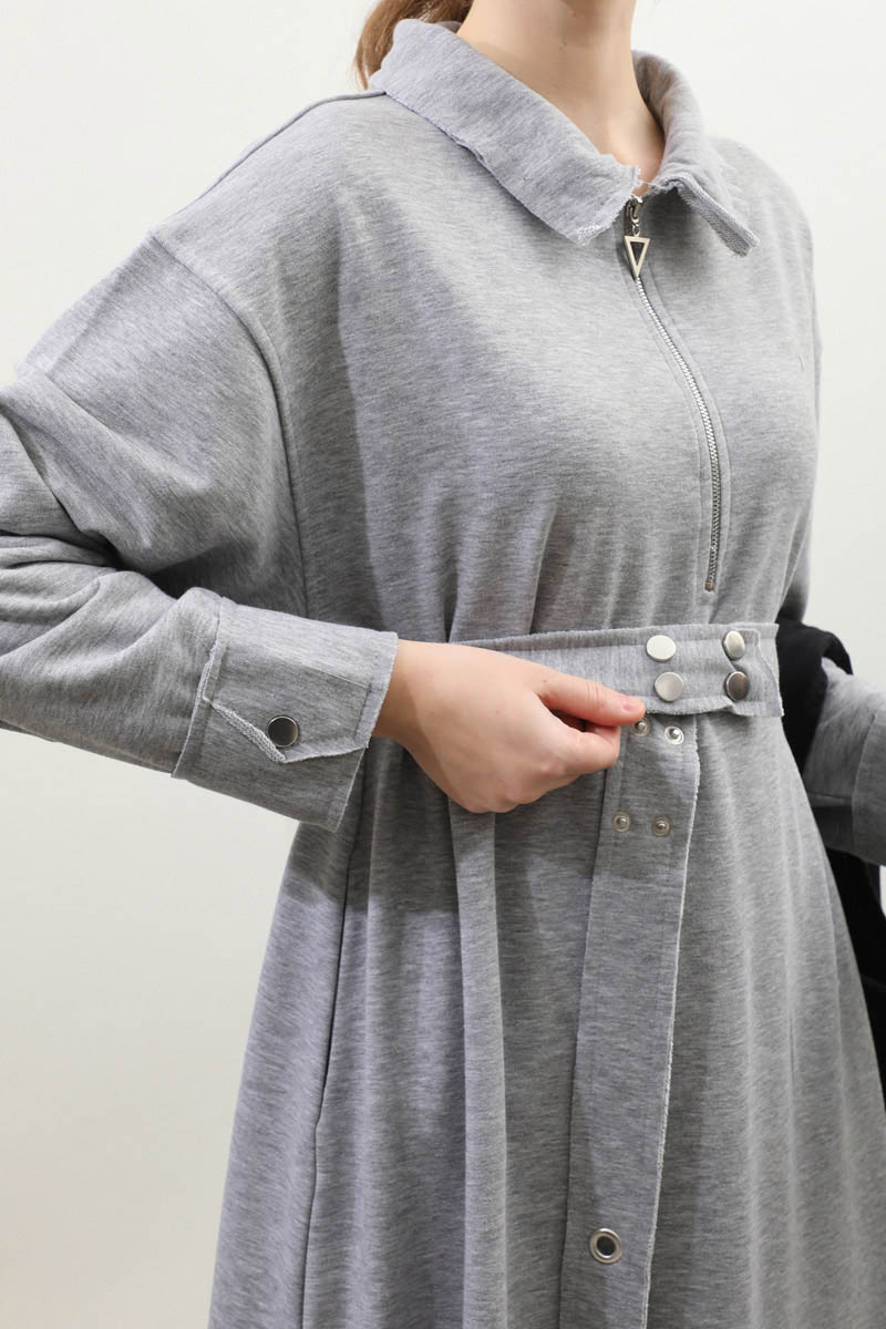 Geniş Yaka Kemerli Elbise Gri. Geniş yakadır önden yarım fermuarlıdır, kemerlidir, Gizli ceplidir, Eteği ve manşetinde pis dikiş detaylıdır, kemerlidir. Üç iplik okumaş olduğundan iç göstermez. Günlük kullanım ve özel günlerinizde tercih edebilirsiniz.