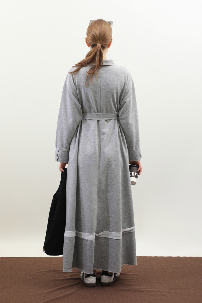 Geniş Yaka Kemerli Elbise Gri