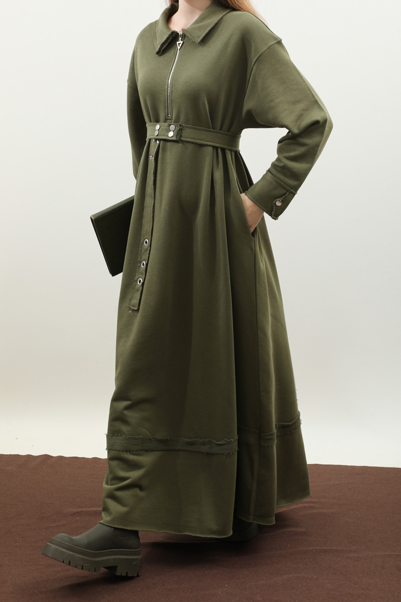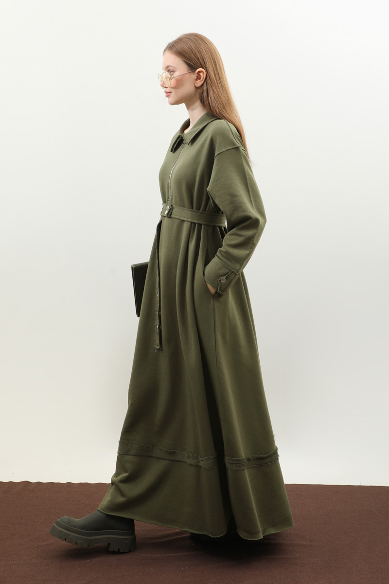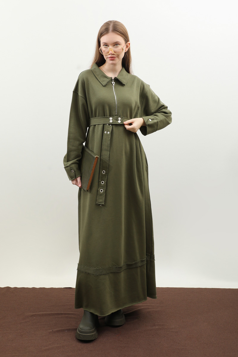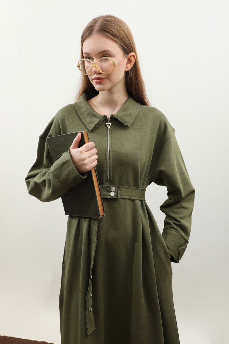 Geniş Yaka Kemerli Elbise Haki. Geniş yakadır önden yarım fermuarlıdır, kemerlidir, Gizli ceplidir, Eteği ve manşetinde pis dikiş detaylıdır, kemerlidir. Üç iplik okumaş olduğundan iç göstermez. Günlük kullanım ve özel günlerinizde tercih edebilirsiniz.