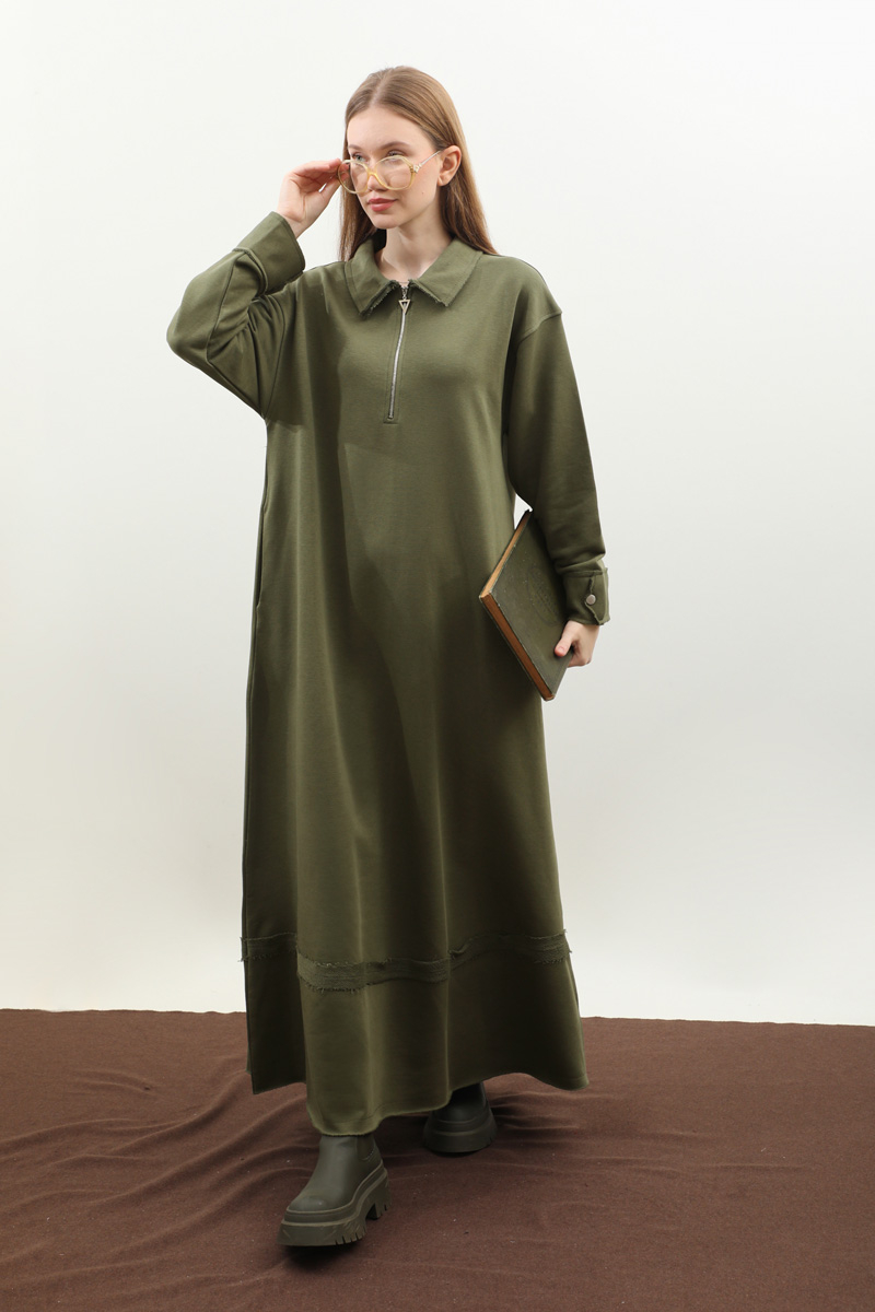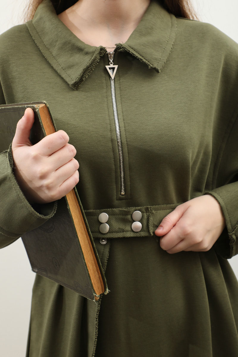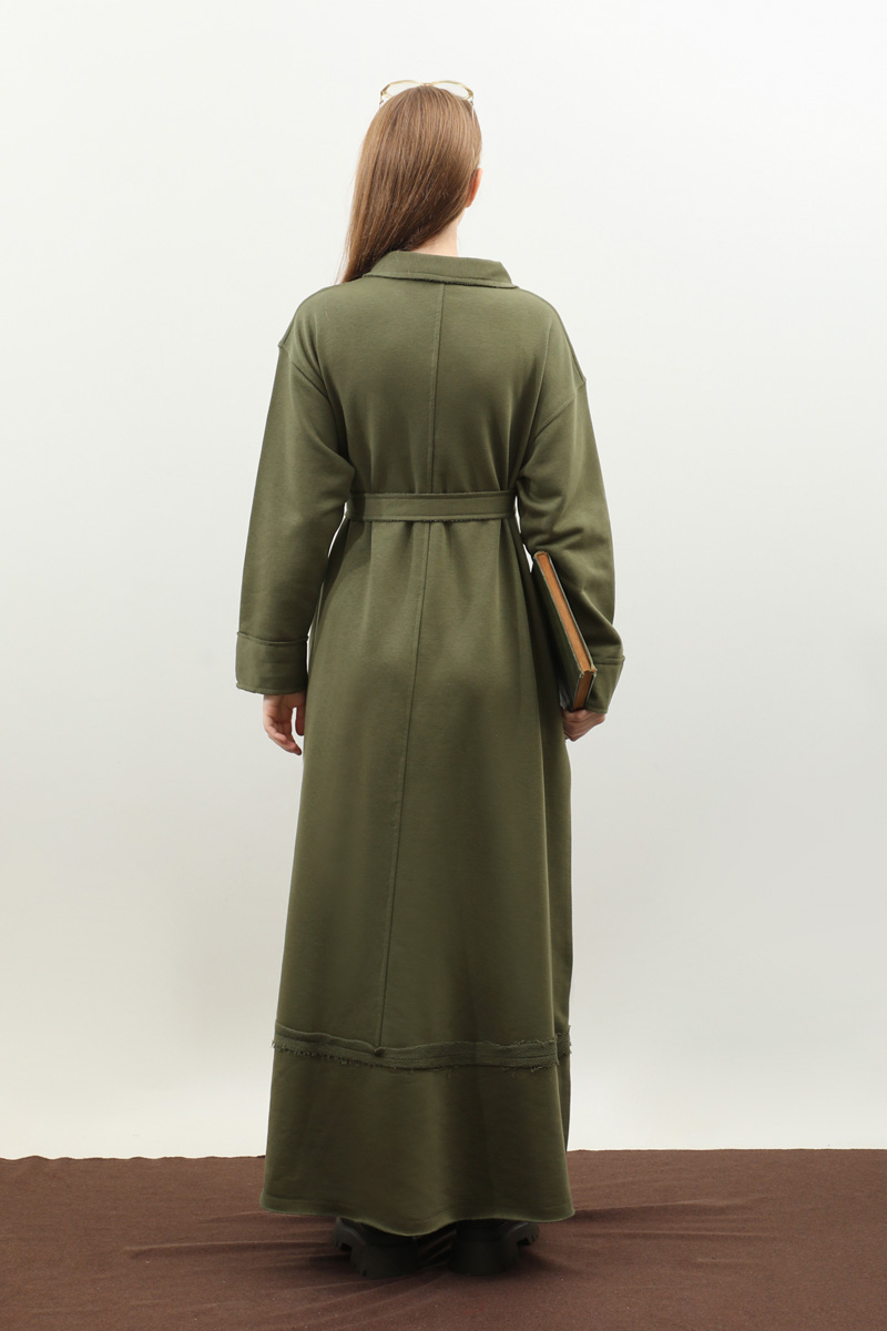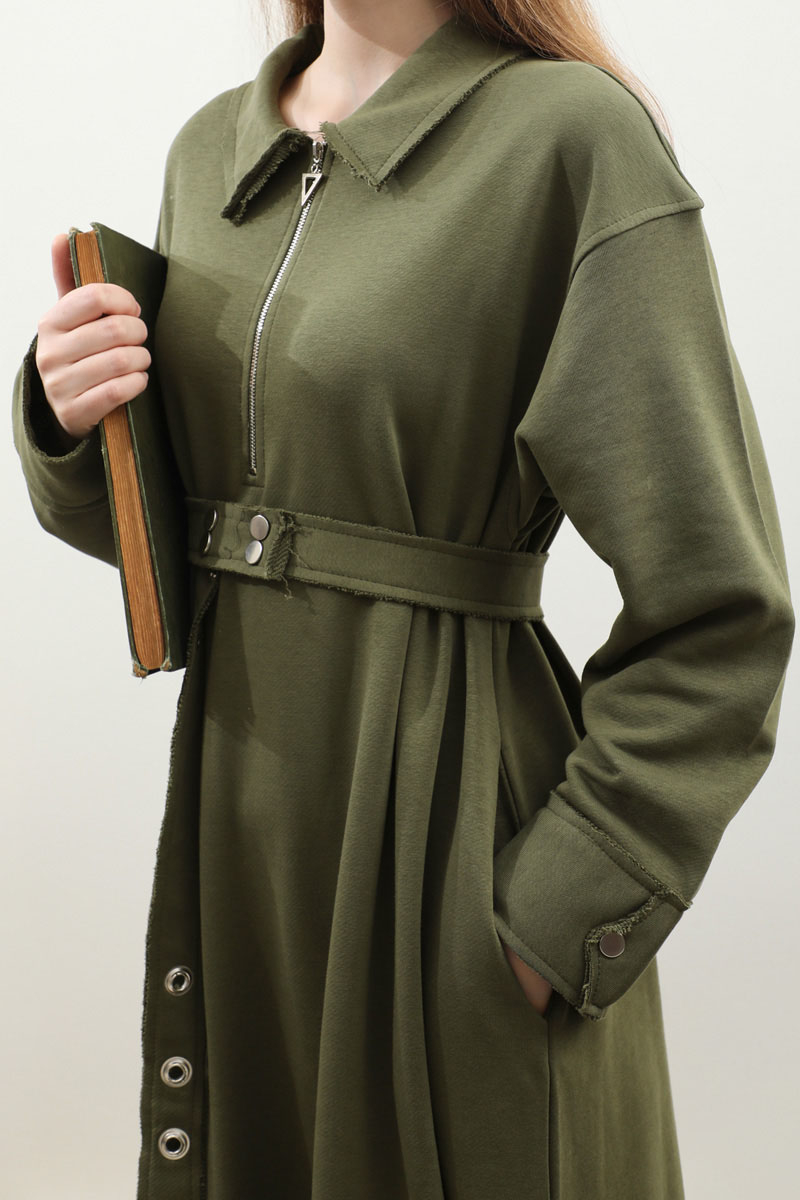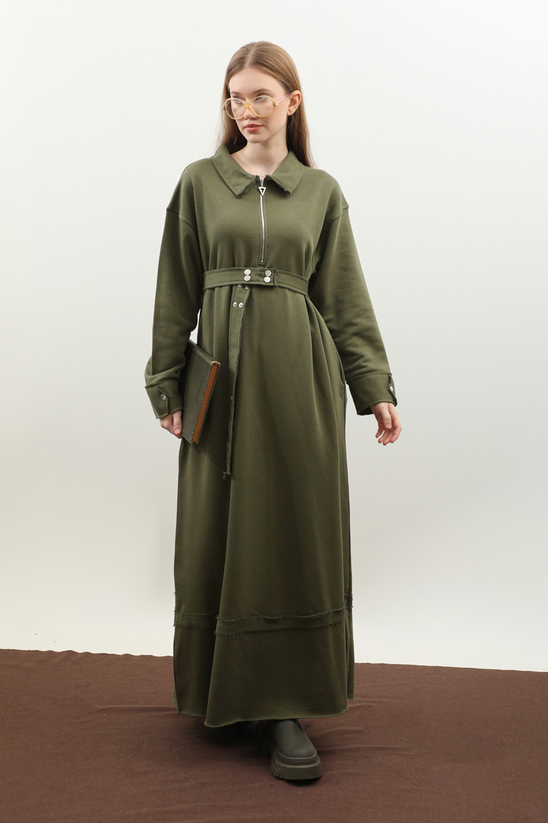 Geniş Yaka Kemerli Elbise Haki. Geniş yakadır önden yarım fermuarlıdır, kemerlidir, Gizli ceplidir, Eteği ve manşetinde pis dikiş detaylıdır, kemerlidir. Üç iplik okumaş olduğundan iç göstermez. Günlük kullanım ve özel günlerinizde tercih edebilirsiniz.