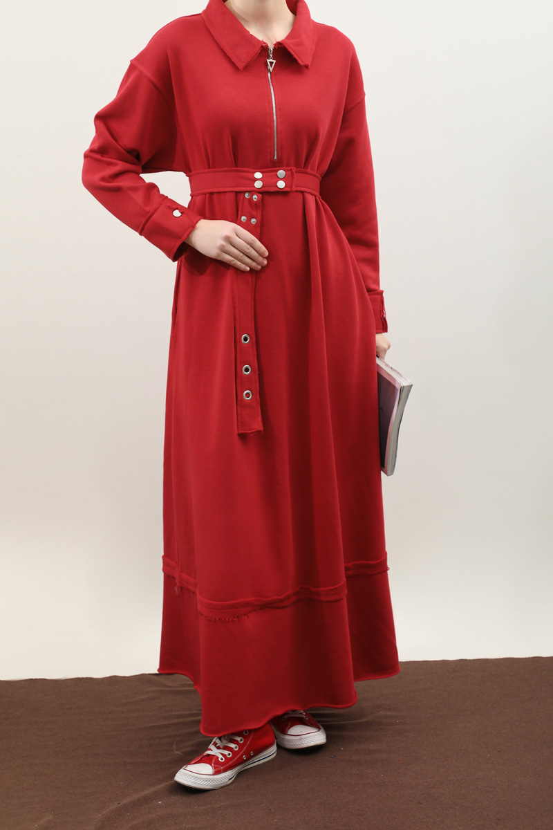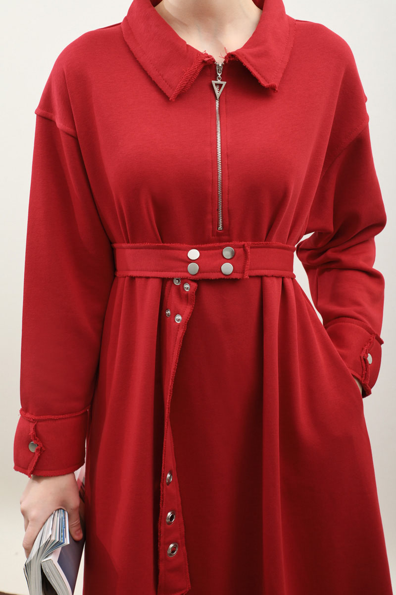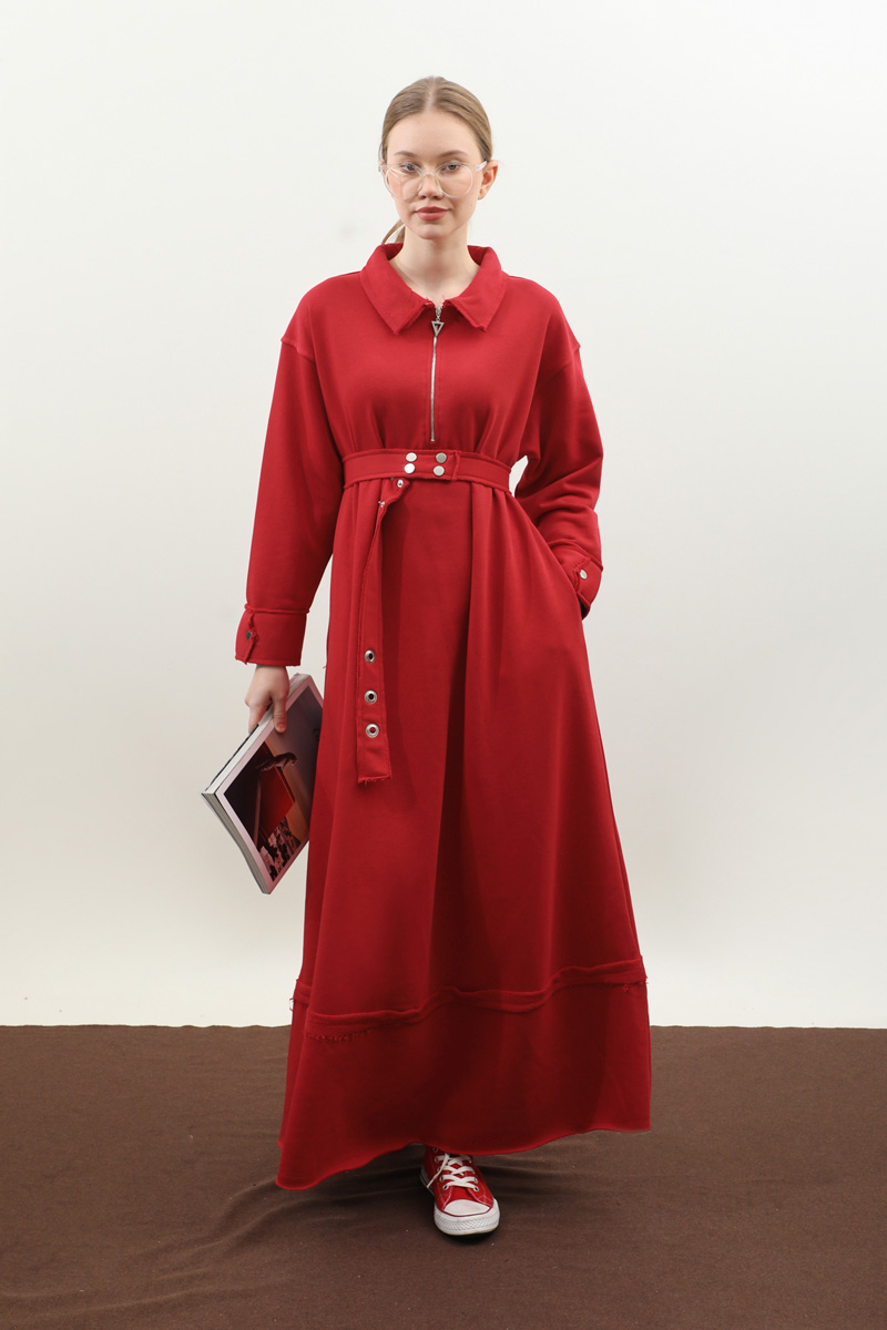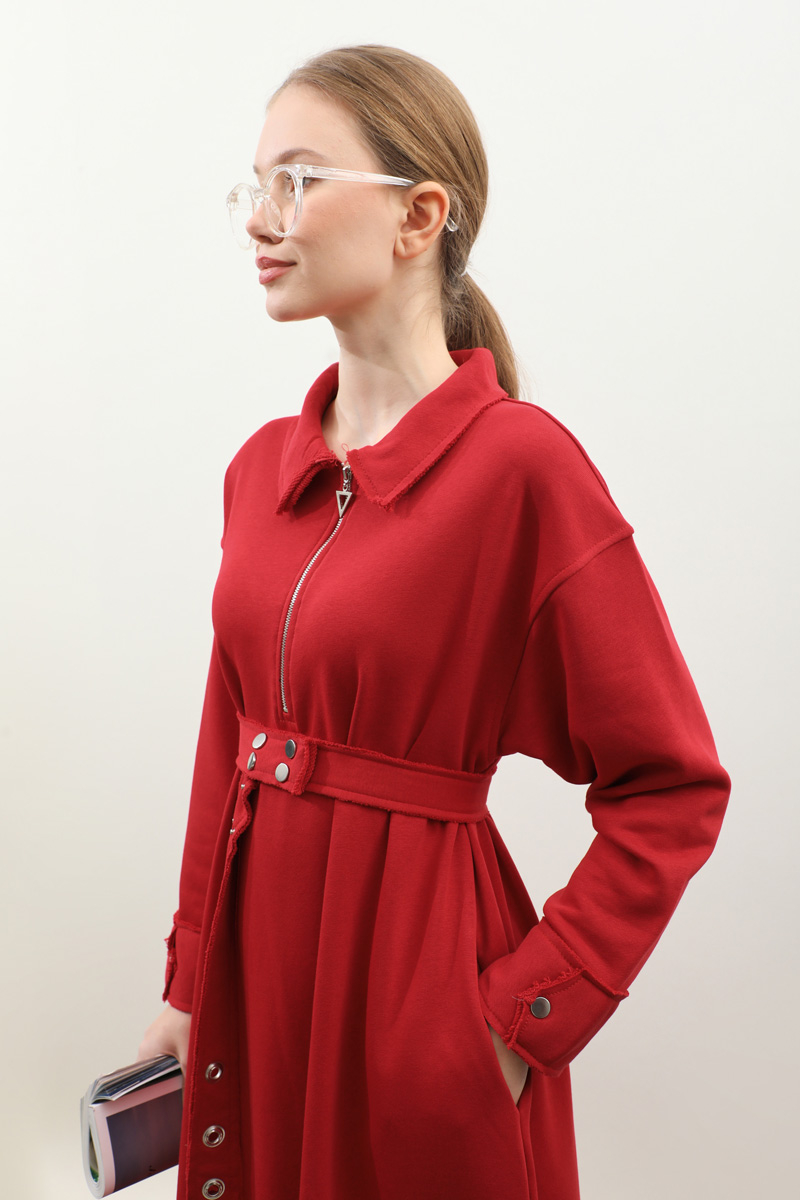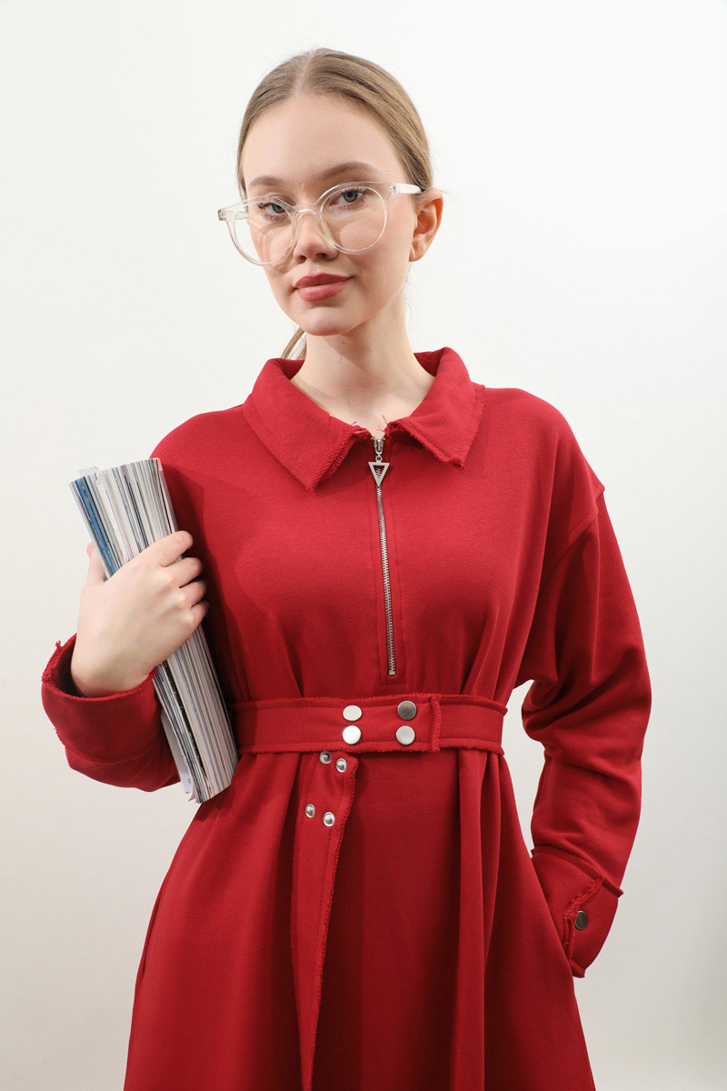 Geniş Yaka Kemerli Elbise Kırmızı. Geniş yakadır önden yarım fermuarlıdır, kemerlidir, Gizli ceplidir, Eteği ve manşetinde pis dikiş detaylıdır, kemerlidir. Üç iplik okumaş olduğundan iç göstermez. Günlük kullanım ve özel günlerinizde tercih edebilirsiniz.