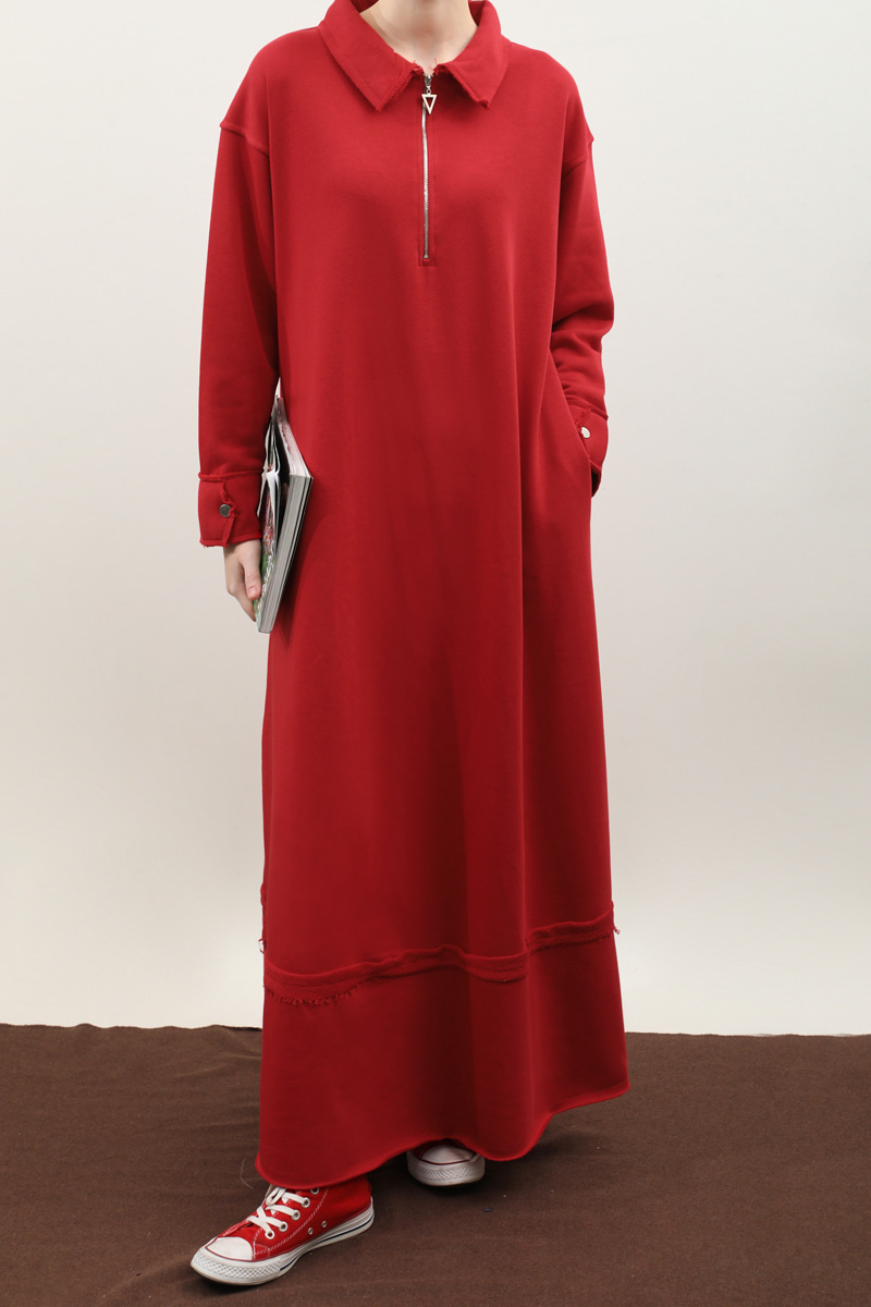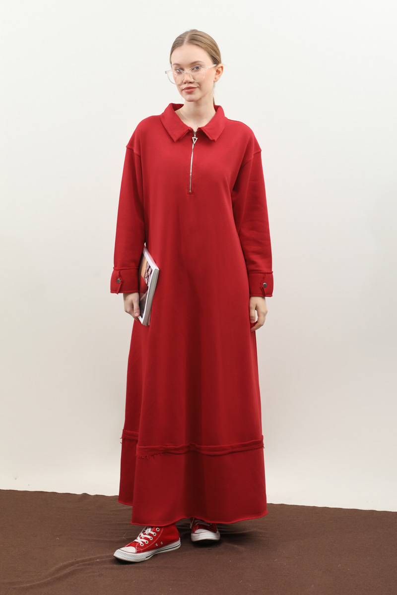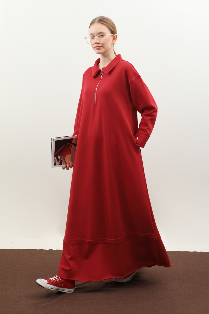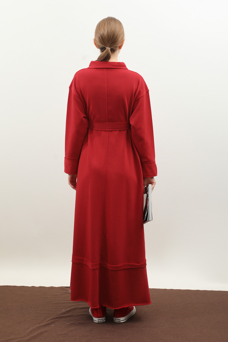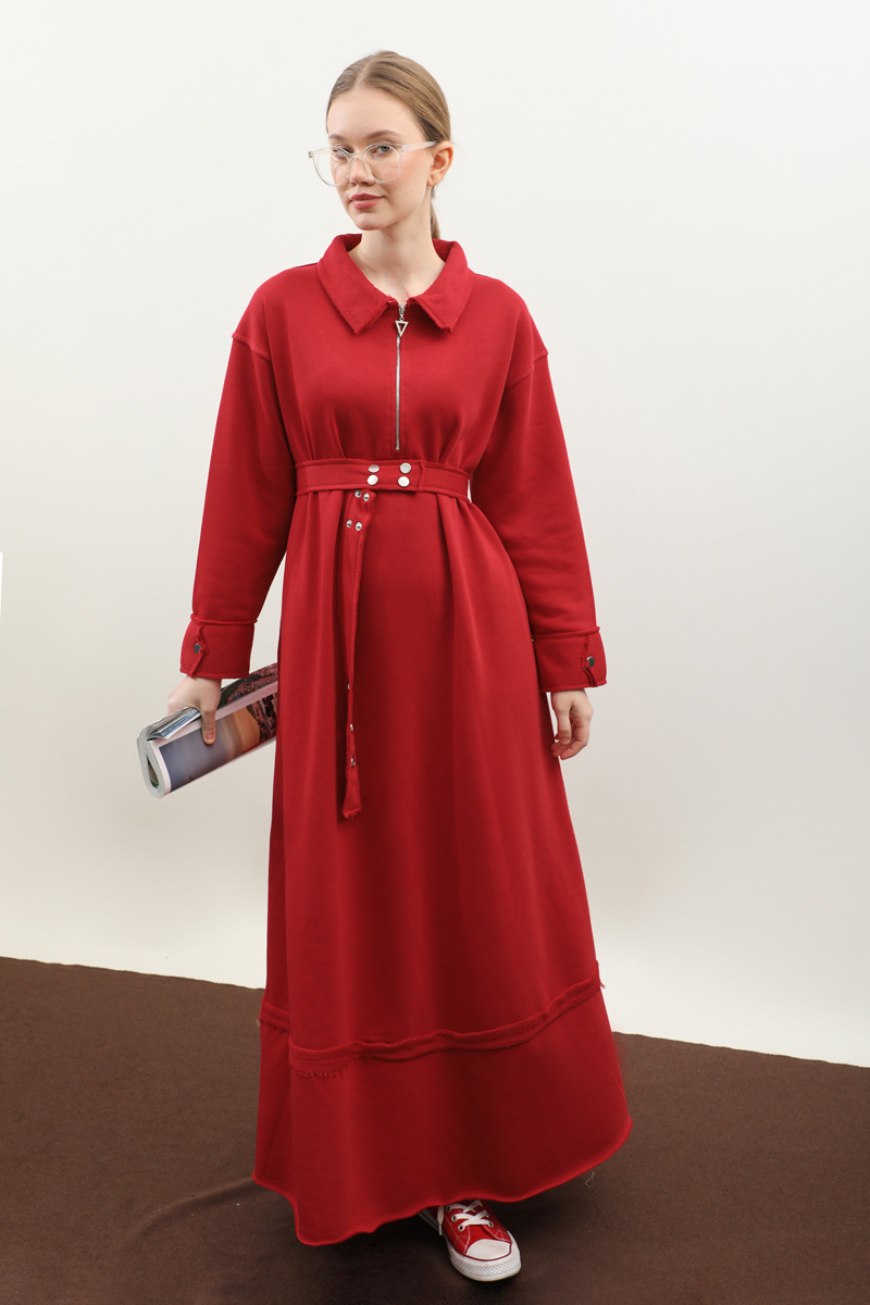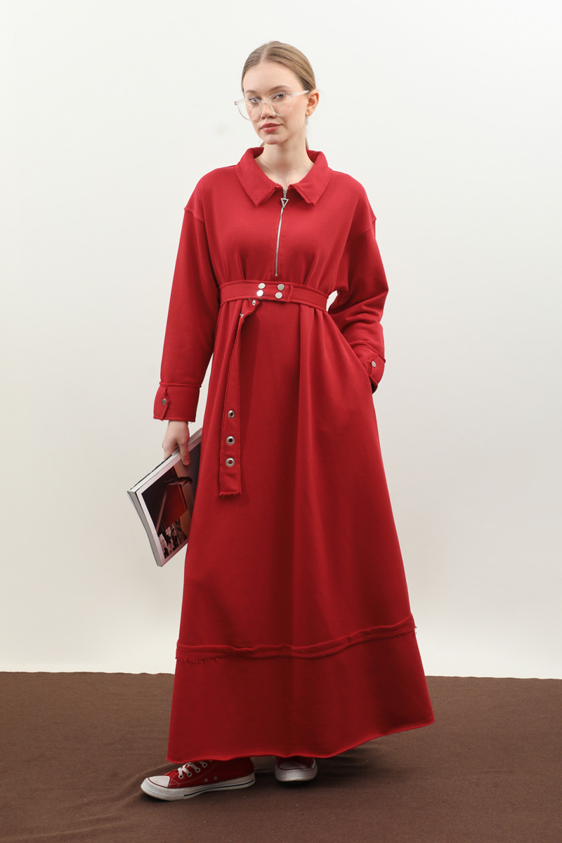 Geniş Yaka Kemerli Elbise Kırmızı. Geniş yakadır önden yarım fermuarlıdır, kemerlidir, Gizli ceplidir, Eteği ve manşetinde pis dikiş detaylıdır, kemerlidir. Üç iplik okumaş olduğundan iç göstermez. Günlük kullanım ve özel günlerinizde tercih edebilirsiniz.