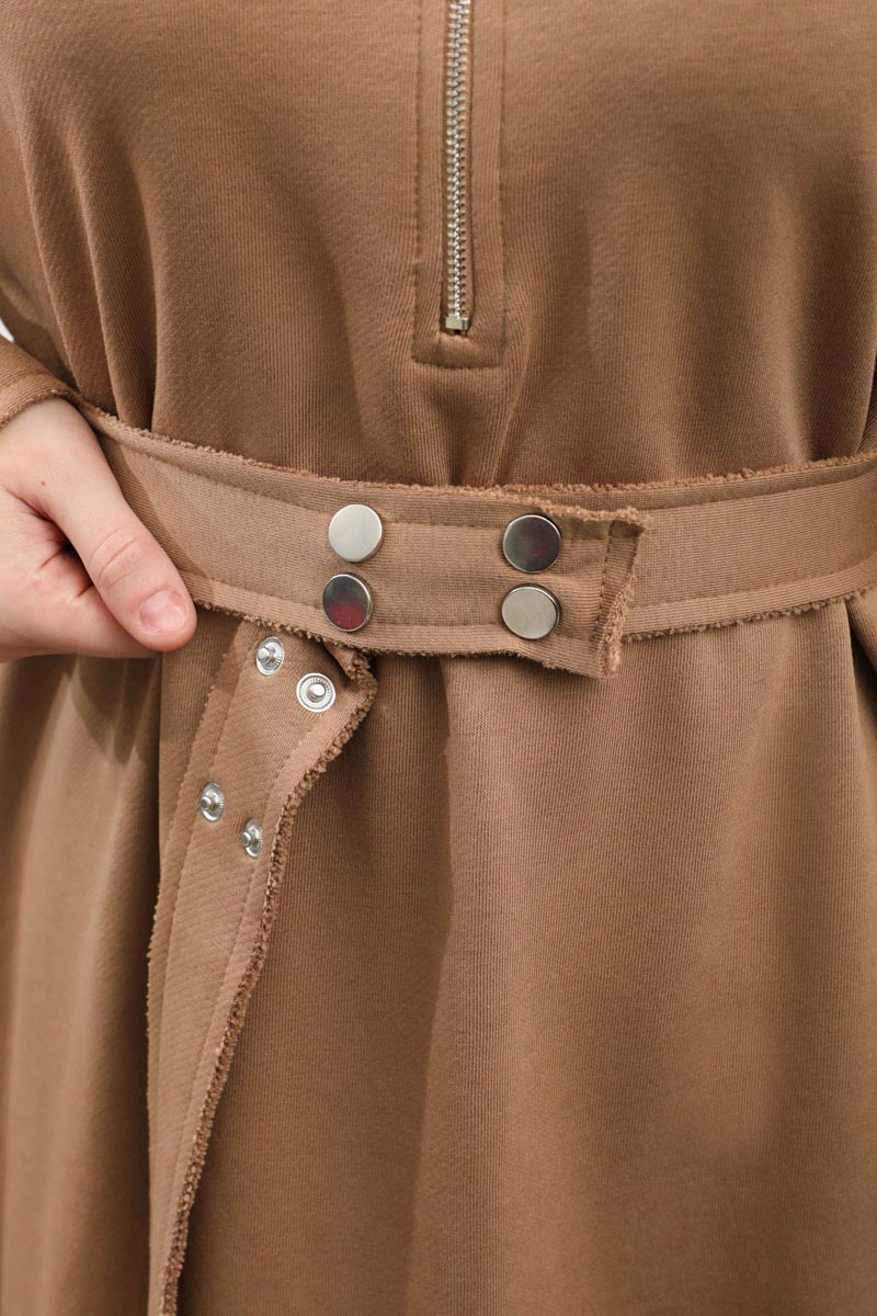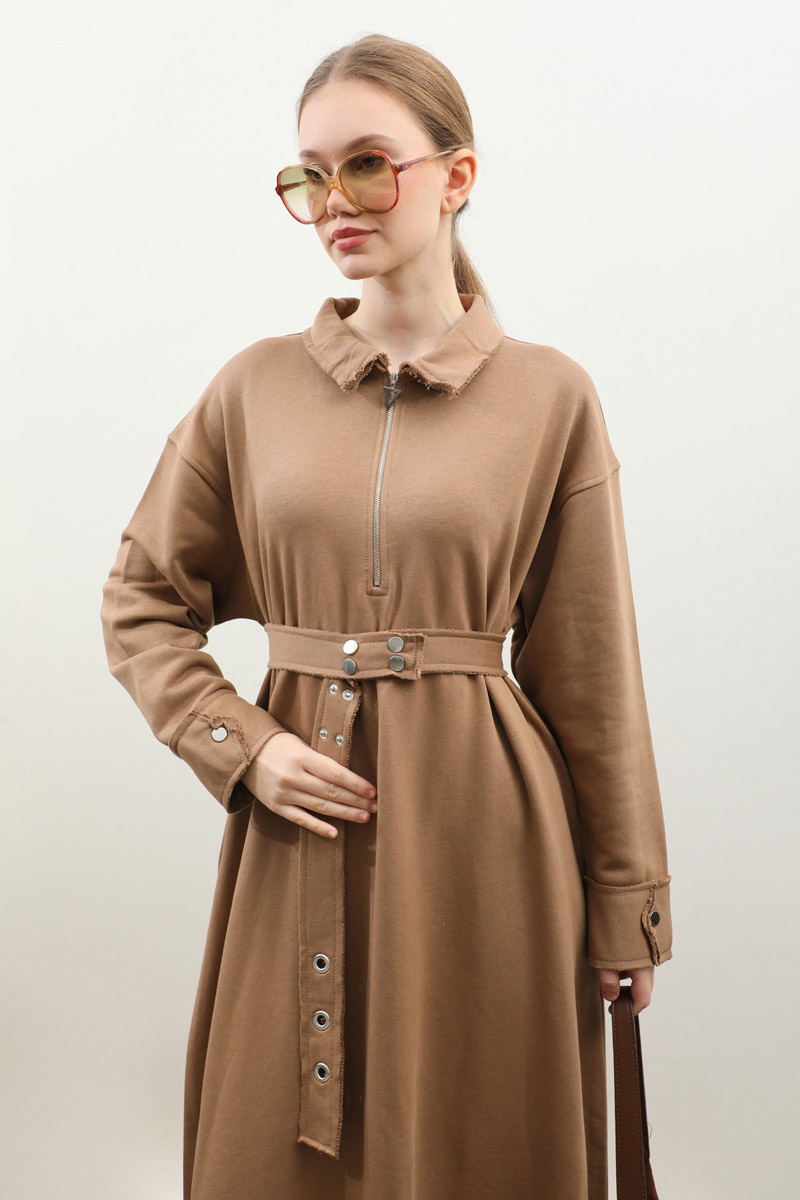 Geniş Yaka Kemerli Elbise Taba. Geniş yakadır önden yarım fermuarlıdır, kemerlidir, Gizli ceplidir, Eteği ve manşetinde pis dikiş detaylıdır, kemerlidir. Üç iplik okumaş olduğundan iç göstermez. Günlük kullanım ve özel günlerinizde tercih edebilirsiniz.