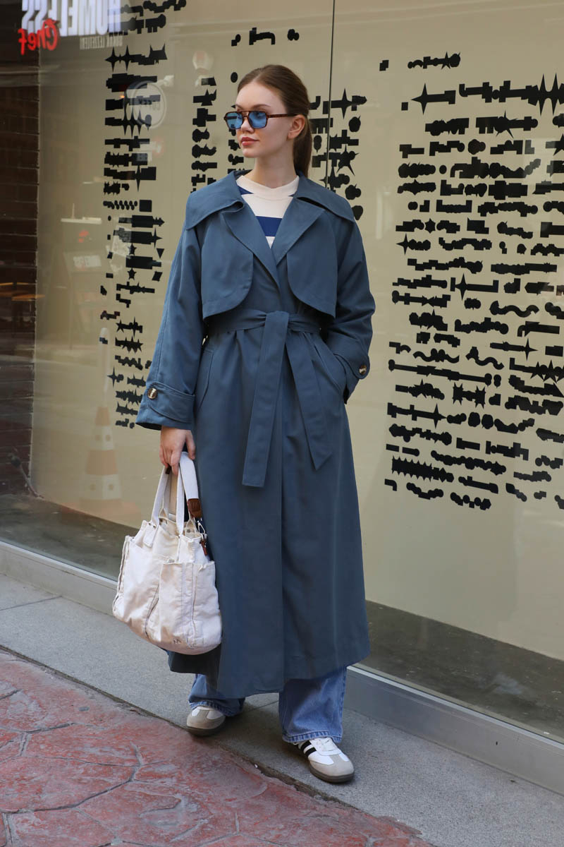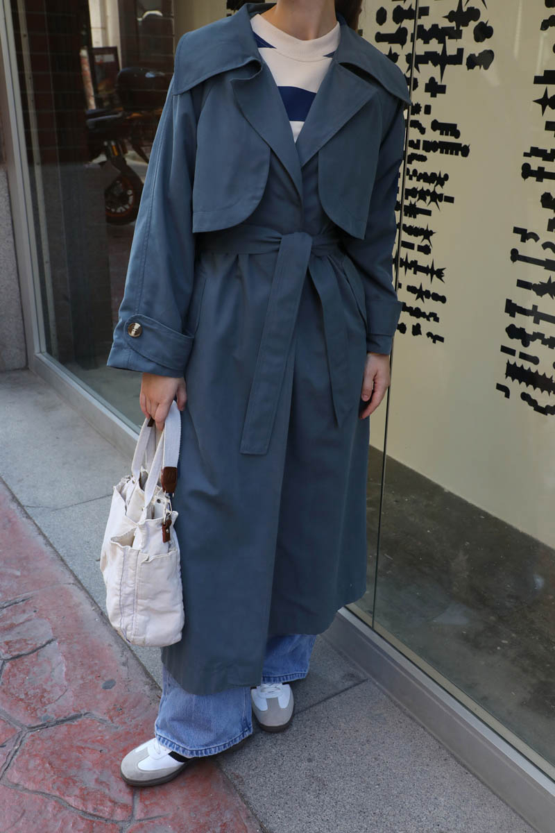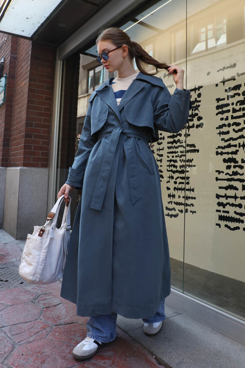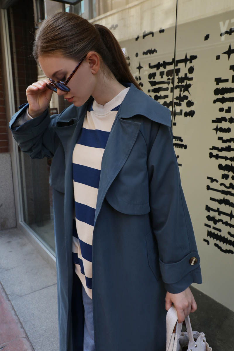 Geniş Yaka Trençkot Lacivert. Geniş yaka ve kruvaze detayldır, rüzgarlıklıdır, reglan kolludur, bilekten apolet ve düğme detayldır, Ceplidir, astarlıdır, kuşaklıdır. Günlük kullanım ve özel günlerinizde tercih edebilirsiniz.