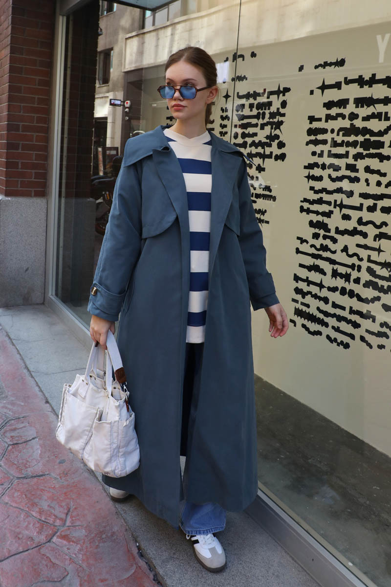 Geniş Yaka Trençkot Lacivert