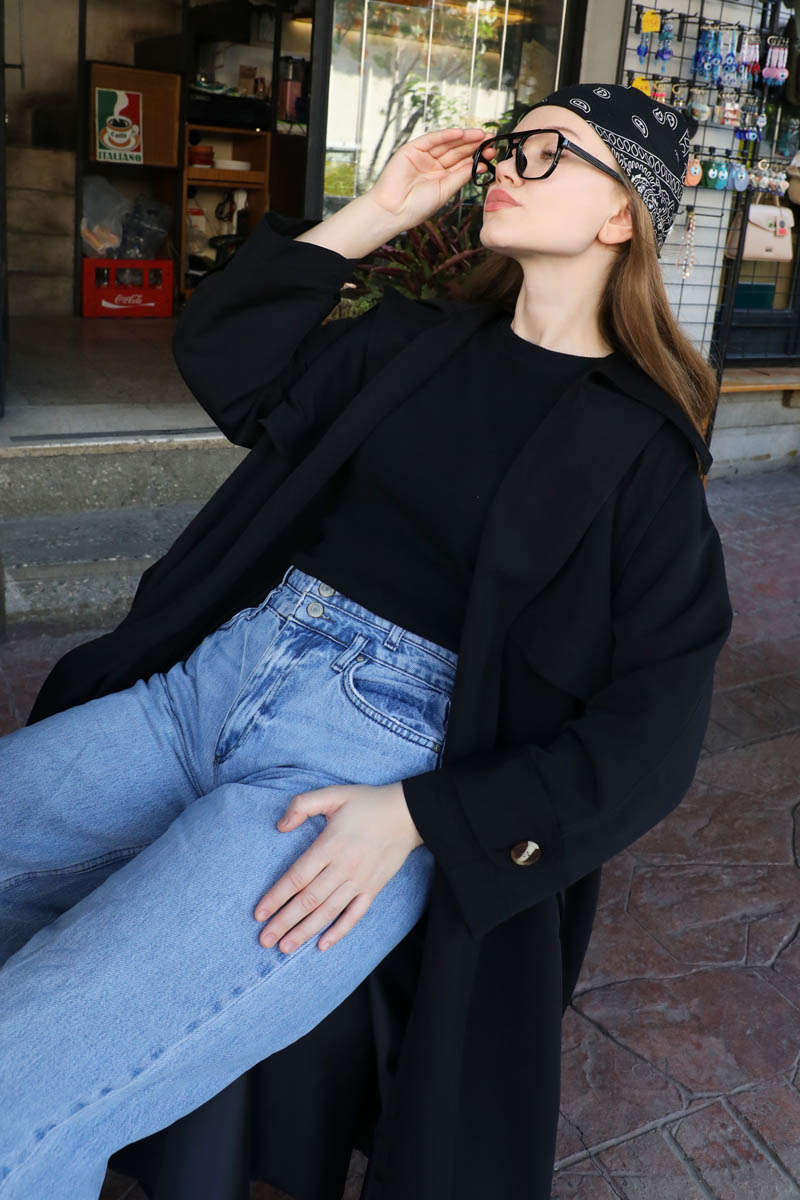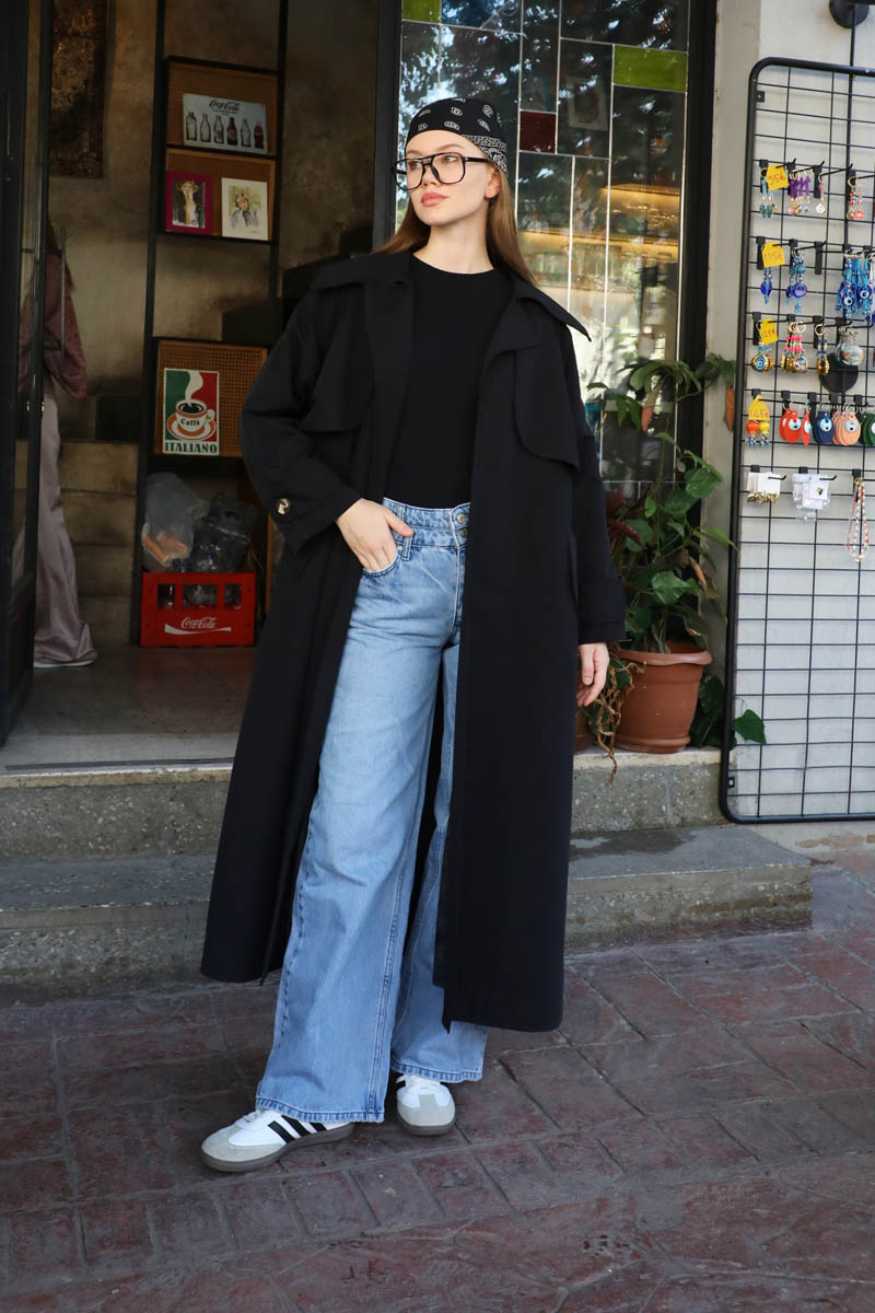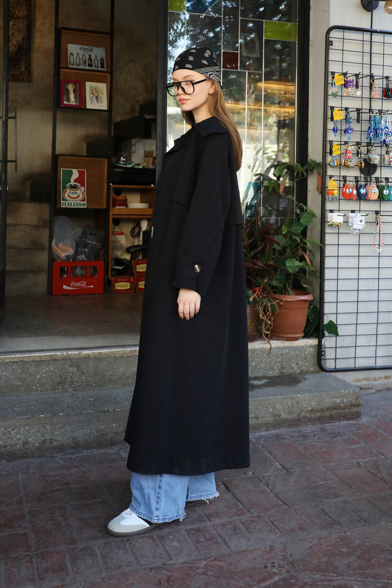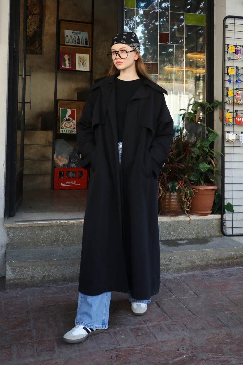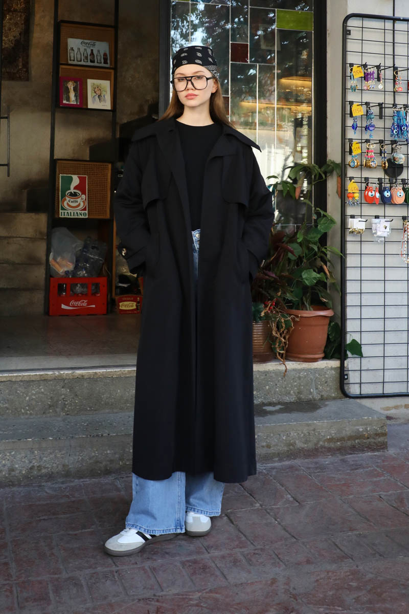 Geniş Yaka Trençkot Siyah