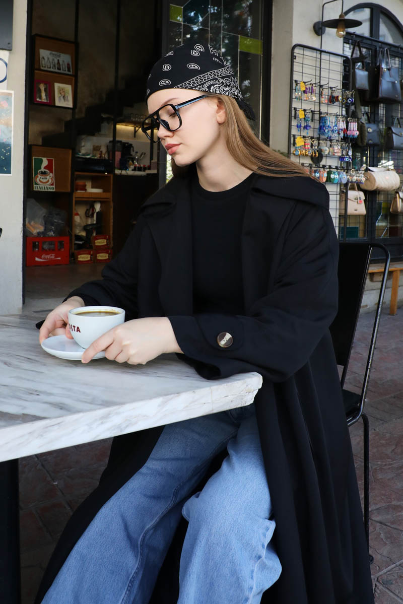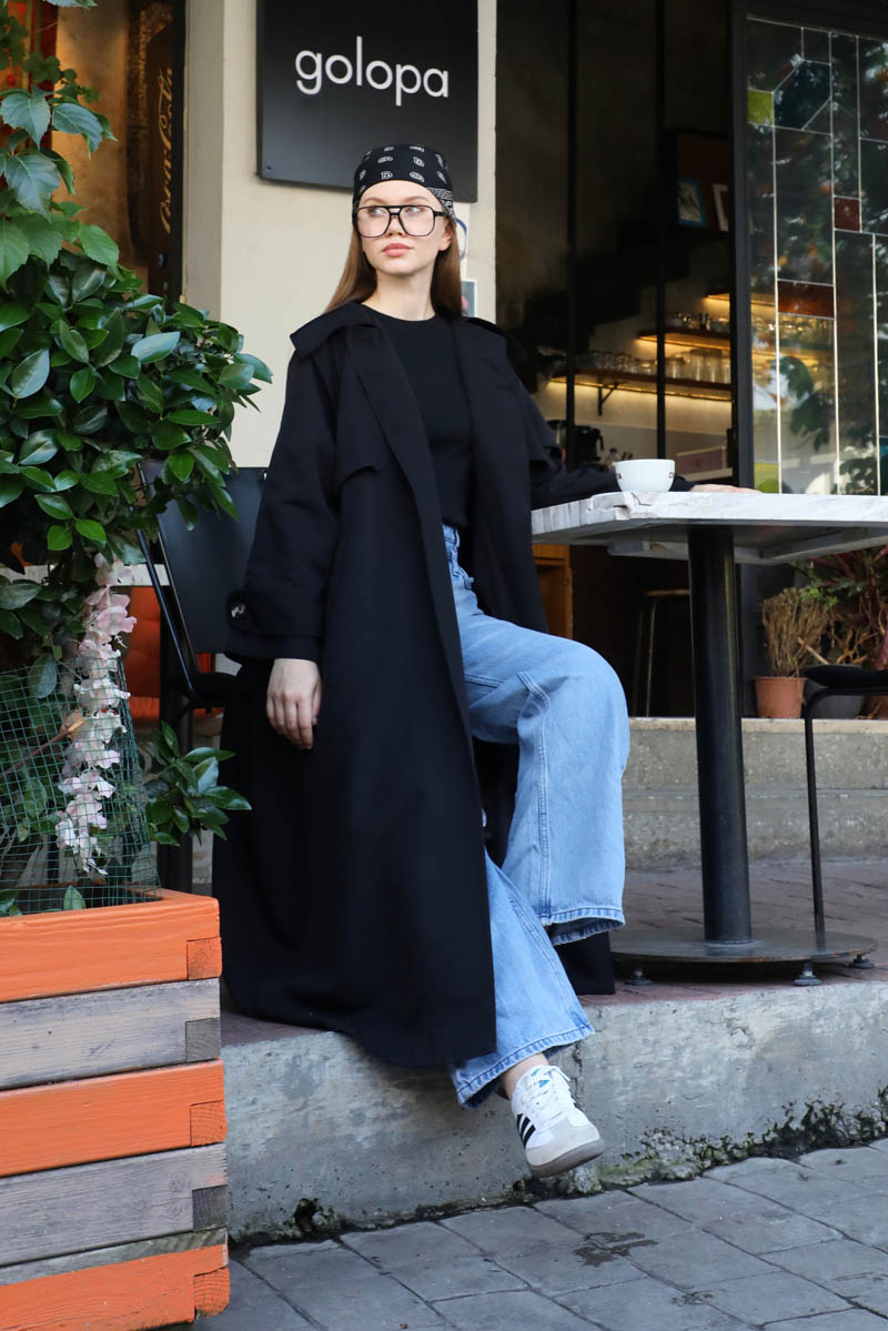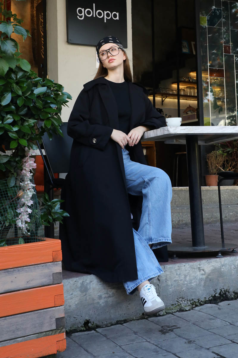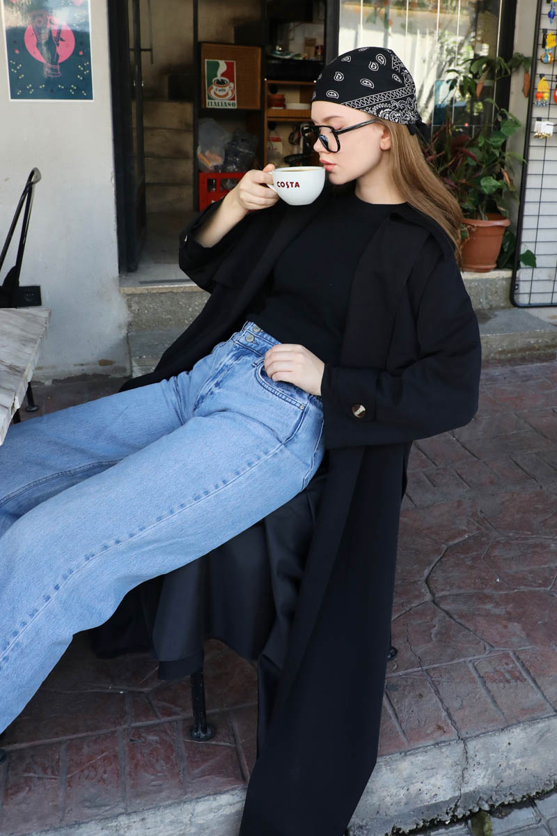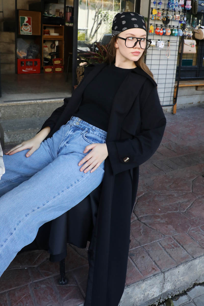 Geniş Yaka Trençkot Siyah