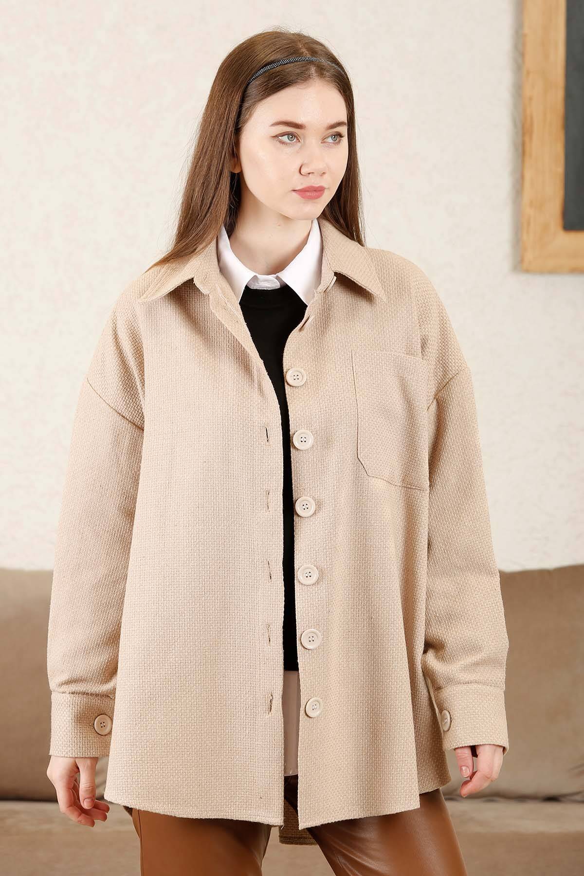 Collared, buttoned, oversized, plain, beige color. Checkered pattern The fabric is thick, designed for winter.