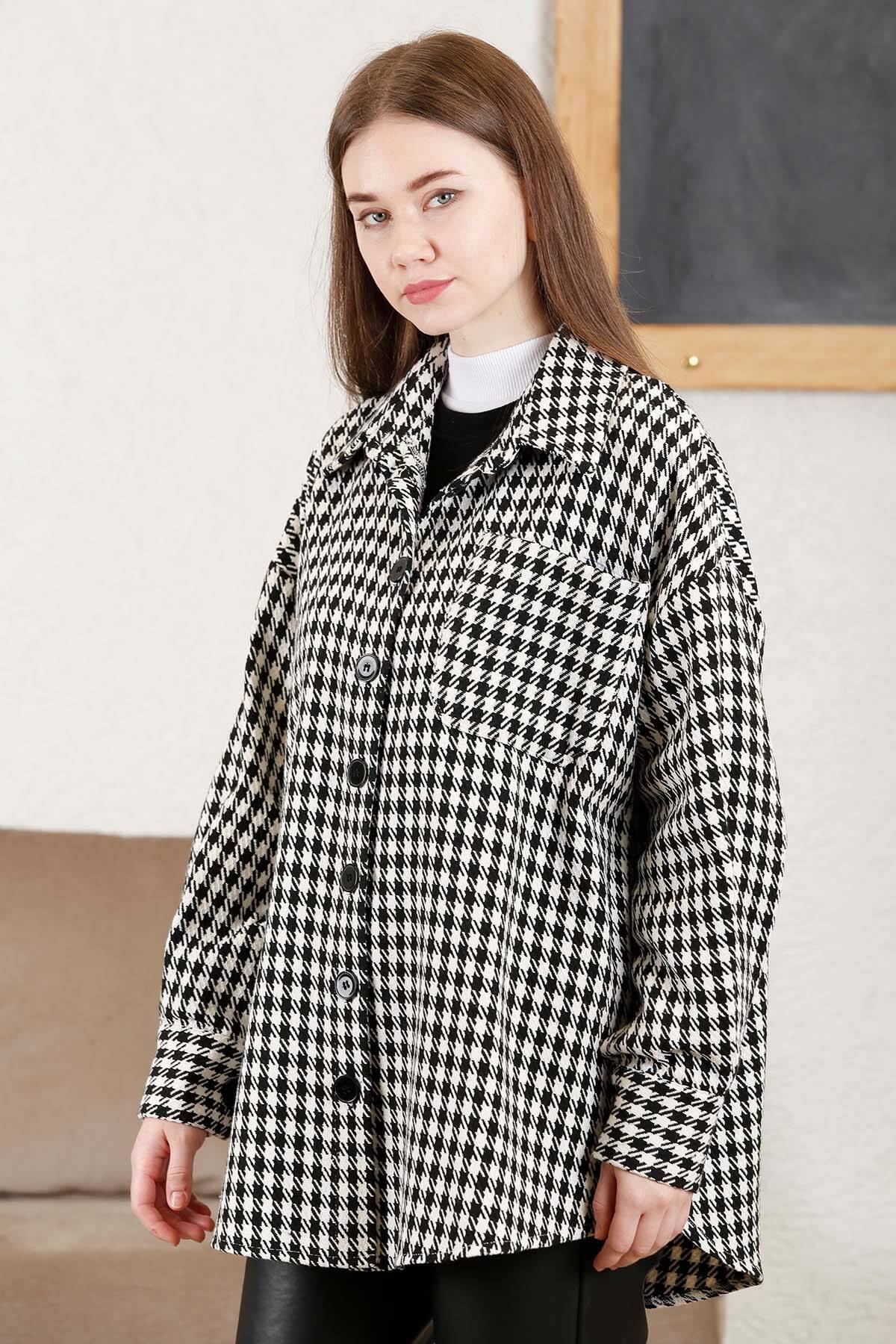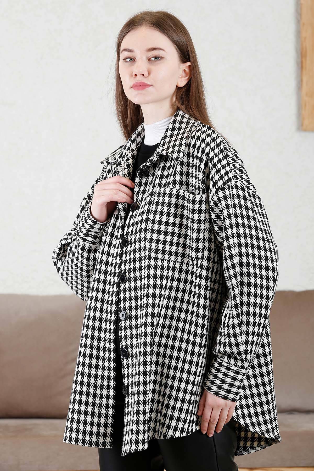 Collared, buttoned, oversized, plain, beige color. Checkered pattern The fabric is thick, designed for winter.