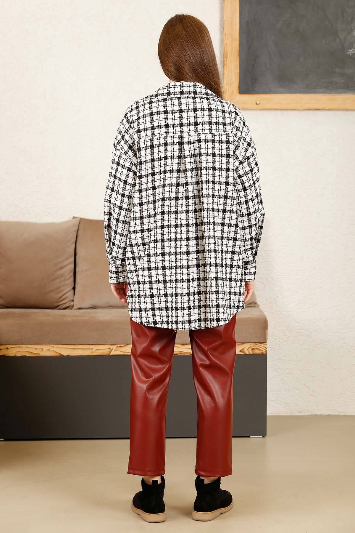 Collared, buttoned, oversized, plain, beige color. Checkered pattern The fabric is thick, designed for winter.