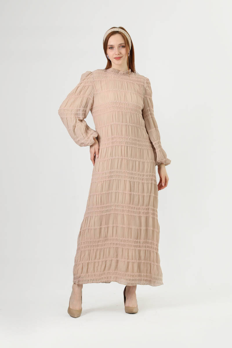 Gipeil chiffon dress, sleeve ends with elastic details. It has a zipper detail at the back and is easy to wear. It is useful with its vertical collar model. The fabric is chiffon and has a wrinkle-resistant and breathable feature thanks to its flexible structure. It is suitable for frequent and long-term use with its non-weight fabric feature. This dress, which you can use in daily life and on special occasions, has four seasons of use.