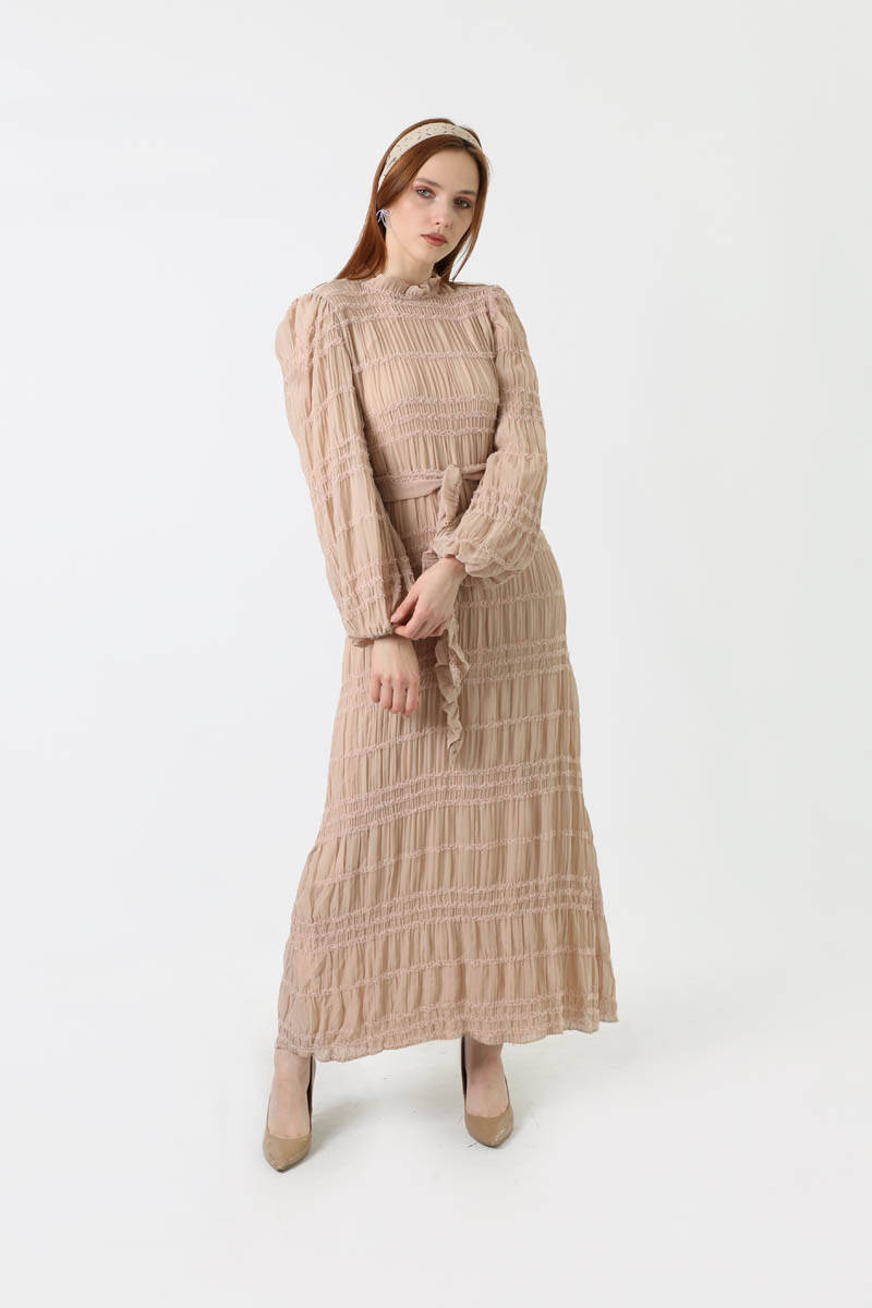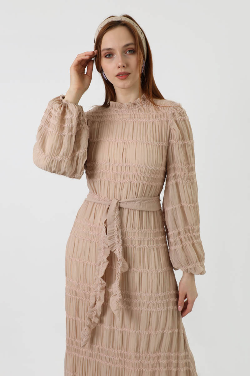 Gipeli şifon elbise, kol uçları lastik detaylıdır. Arkadan fermuar detayı olup kolay giyime sahiptir.Dik yaka modeli ile kullanışlıdır. Kumaşı şifon olup esnek yapısı sayesinde kırışmaya dayanıklı ve nefes alıcı özelliğe sahiptir. Ağırlık yapmayan kumaş özelliği ile sık ve uzun süreli kullanıma uygundur. Günlük hayatta ve özel günlerinizde kullanabileceğiniz bu elbise dört mevsim kullanıma sahiptir.