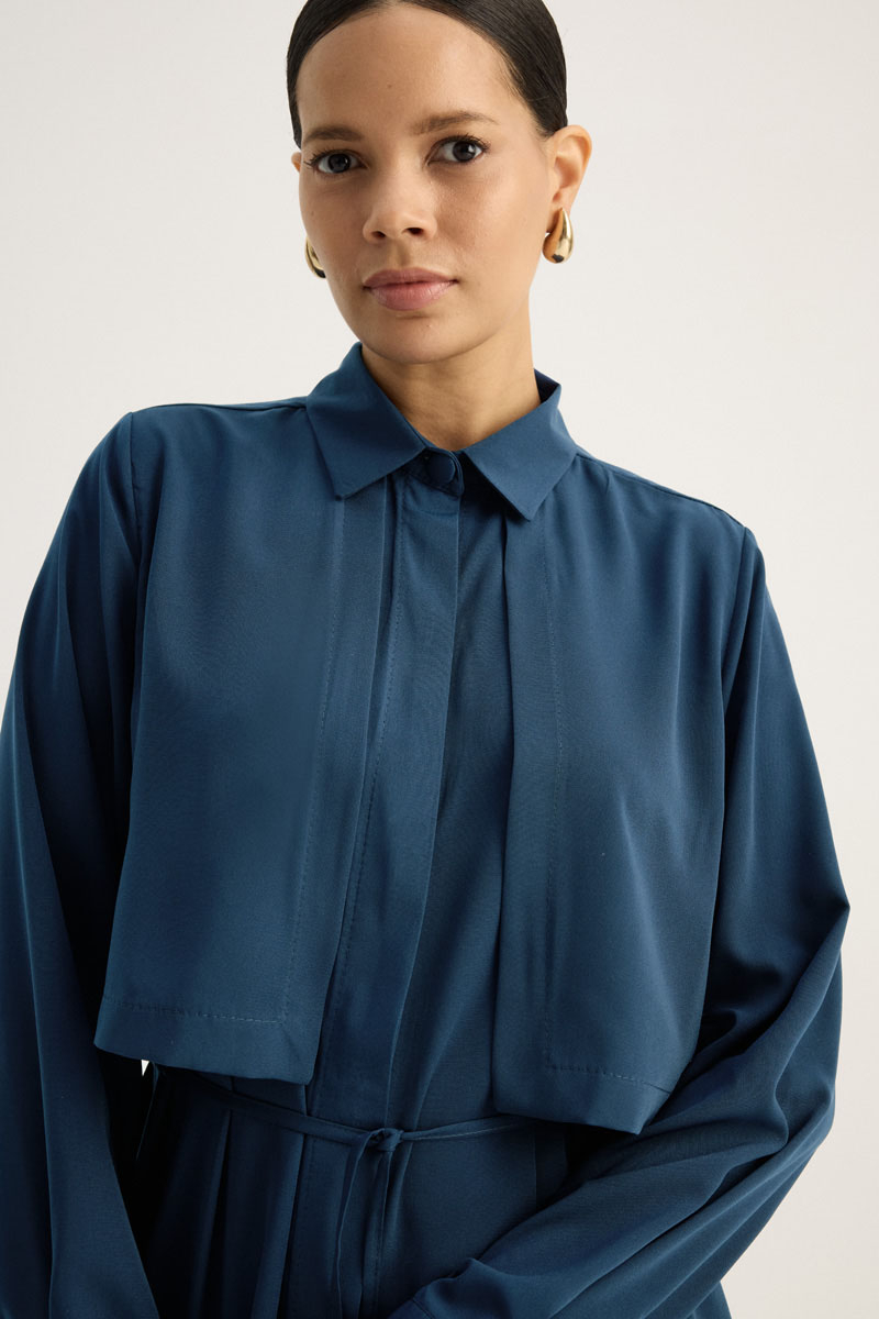 Medine İpeği Elbise İndigo. Gömlek yakalıdır. Gizli düğmelidir. Rüzgarlık detaylıdır. Yandan ceplidir. İnce kuşaklıdır. Günlük kullanım ve özel günlerinizde tercih edebilirsiniz.