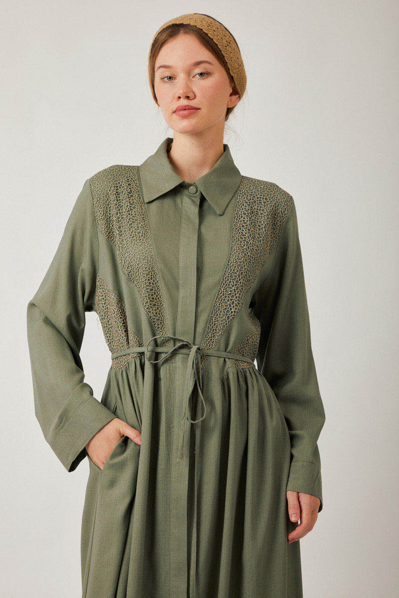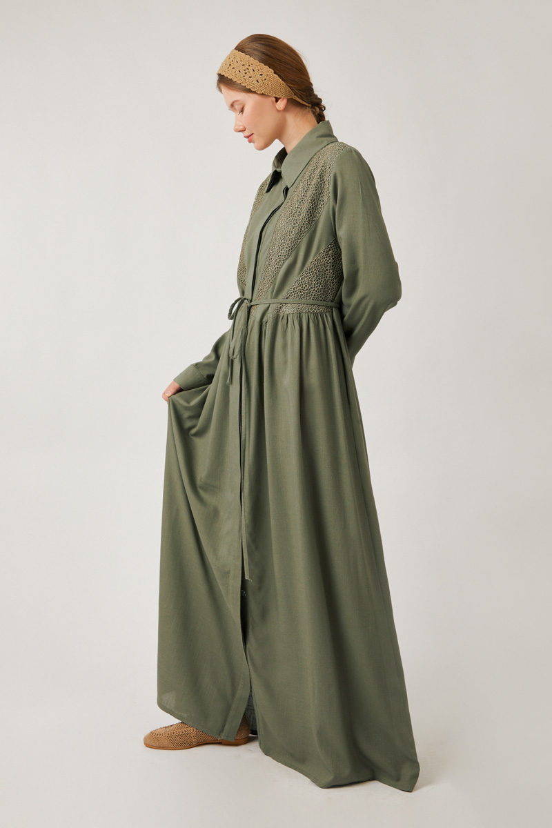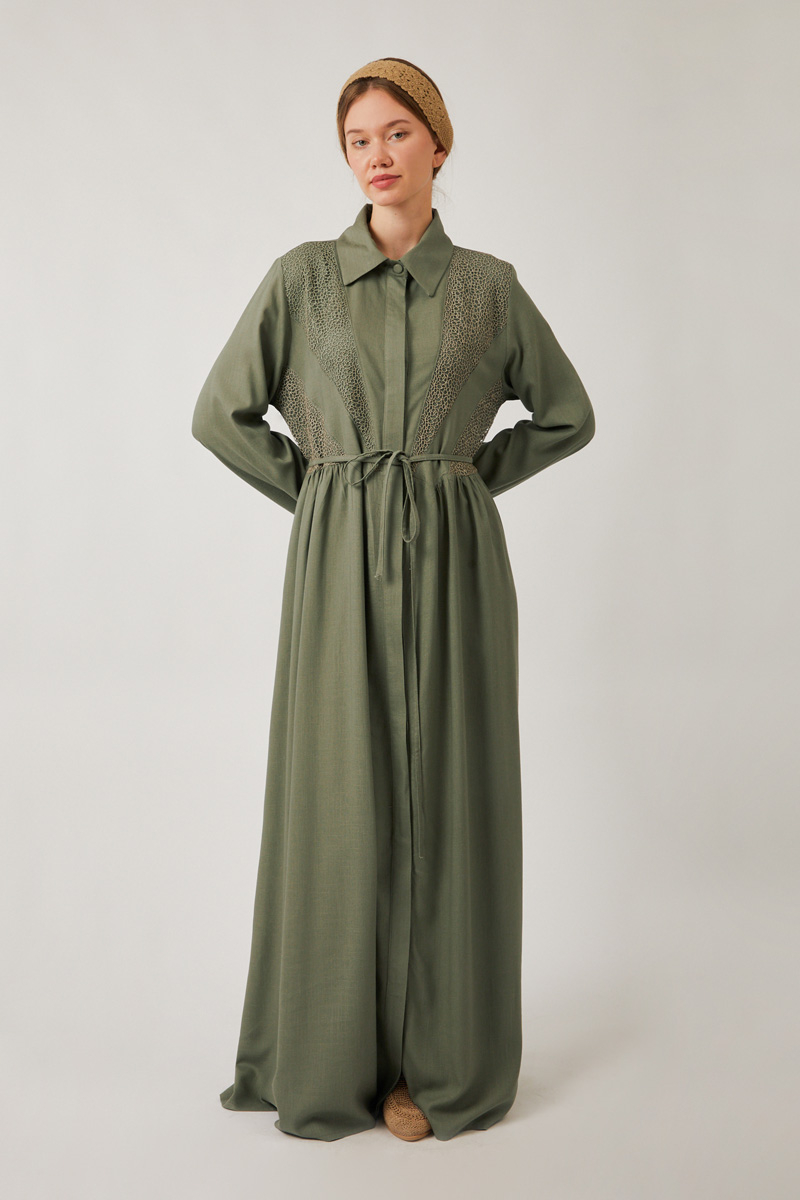 Gizli Düğmeli Dantelli Elbise Haki, maksi boy bir elbisedir. Gömlek yaka ve önden düğmeli tasarımıyla şık ve rahattır. Göğüs ve kol kısımlarında el işi nakış veya dokuma süslemeleri bulunur. Belindeki kumaş kemerle vücuda oturur ve uzun, bol kolları zarif bir duruş sağlar. Doğal kumaşı sayesinde bahar ve yaz ayları için idealdir. Hem günlük hem de özel davetlerde kullanıma uygundur.