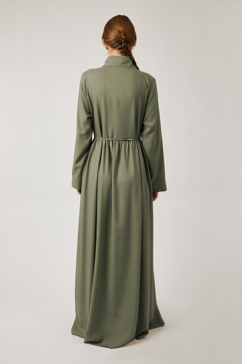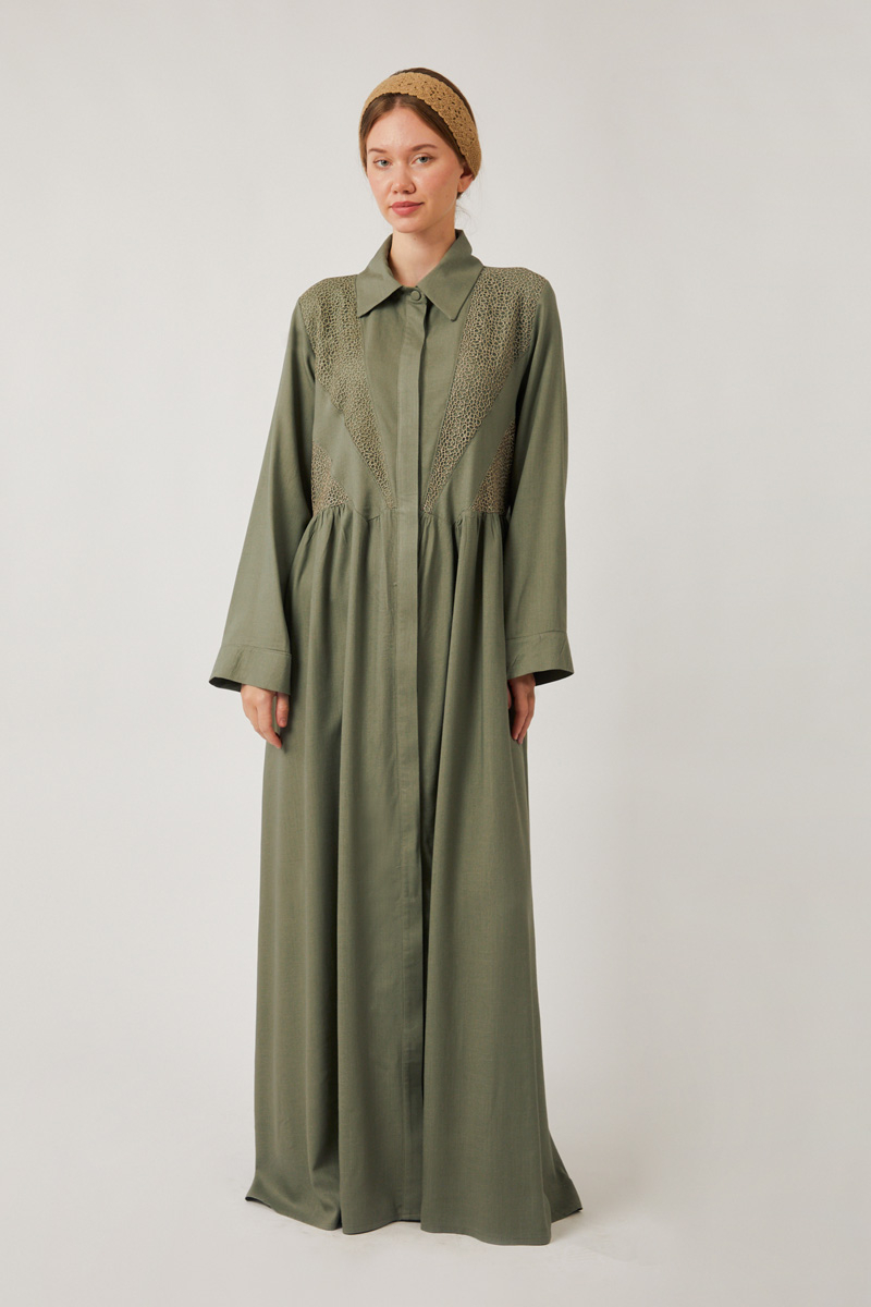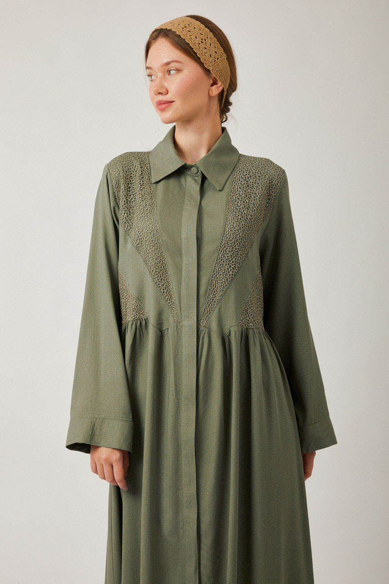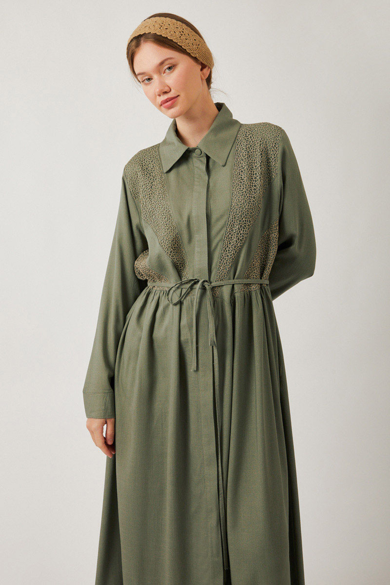 Gizli Düğmeli Dantelli Elbise Haki, maksi boy bir elbisedir. Gömlek yaka ve önden düğmeli tasarımıyla şık ve rahattır. Göğüs ve kol kısımlarında el işi nakış veya dokuma süslemeleri bulunur. Belindeki kumaş kemerle vücuda oturur ve uzun, bol kolları zarif bir duruş sağlar. Doğal kumaşı sayesinde bahar ve yaz ayları için idealdir. Hem günlük hem de özel davetlerde kullanıma uygundur.