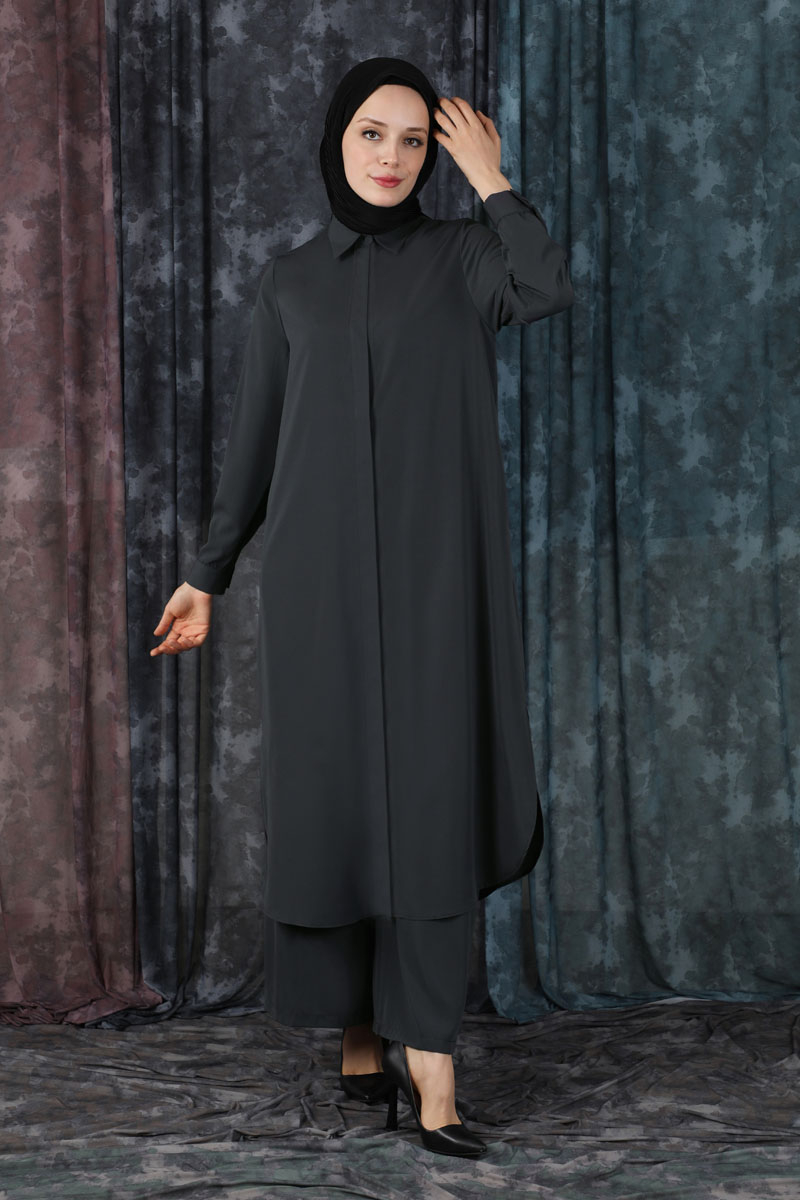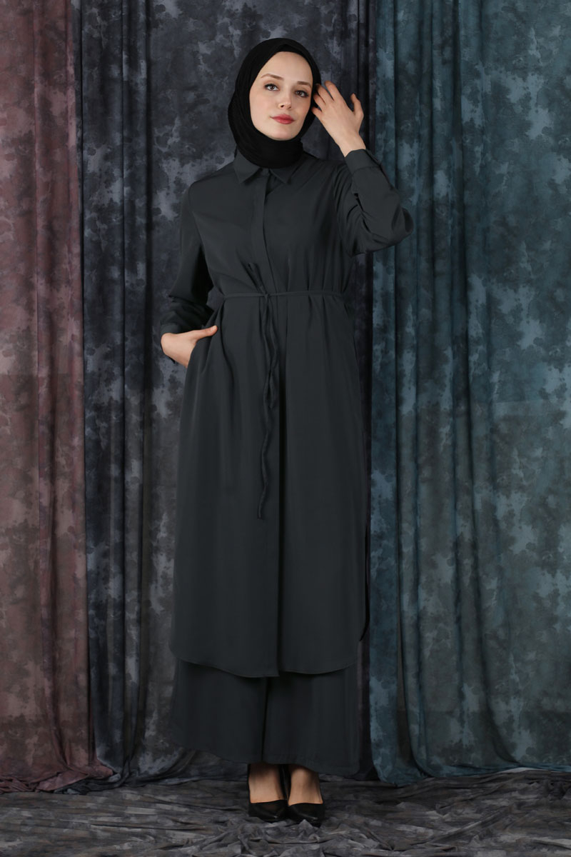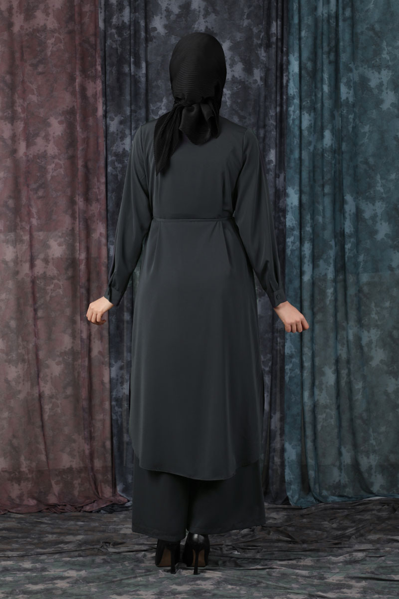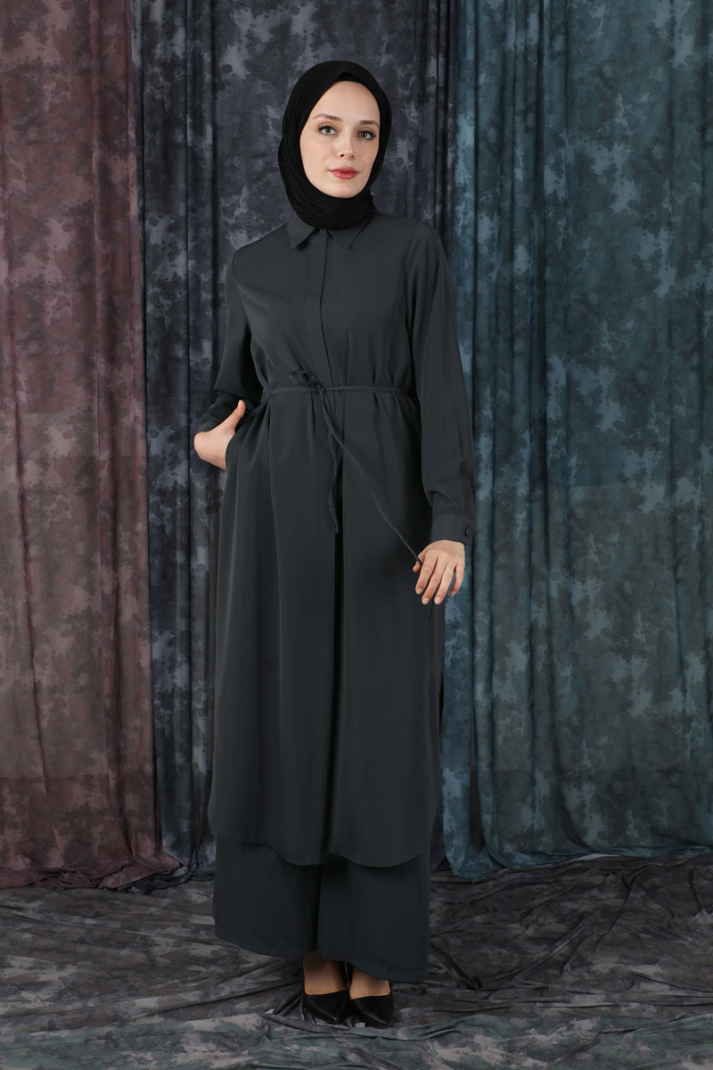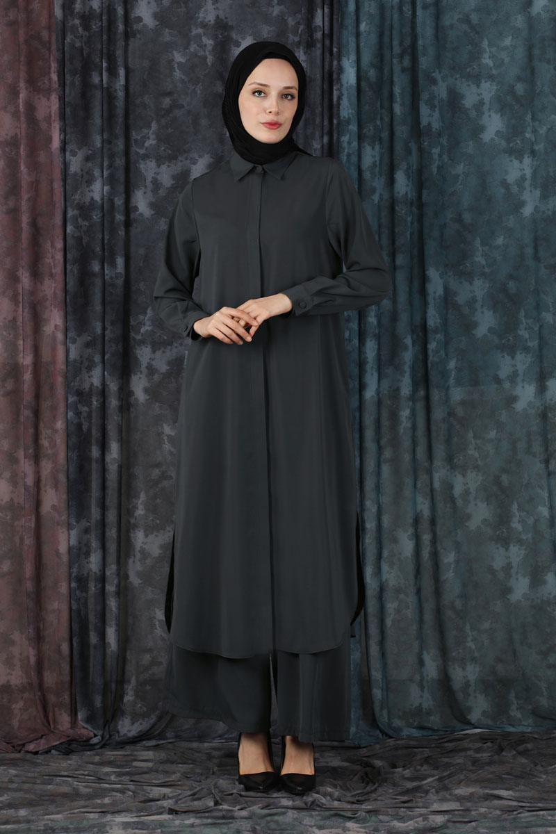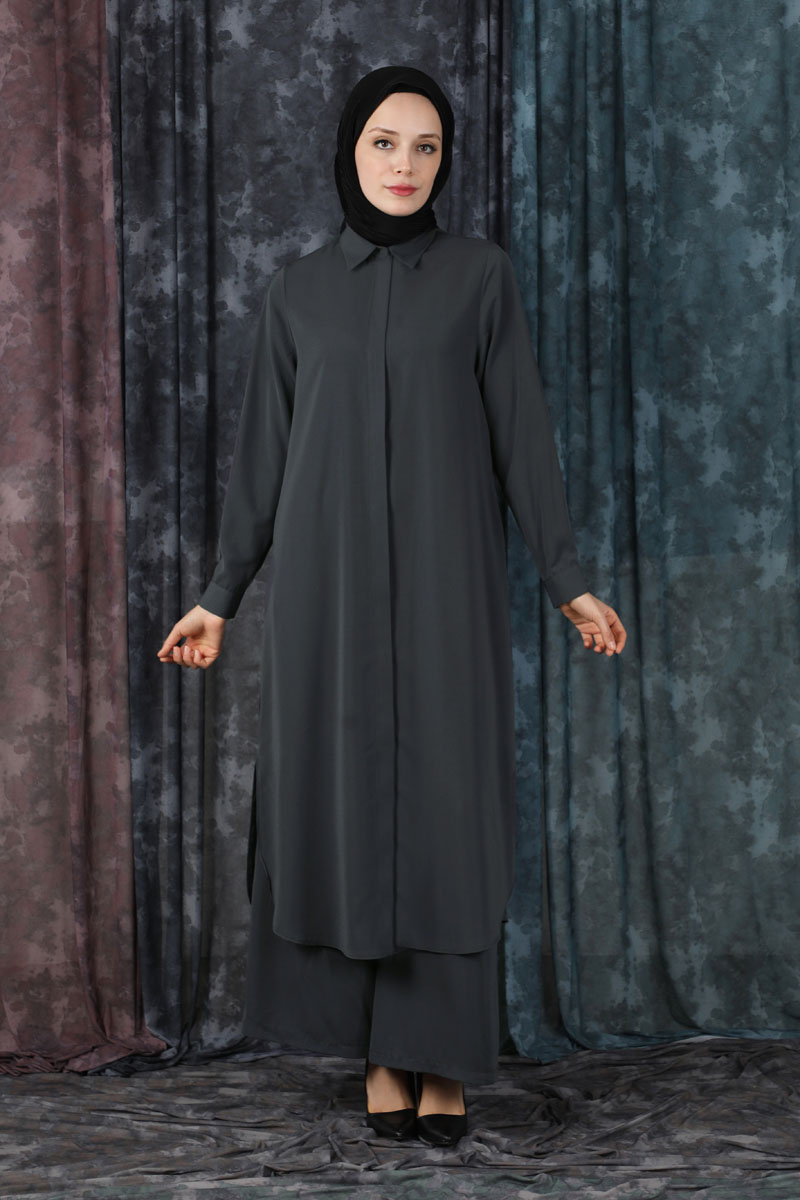 Medine İpeği Tunik Takım Antrasit. Gizli düğmelidir. Yandan ceplidir. Yandan yırtmaç detaylıdır. Manşeti düğmelidir. Pantolon beli lastiklidir. Yandan ceplidir. Beli ince biyelidir. Günlük kullanım ve özel günlerinizde tercih edebilirsiniz.