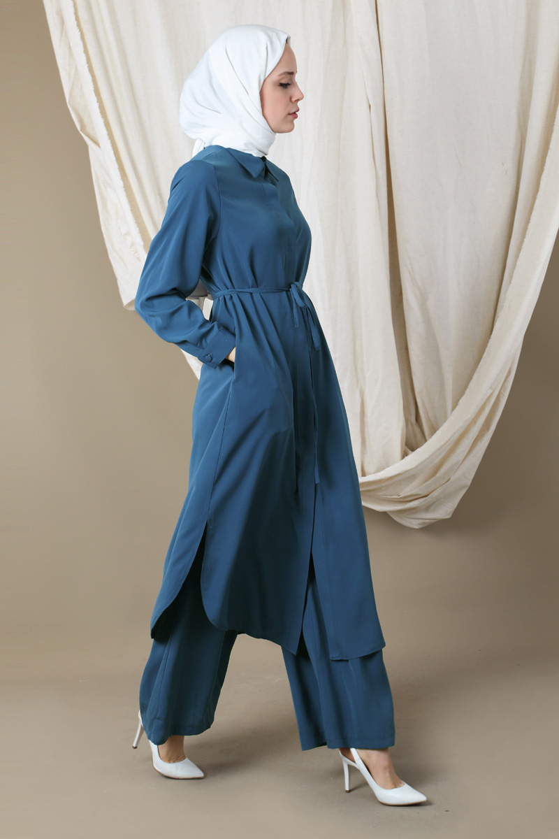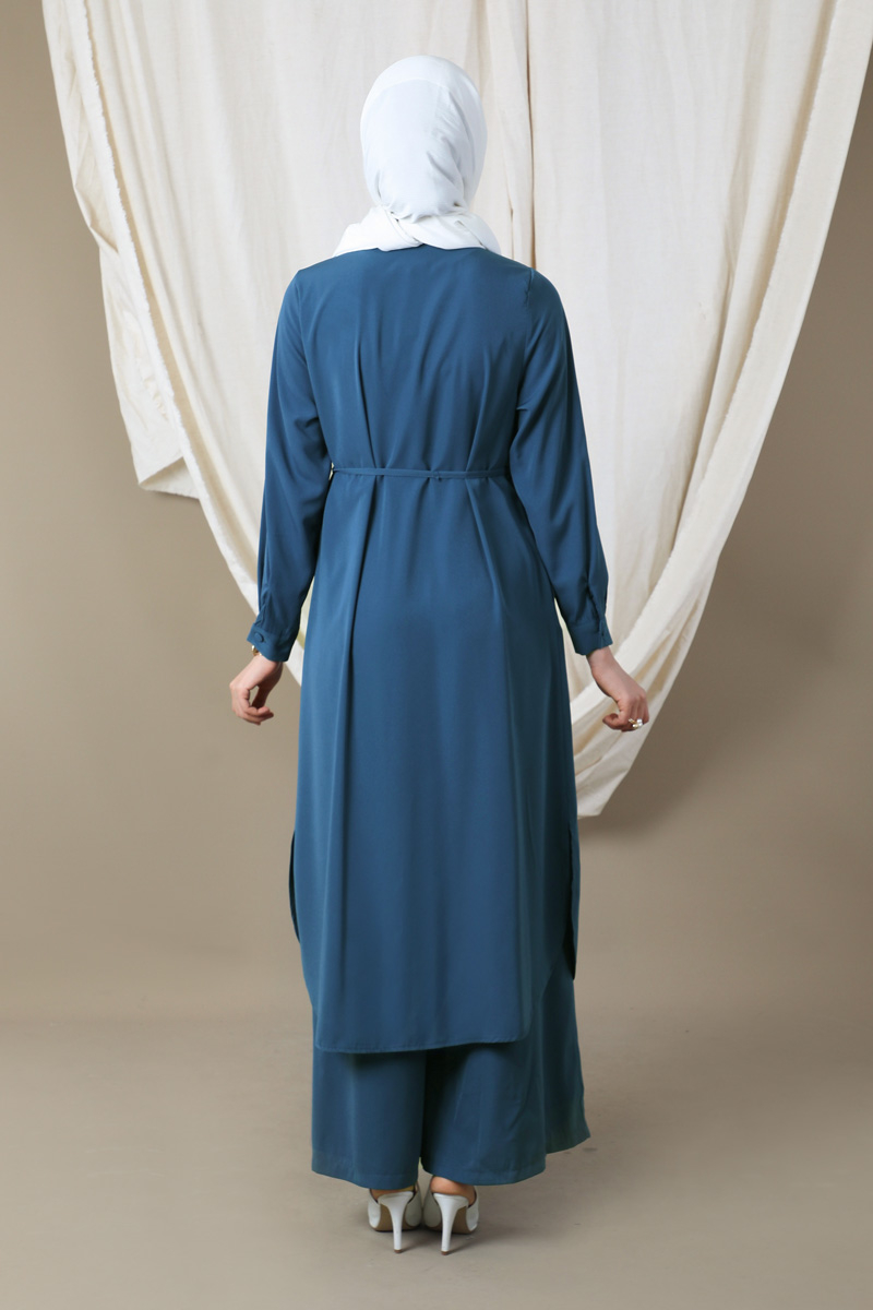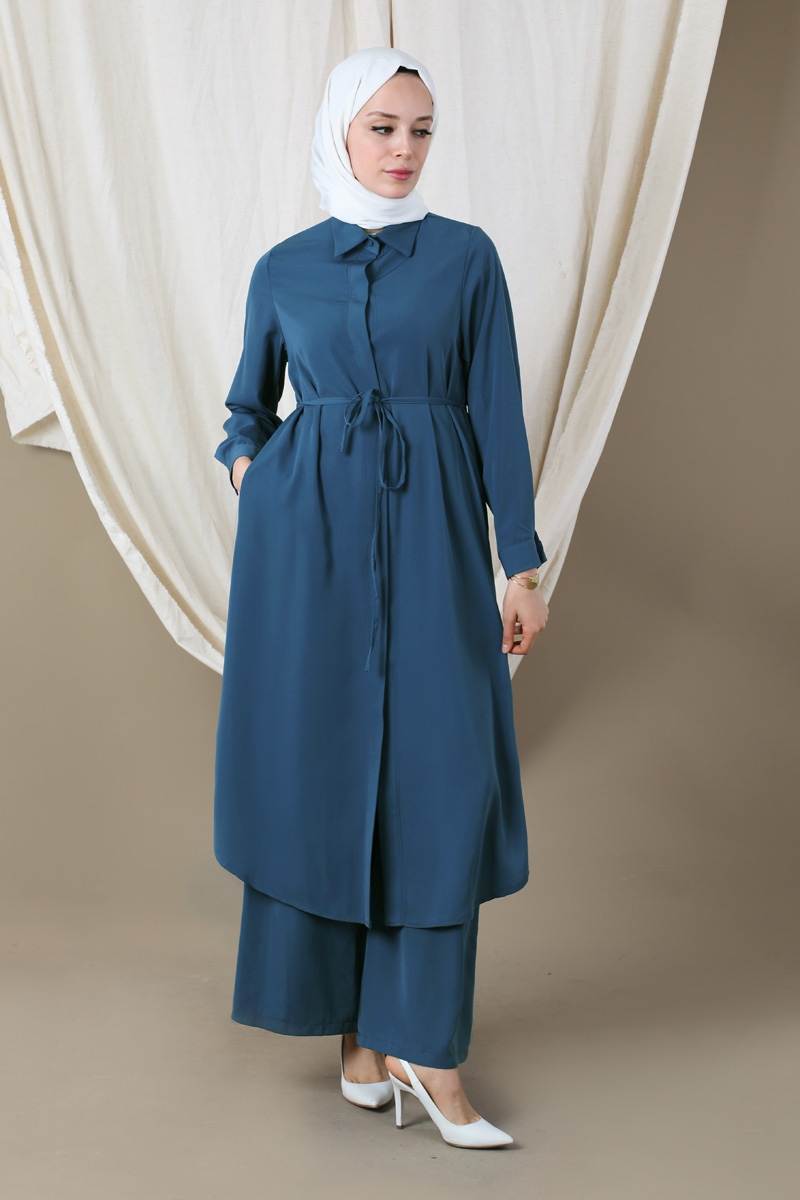 Medine İpeği Tunik Takım Lacivert. Gizli düğmelidir. Yandan ceplidir. Yandan yırtmaç detaylıdır. Manşeti düğmelidir. Pantolon beli lastiklidir. Yandan ceplidir. Beli ince biyelidir. Günlük kullanım ve özel günlerinizde tercih edebilirsiniz.